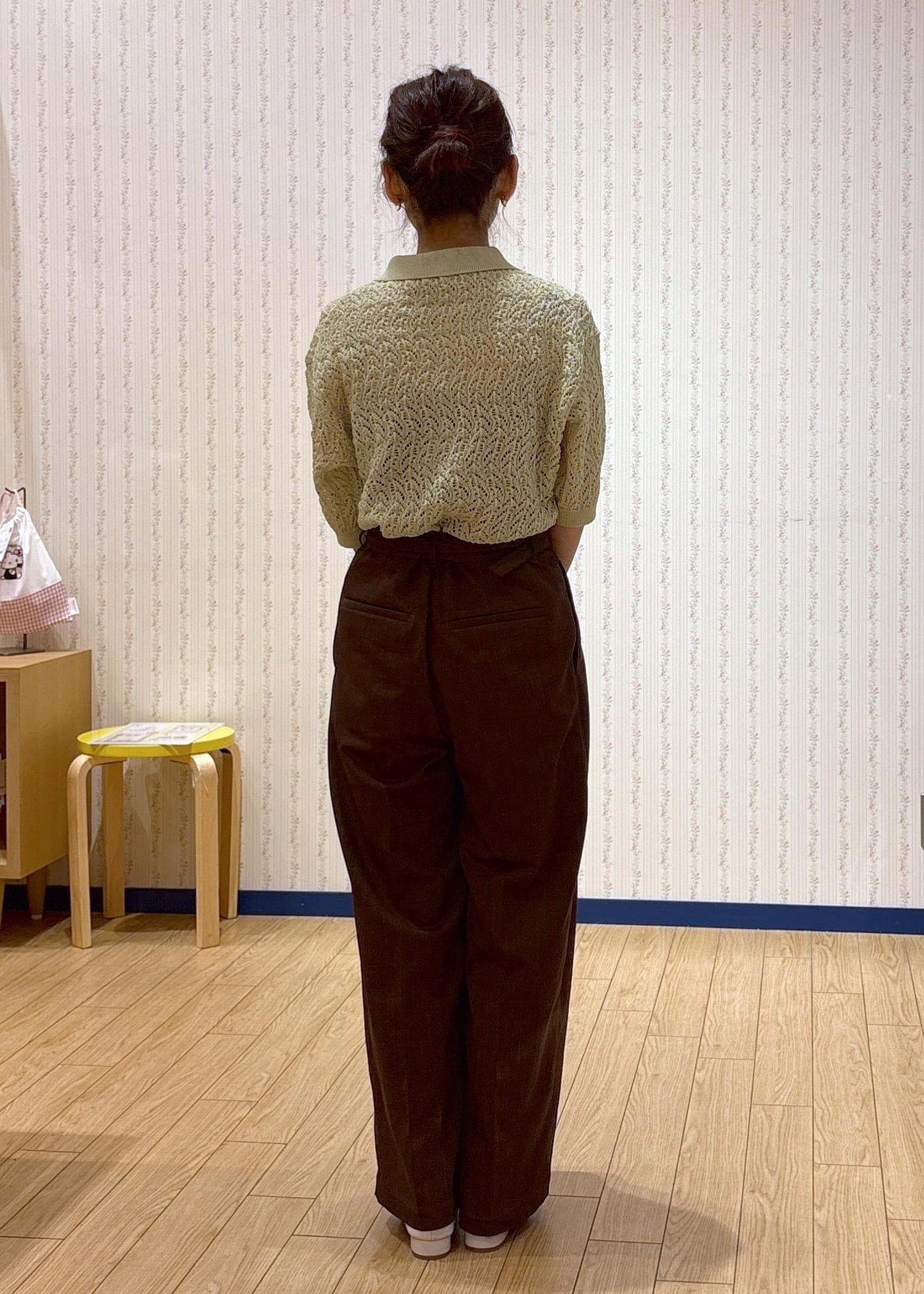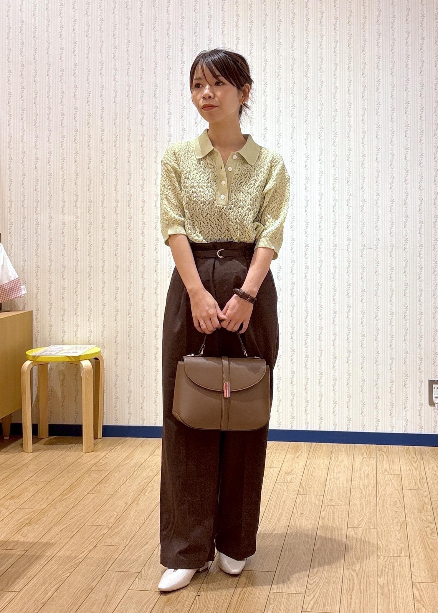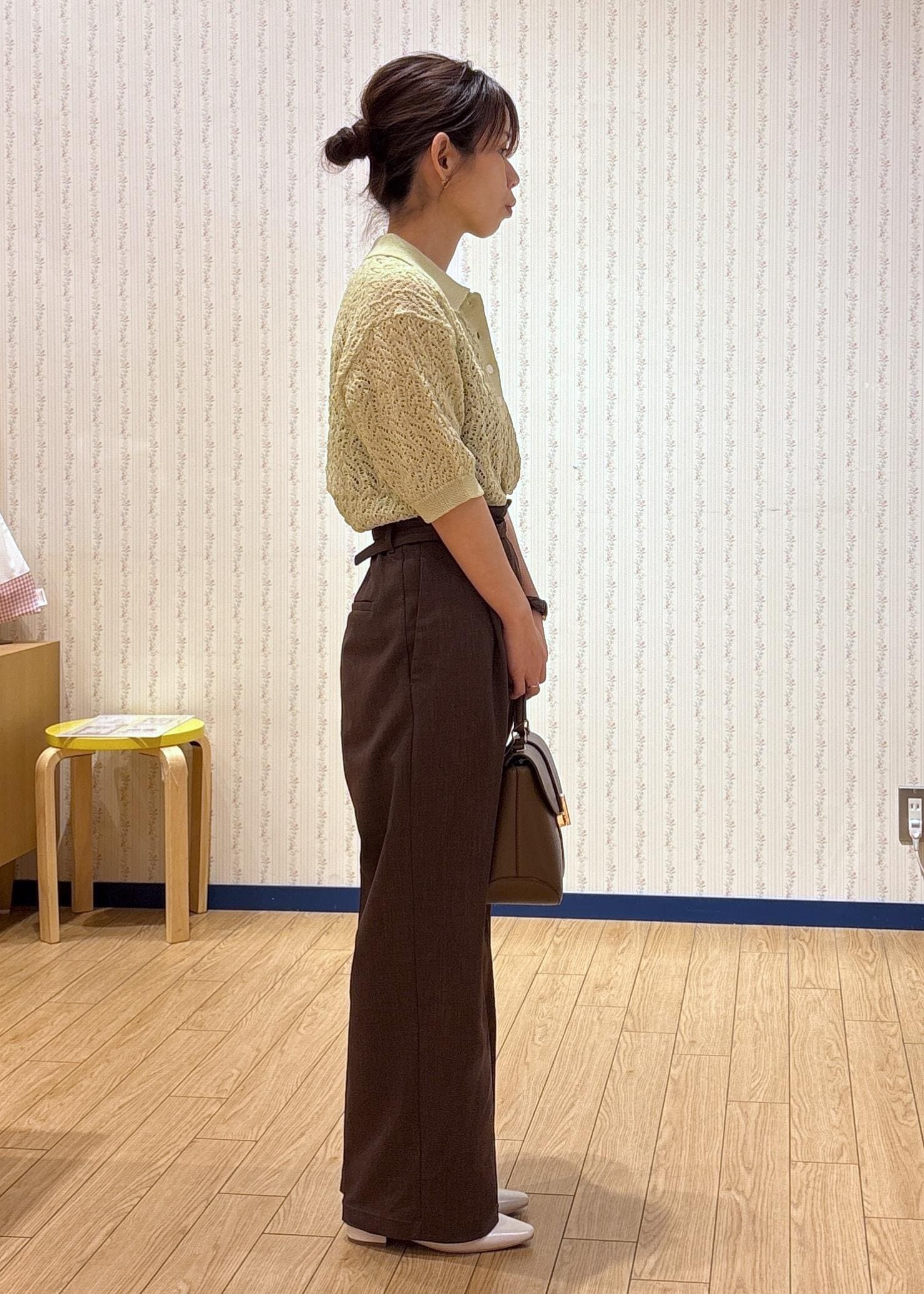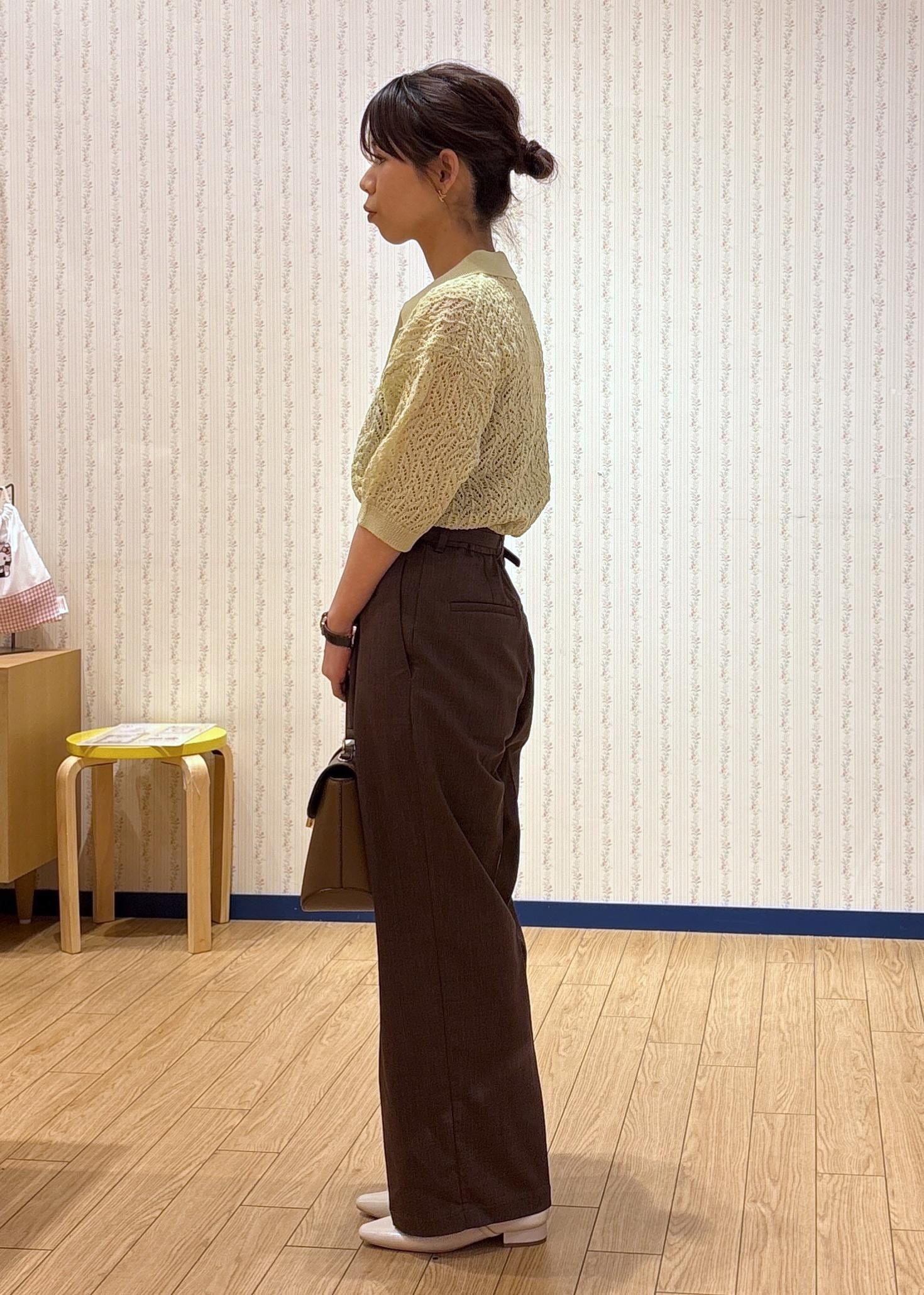 透かし編みポロニット×ワイドパンツ