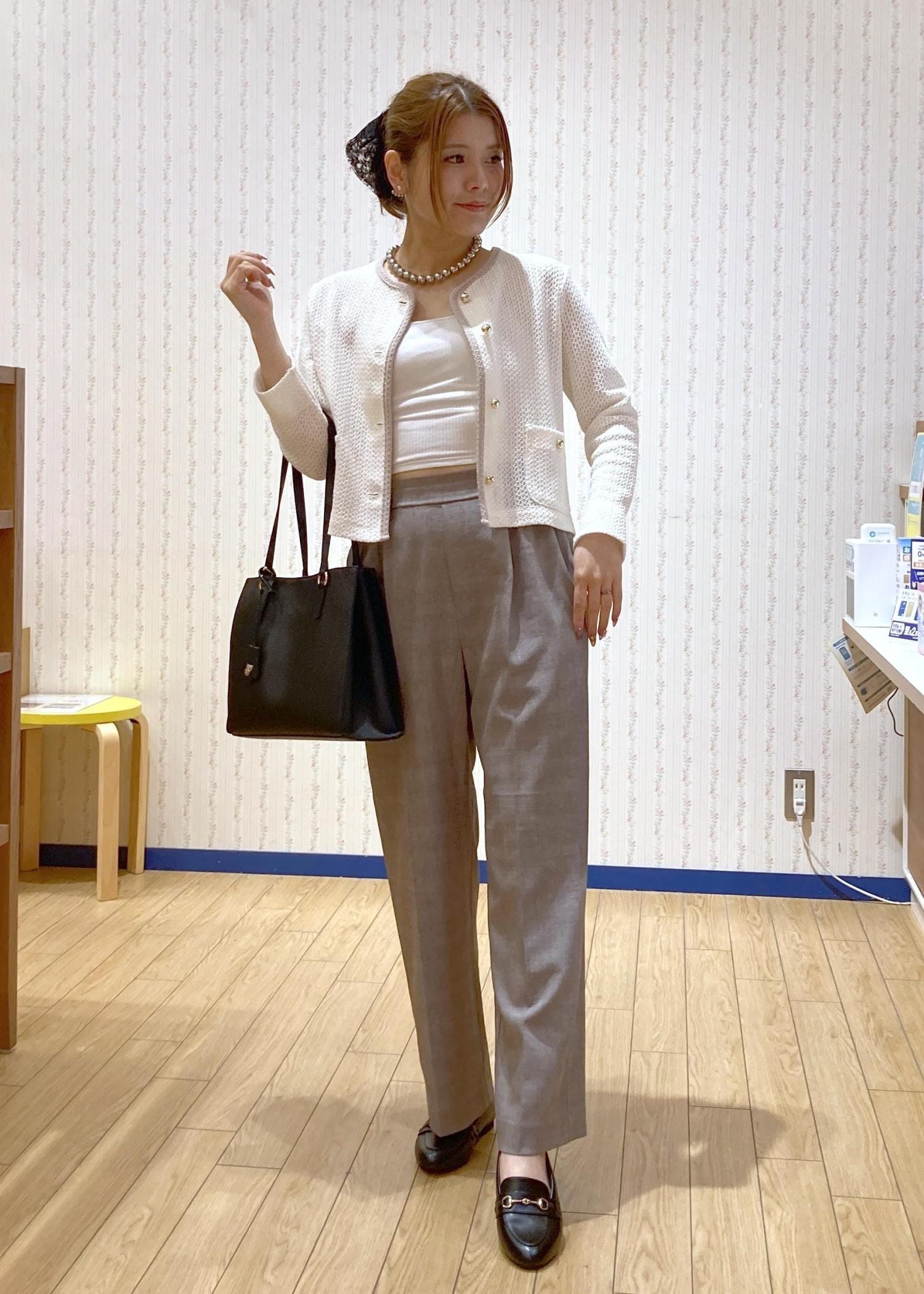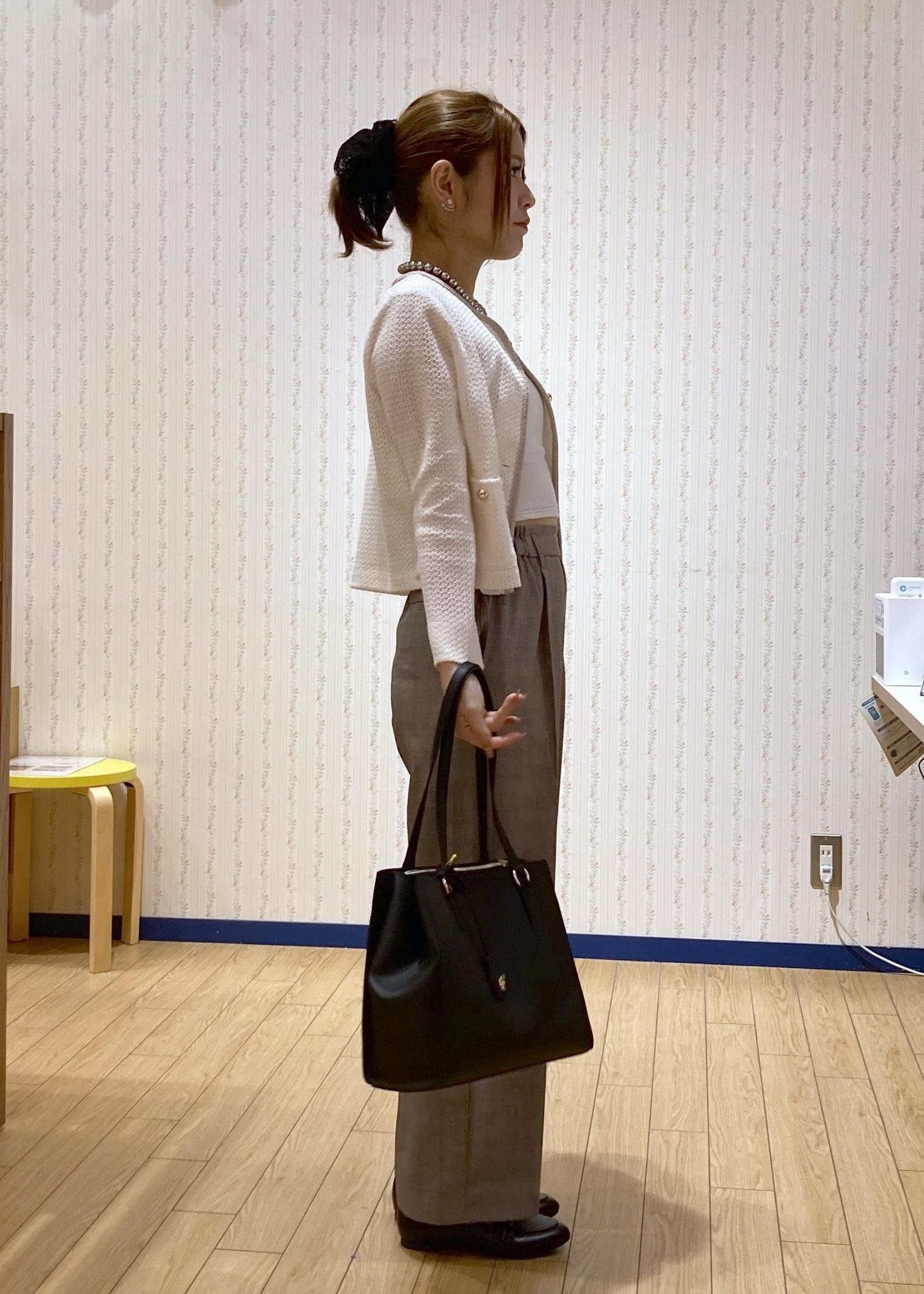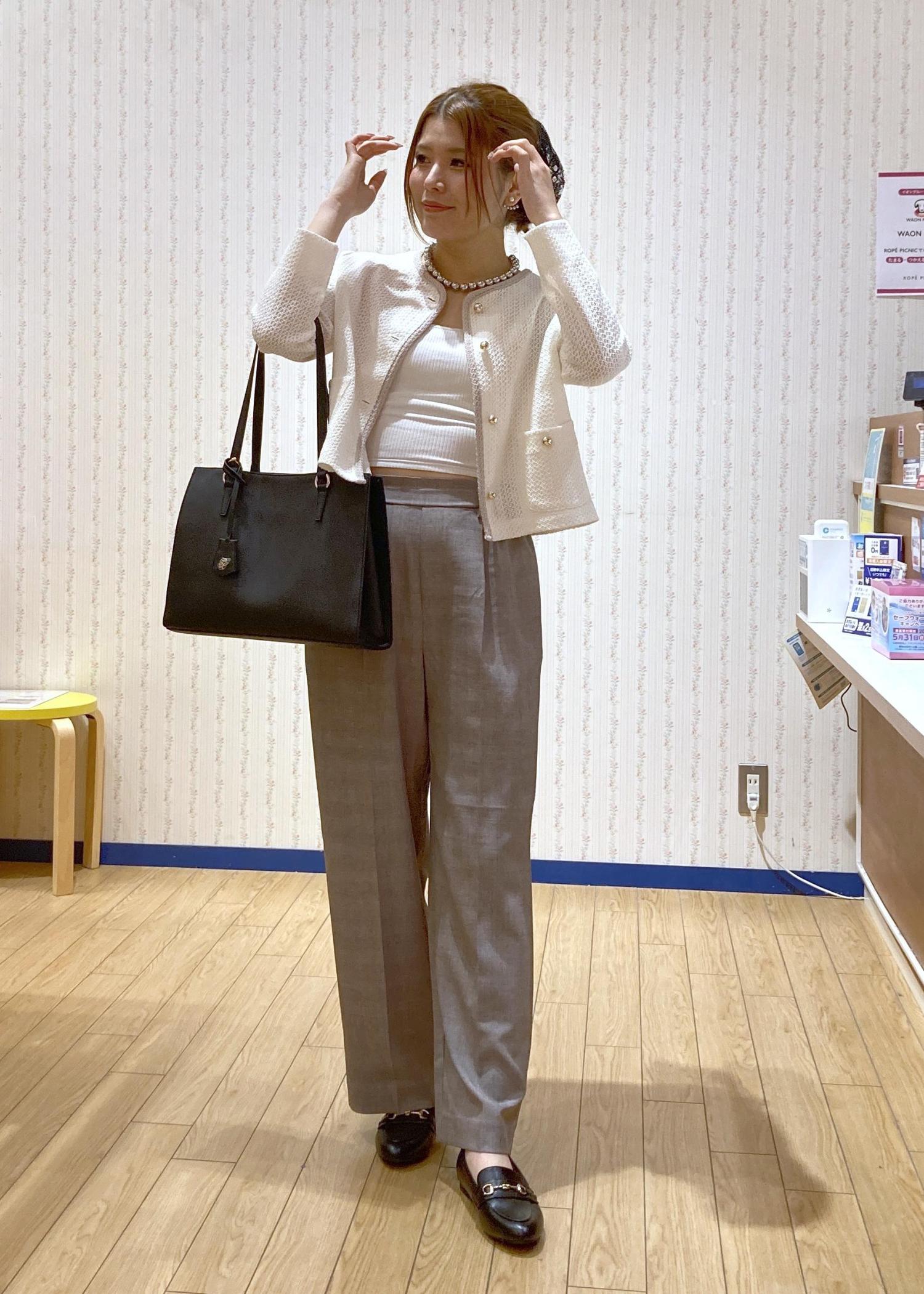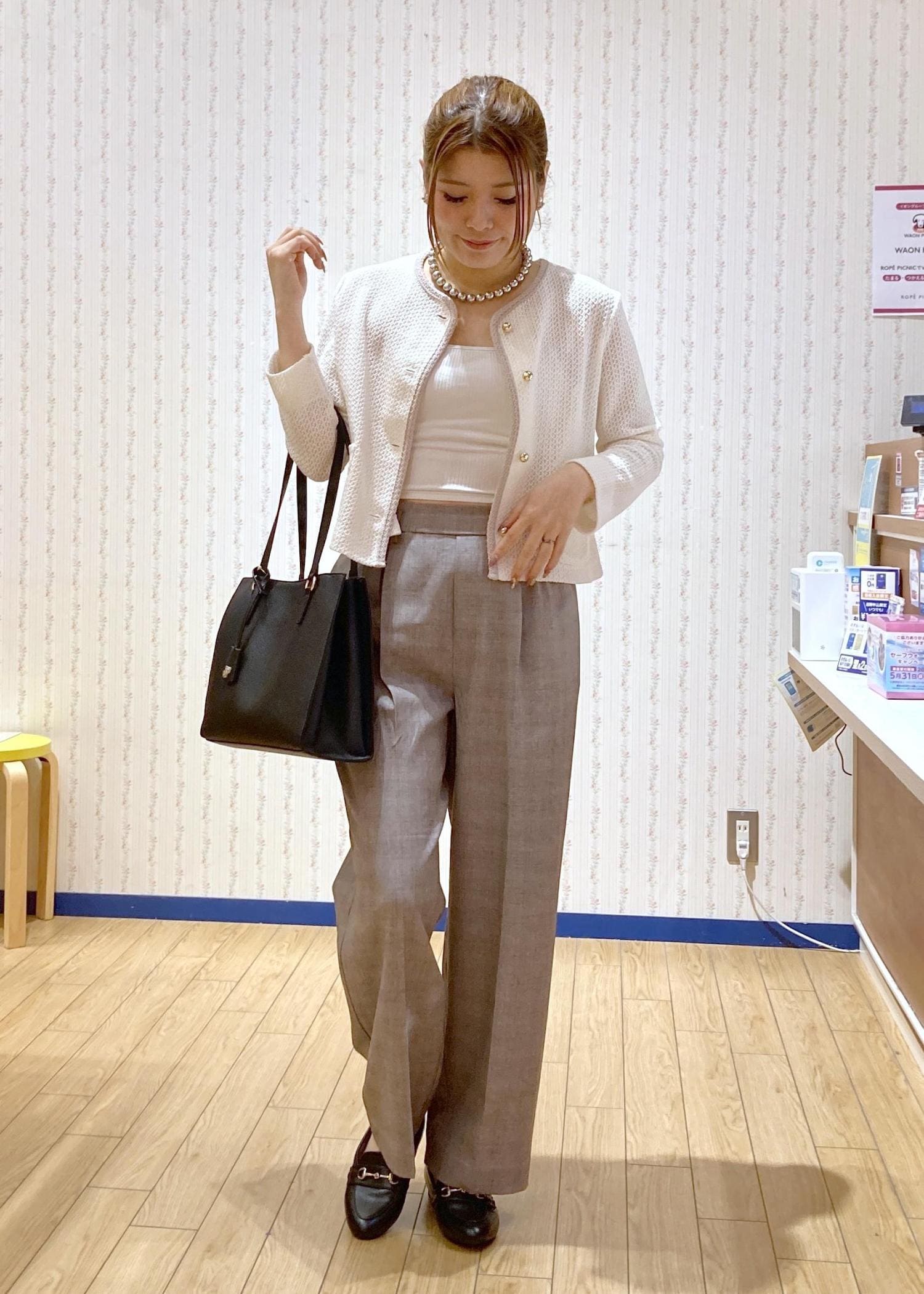 全体的に淡いトーンで統一したON/OFF兼用で使える綺麗めシンプルなコーディネートです。