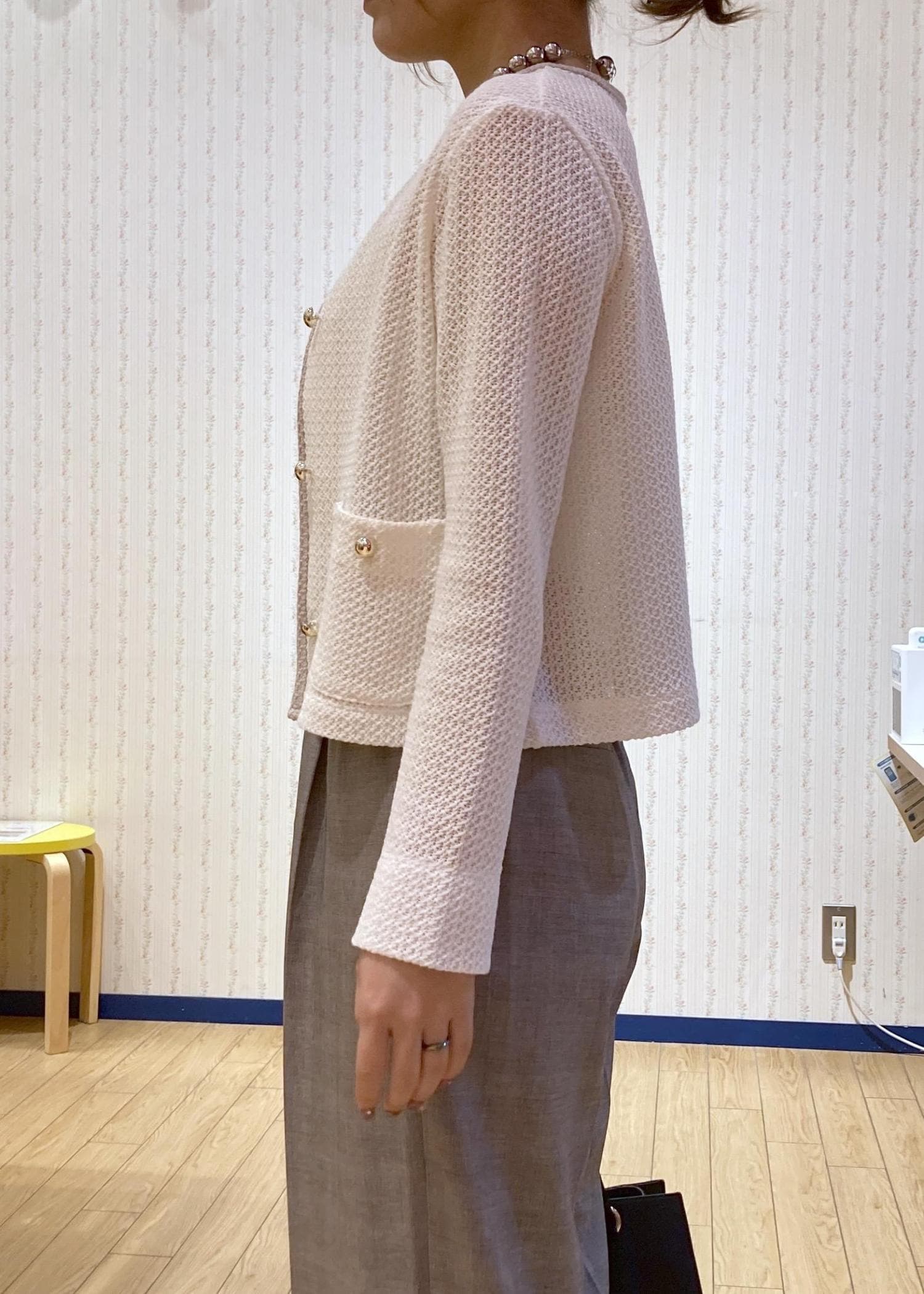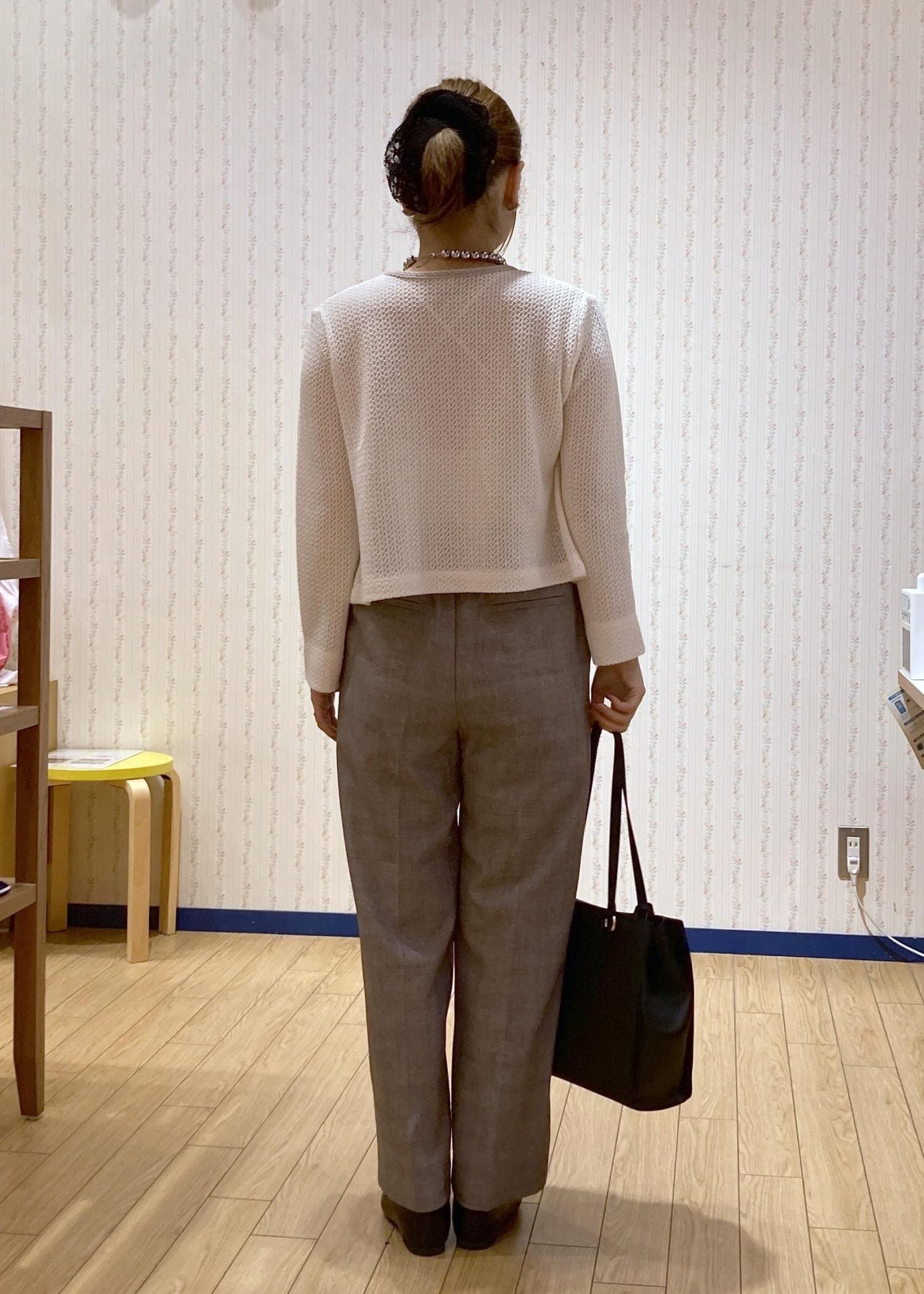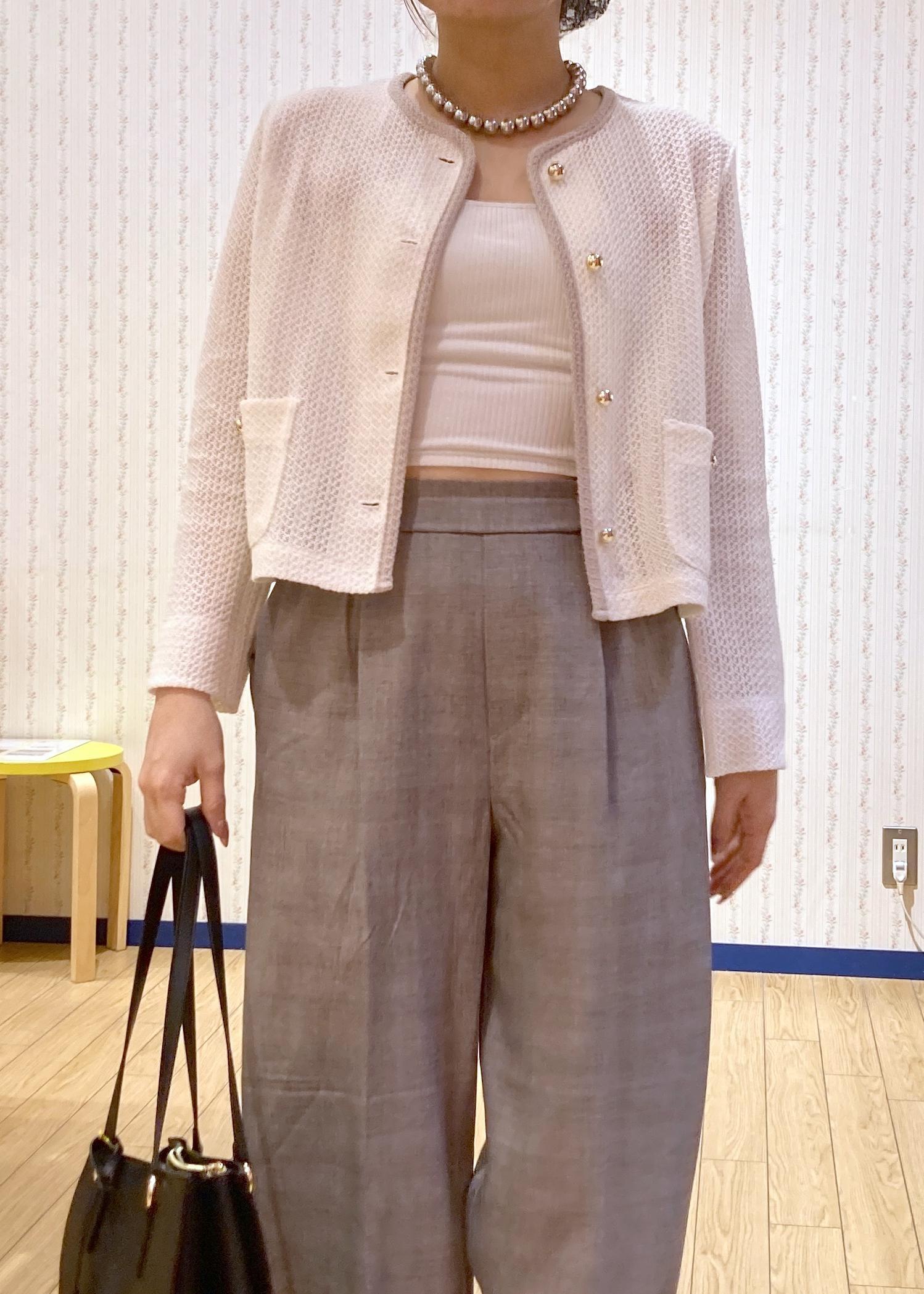 透かし編みのカーディガンで軽さをだし、髪の毛をアップにして縦のラインを意識しました!