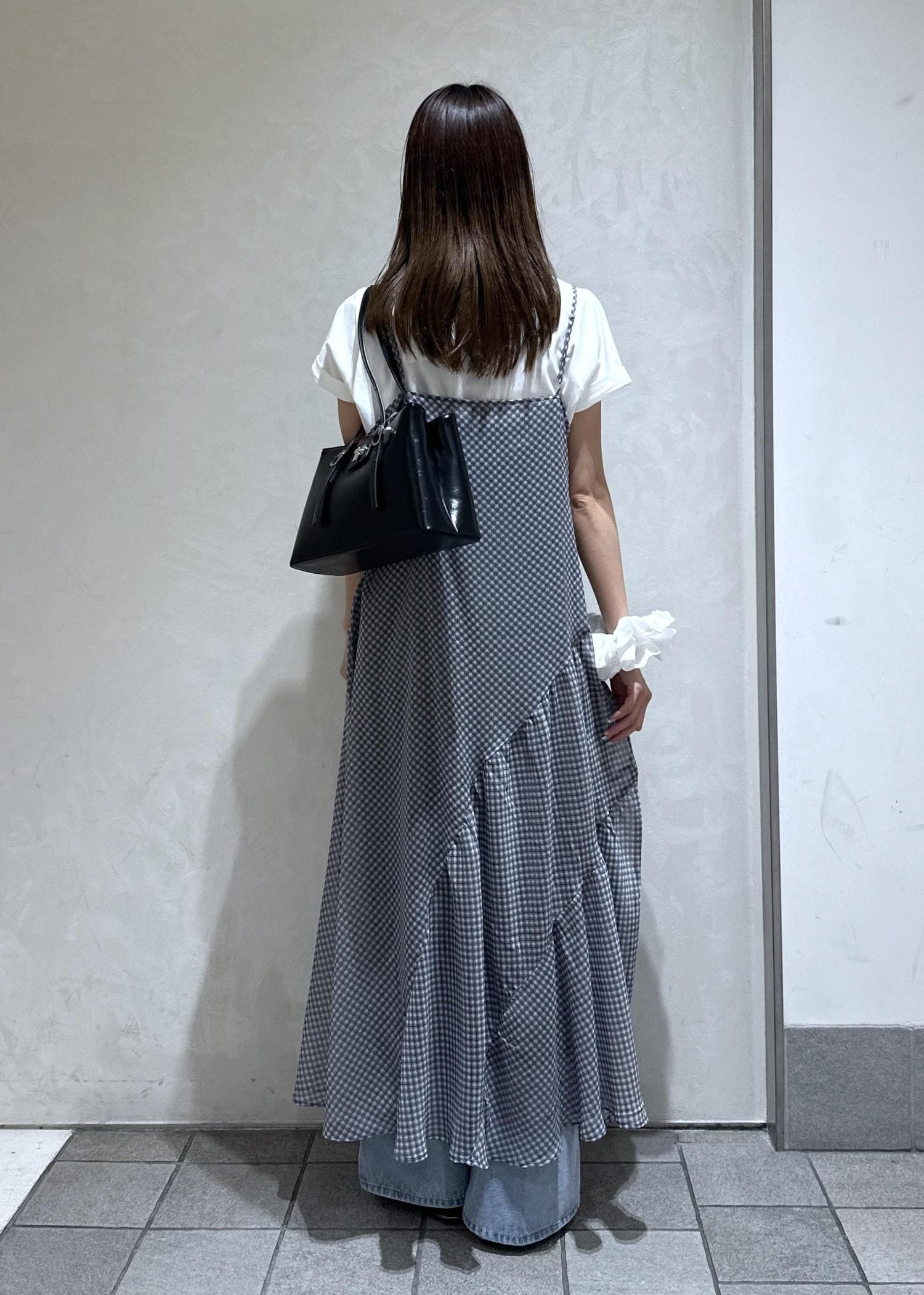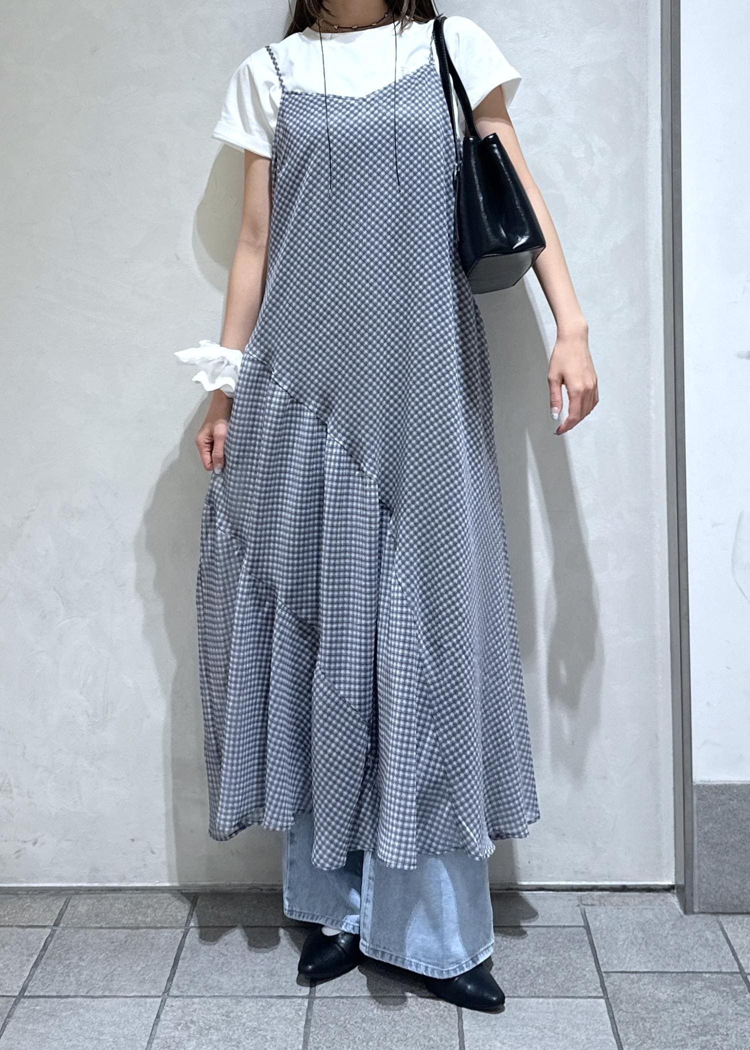 チェックワンピにTシャツを重ねてやさしい雰囲気に。