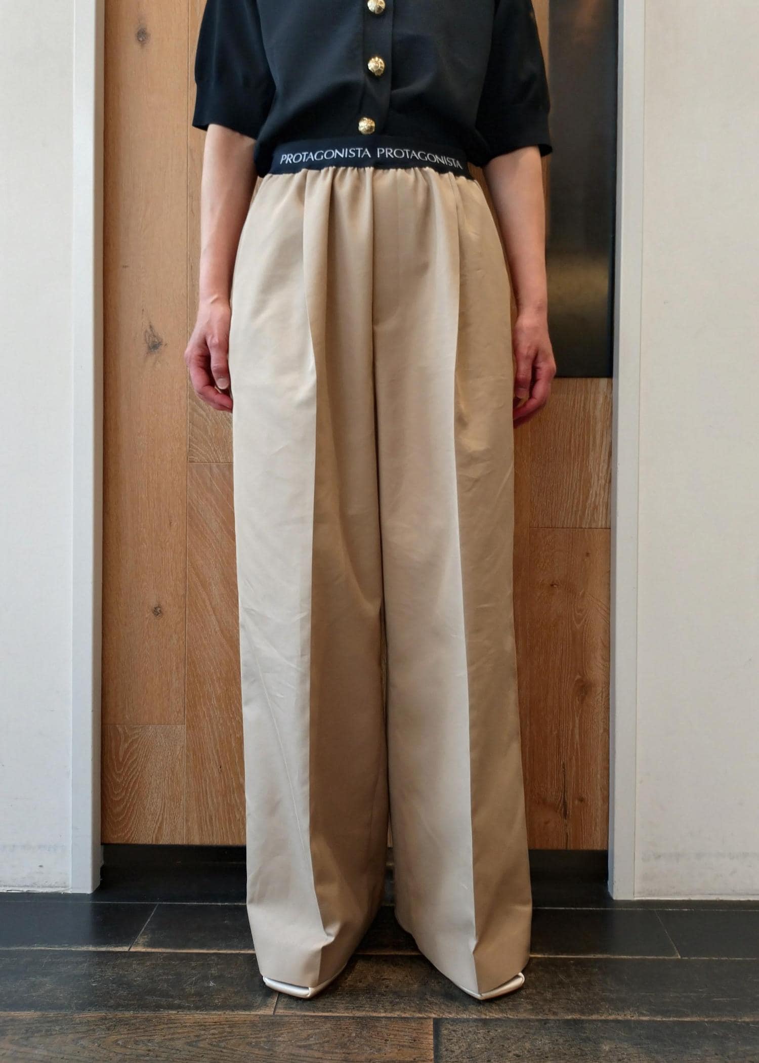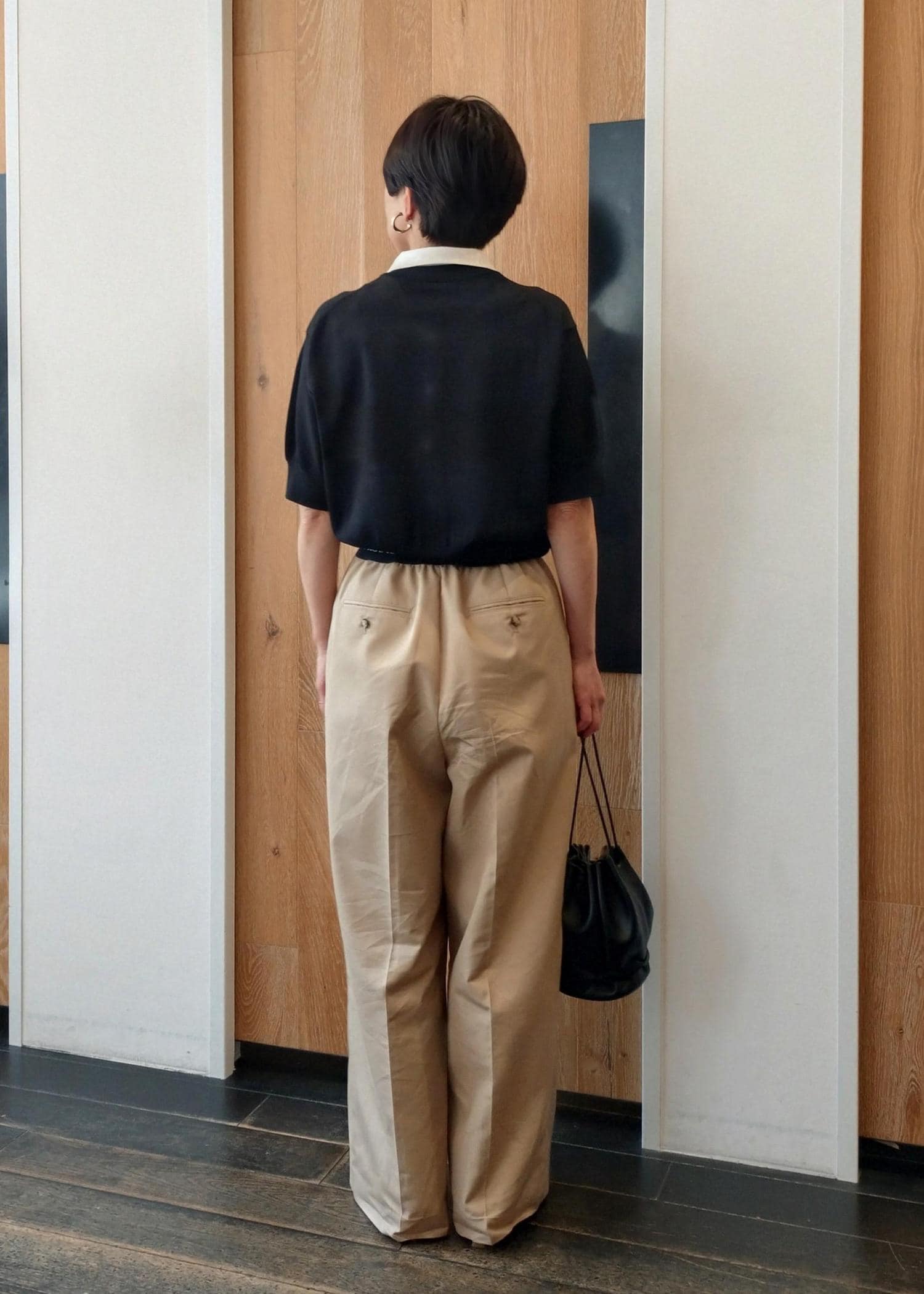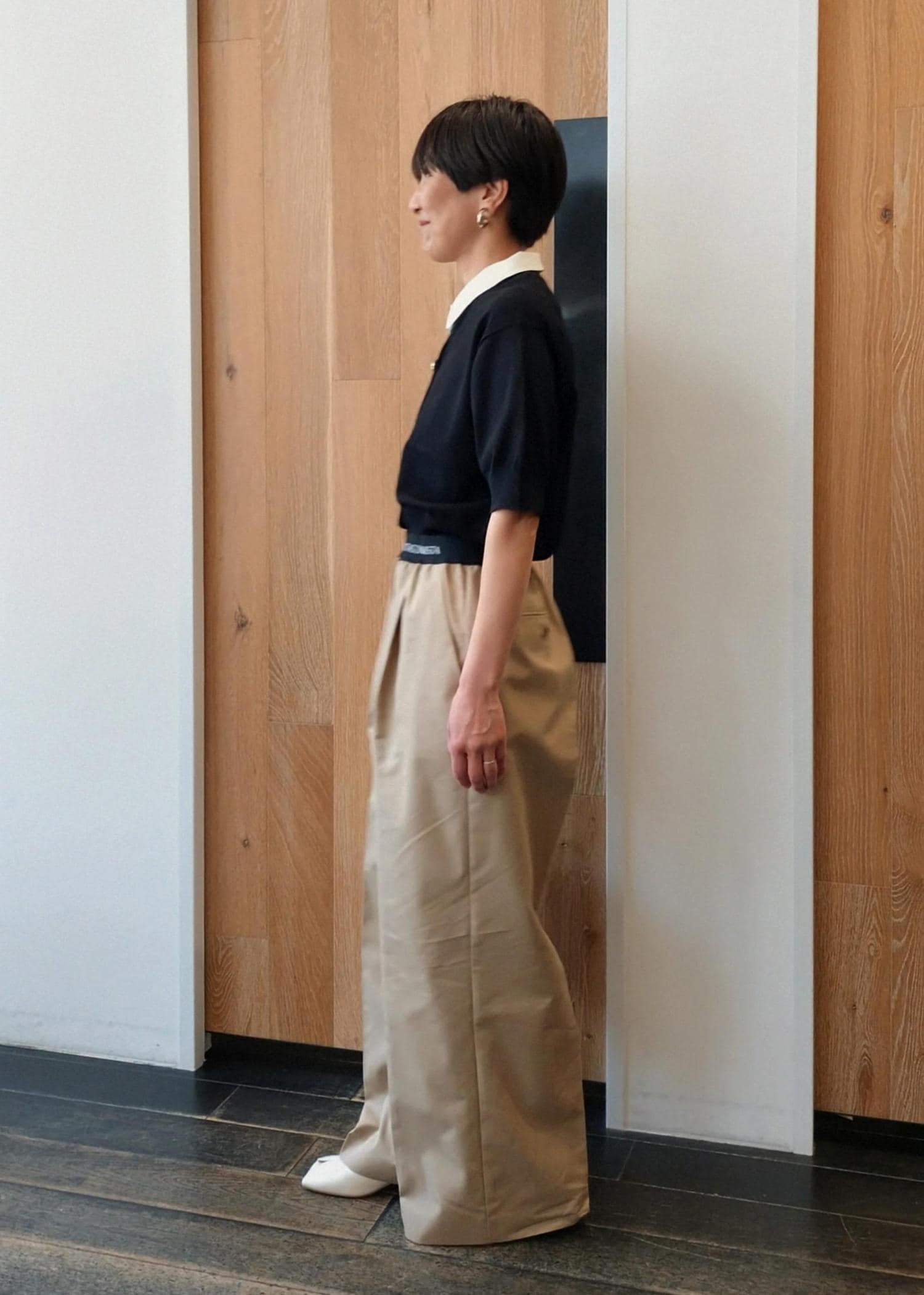 合わせたパンツは、ブランドロゴのウエストゴムがアクセントになるPROTAGONISTです。ボディラインを拾わないワイドストレートのシルエットで、センタープレスを施しているのでカジュアルすぎずキレイめなアイテムとも相性抜群です。