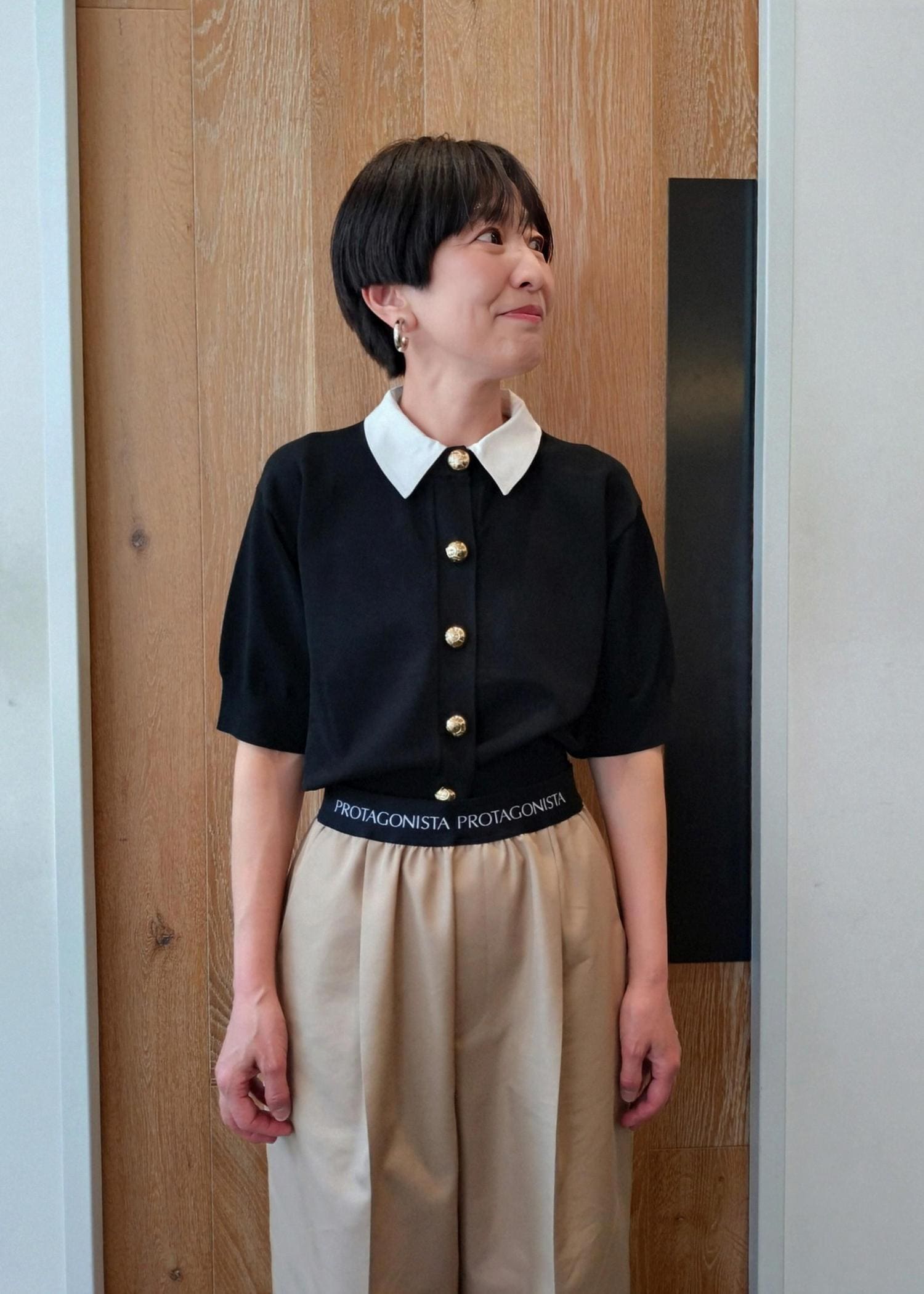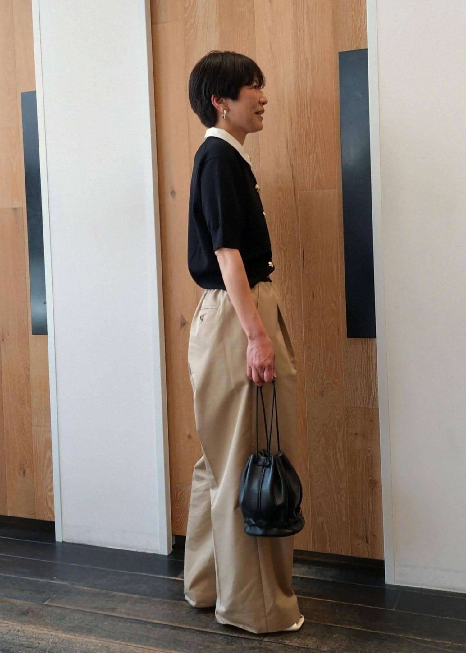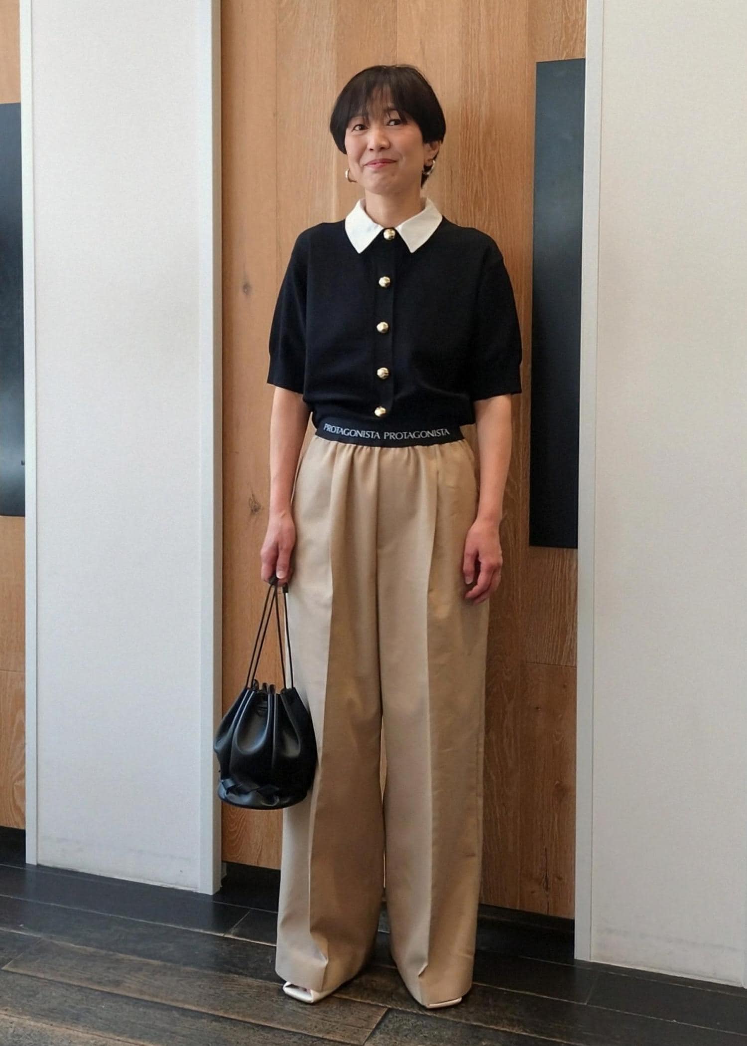 合わせたパンツは、ブランドロゴのウエストゴムがアクセントになるPROTAGONISTです。ボディラインを拾わないワイドストレートのシルエットで、センタープレスを施しているのでカジュアルすぎずキレイめなアイテムとも相性抜群です。