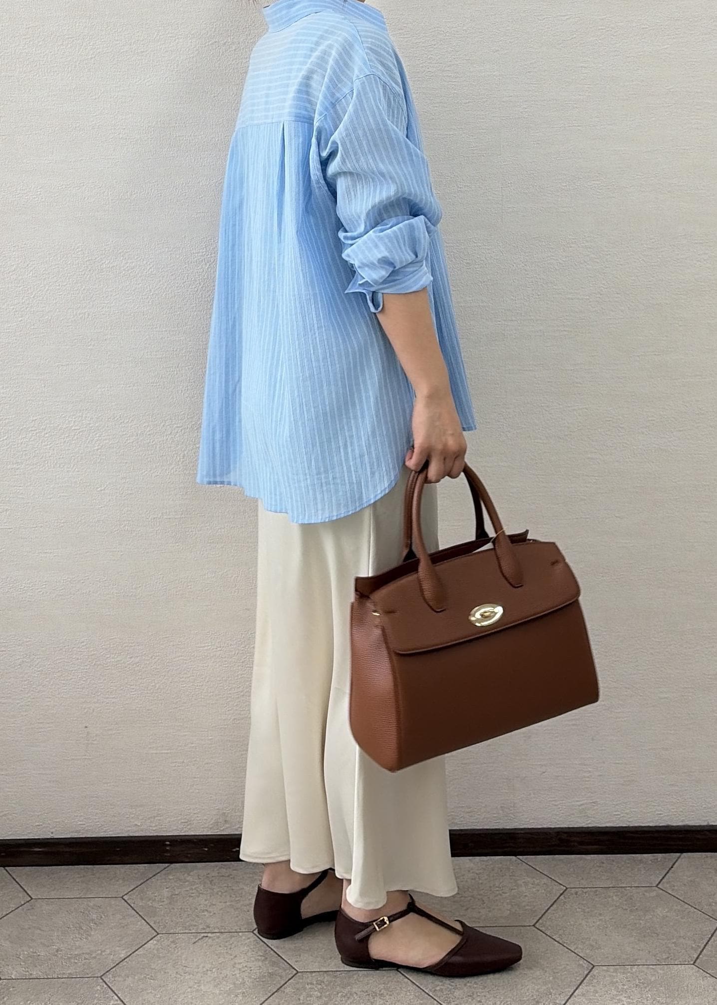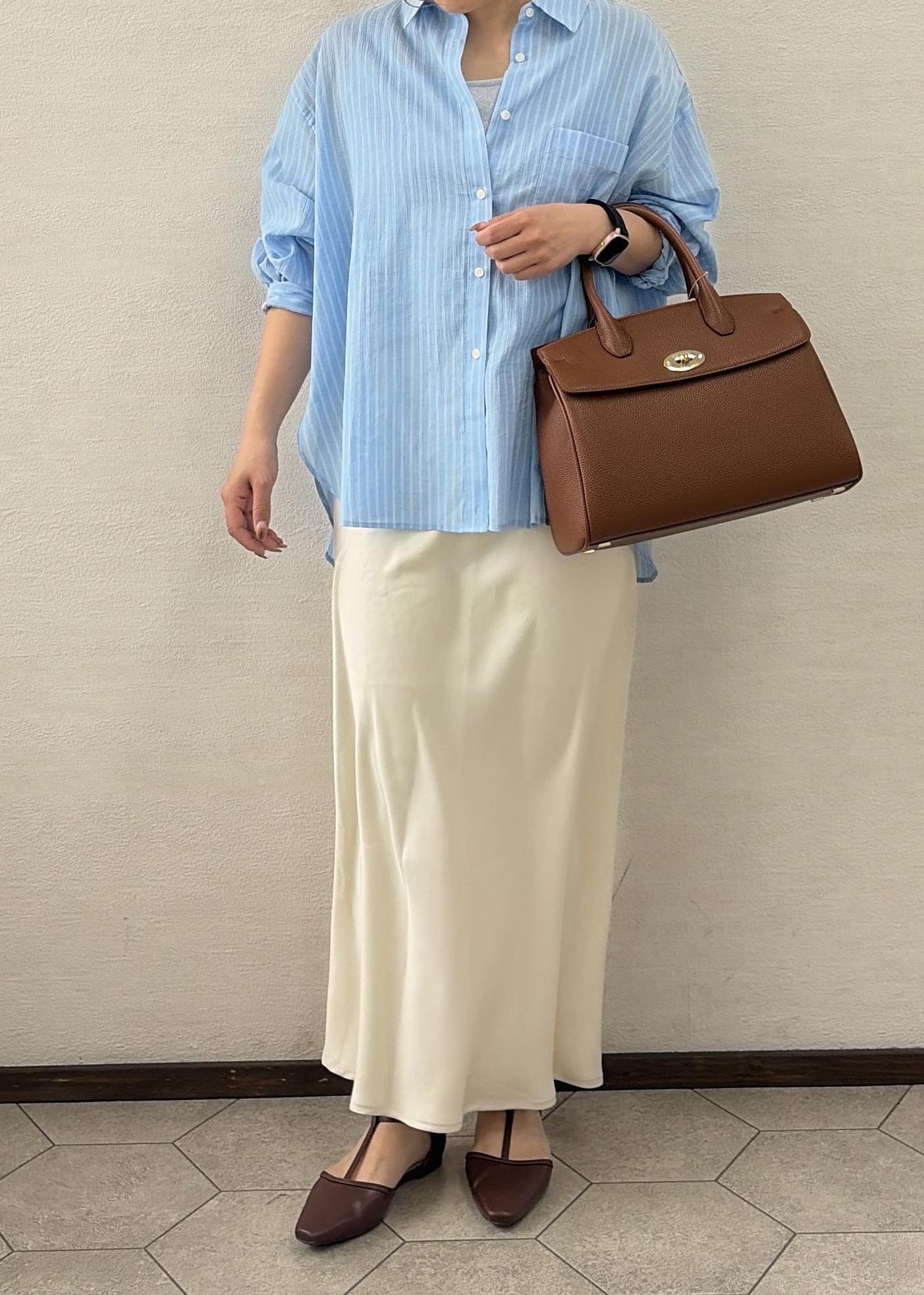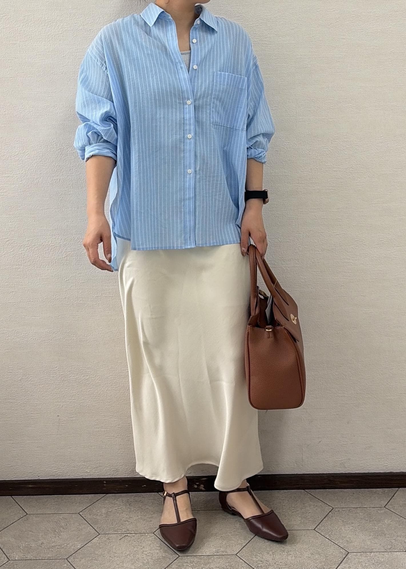 春夏にぴったりの通気性があり、接触冷感のストライプシャツで春夏先取りコーデ◯きれいめのスカートと合わせることで、カジュアルすぎないお出かけコーデにしました!