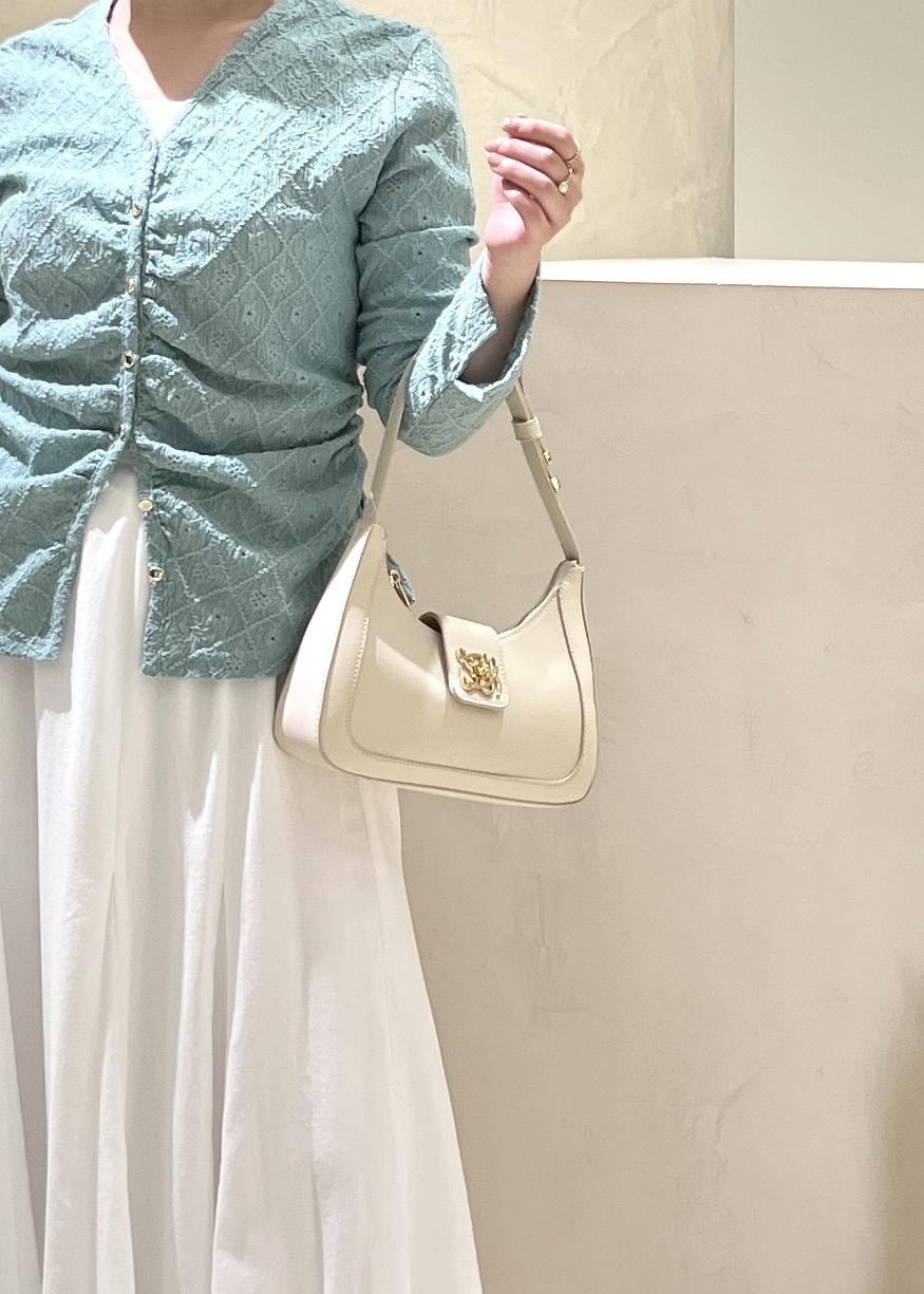 ボタン部分のギャザーが華奢に見せてくれつつ、首周りもスッキリなので抜け感も1枚で演出できます◎