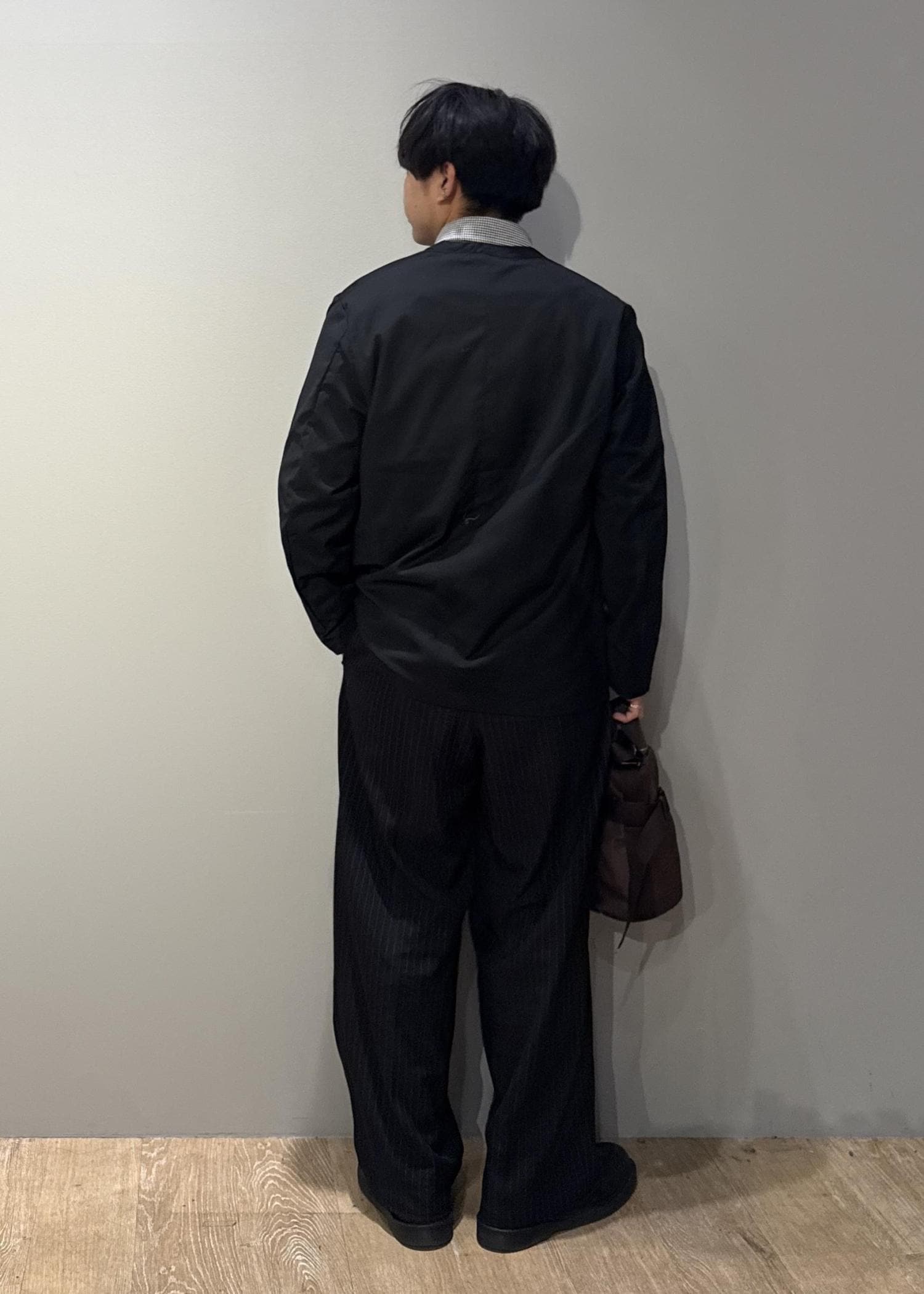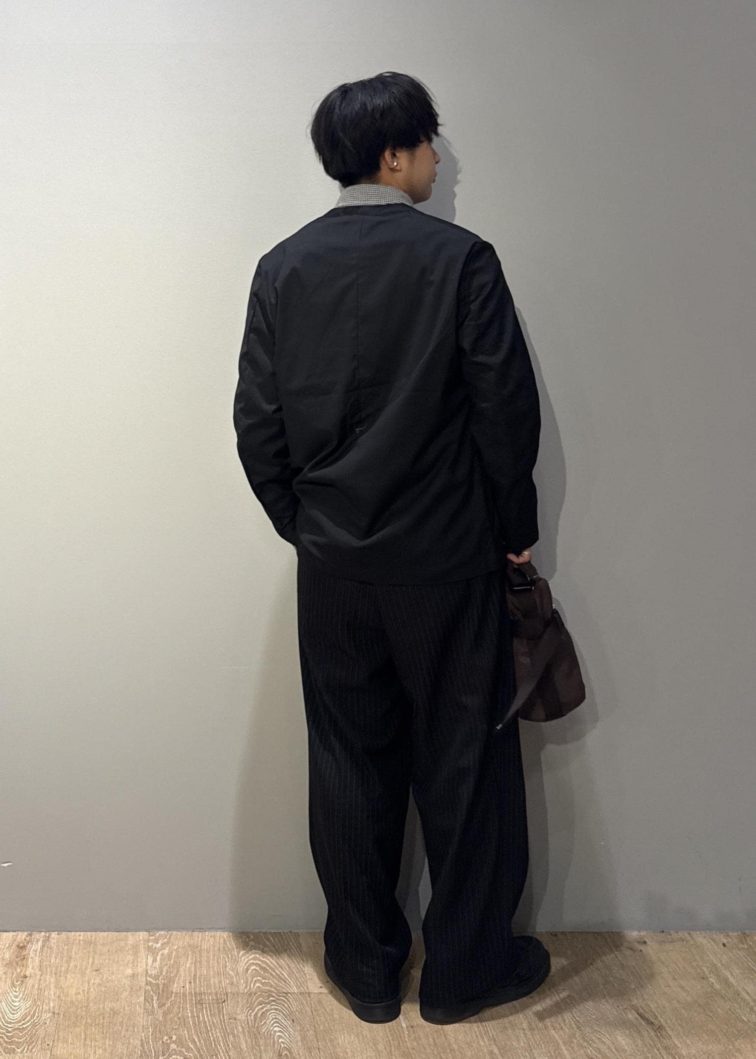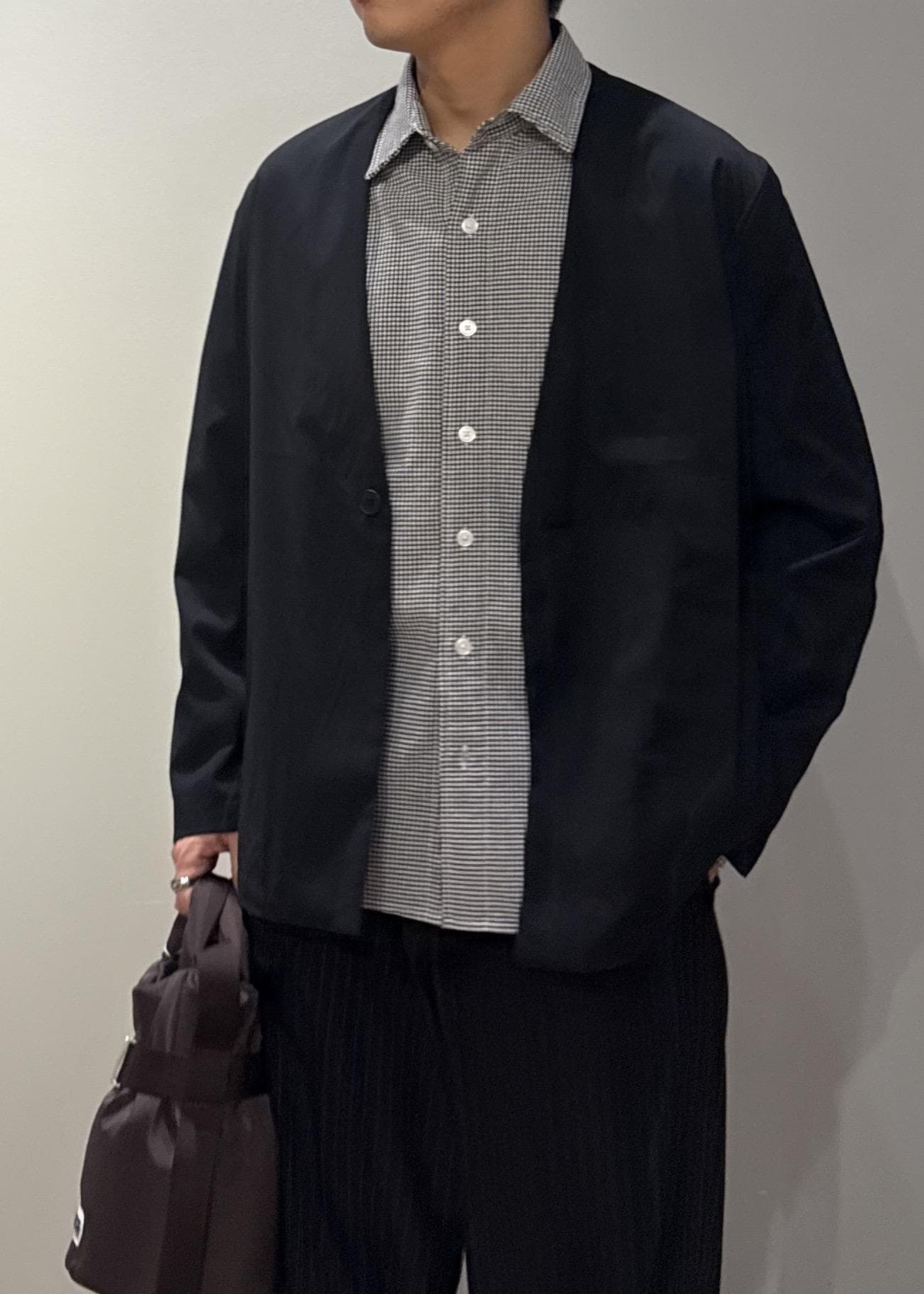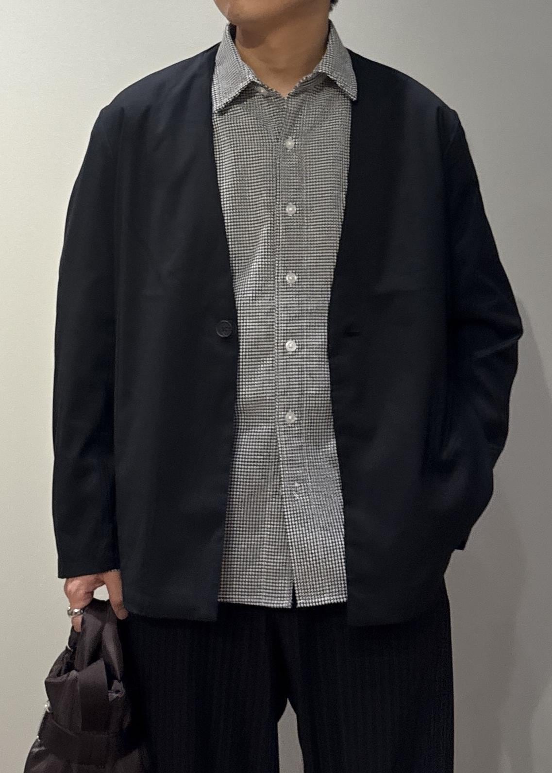 今回はキャリーマンノーカラージャケットを使ったコーデです。
