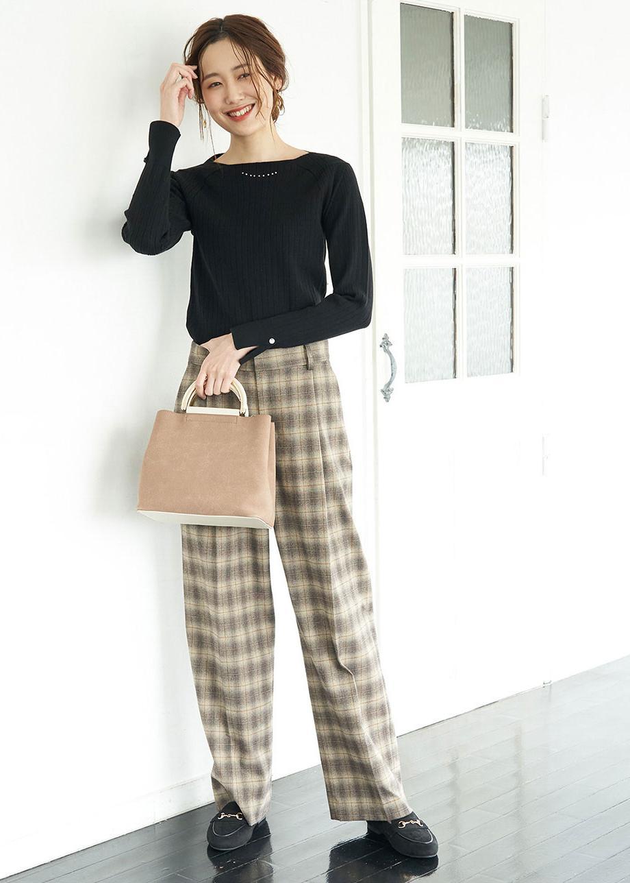 チェックパンツはタックが入っているのですが、ウエスト周りはすっきりしているのでトップスインもしやすいです。