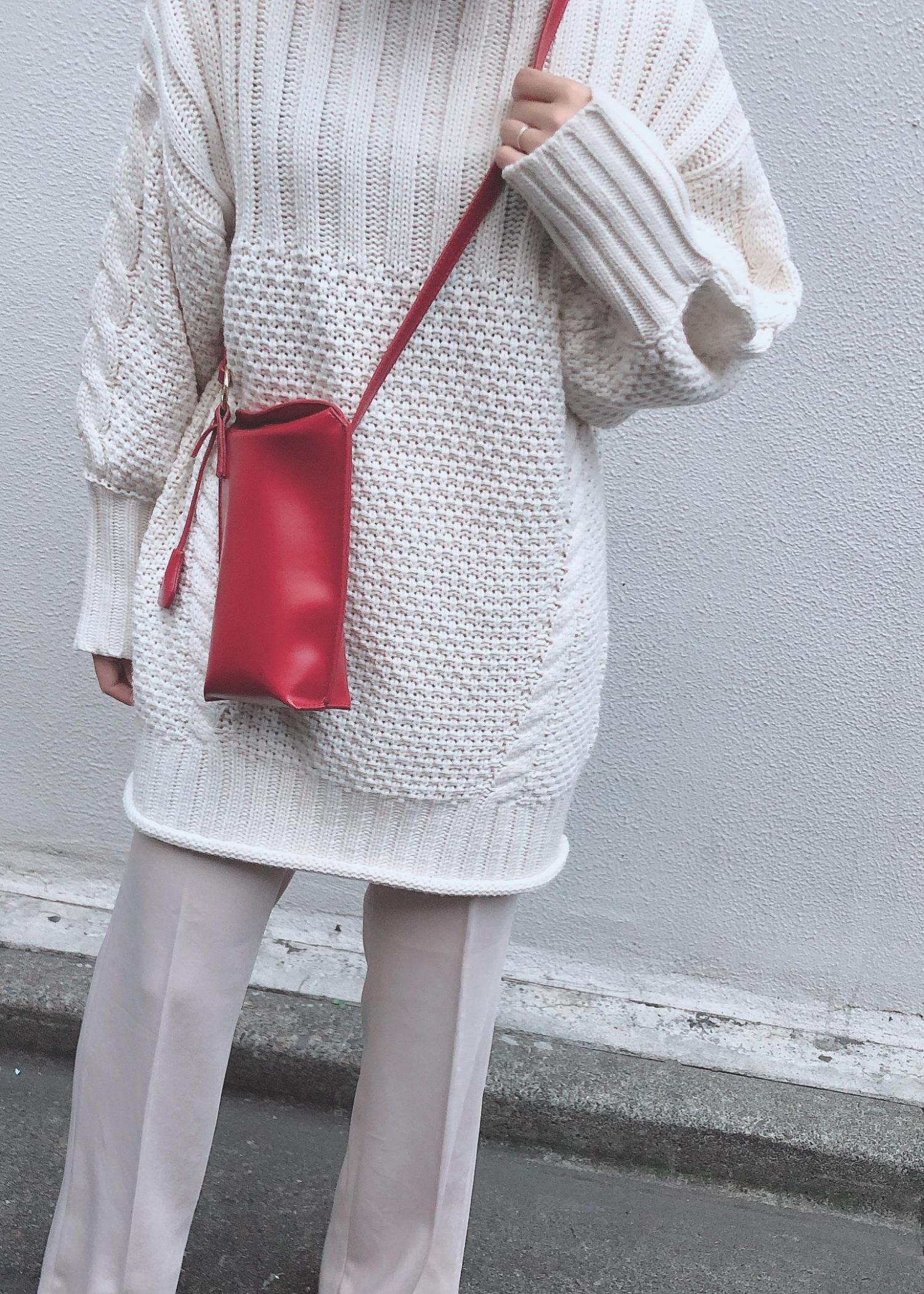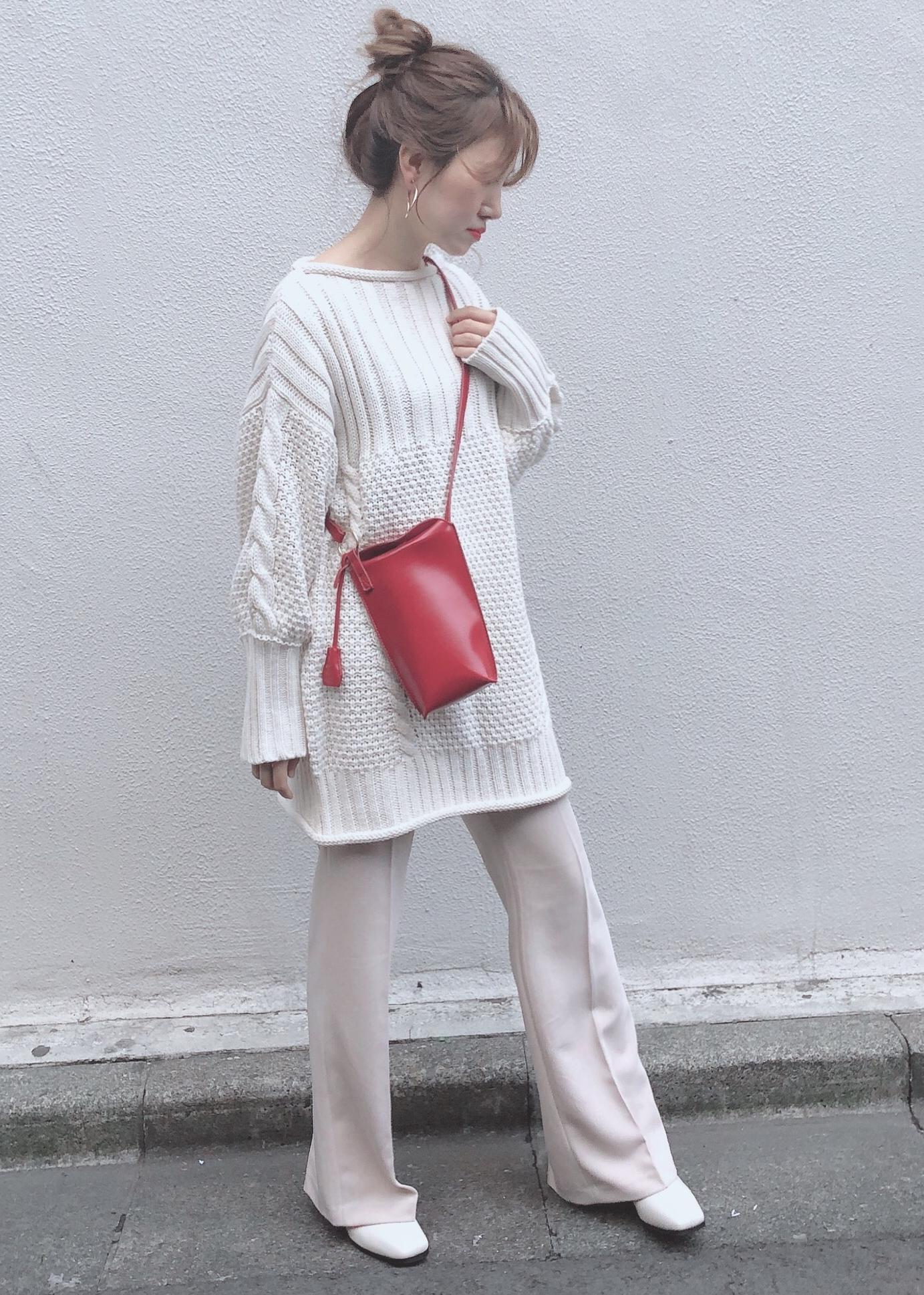 赤いバッグがアクセントのホワイトコーデ