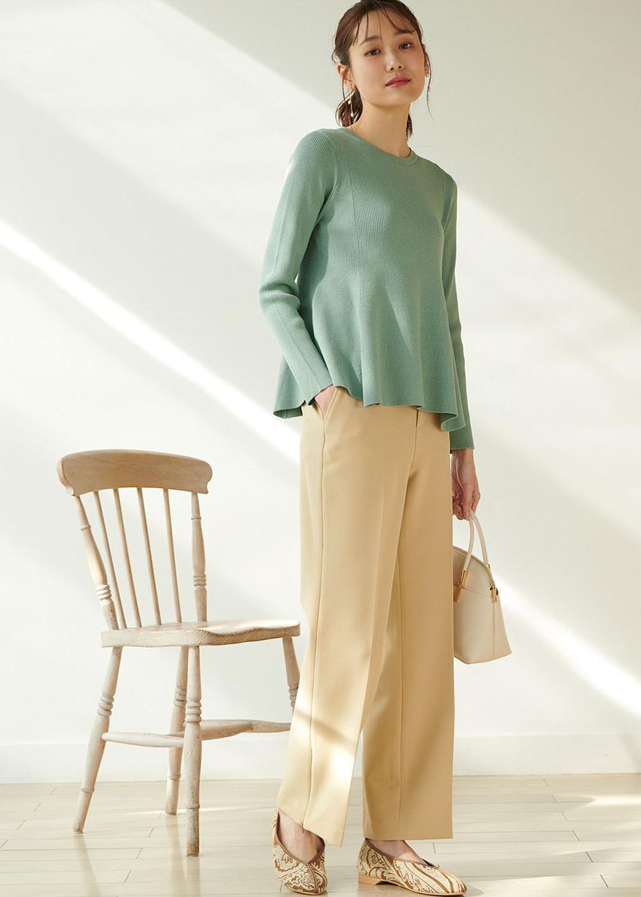 パステルグリーンカラーのトップスはペプラムシルエットになっていて、お花のようにふんわりと広がり上品な印象。