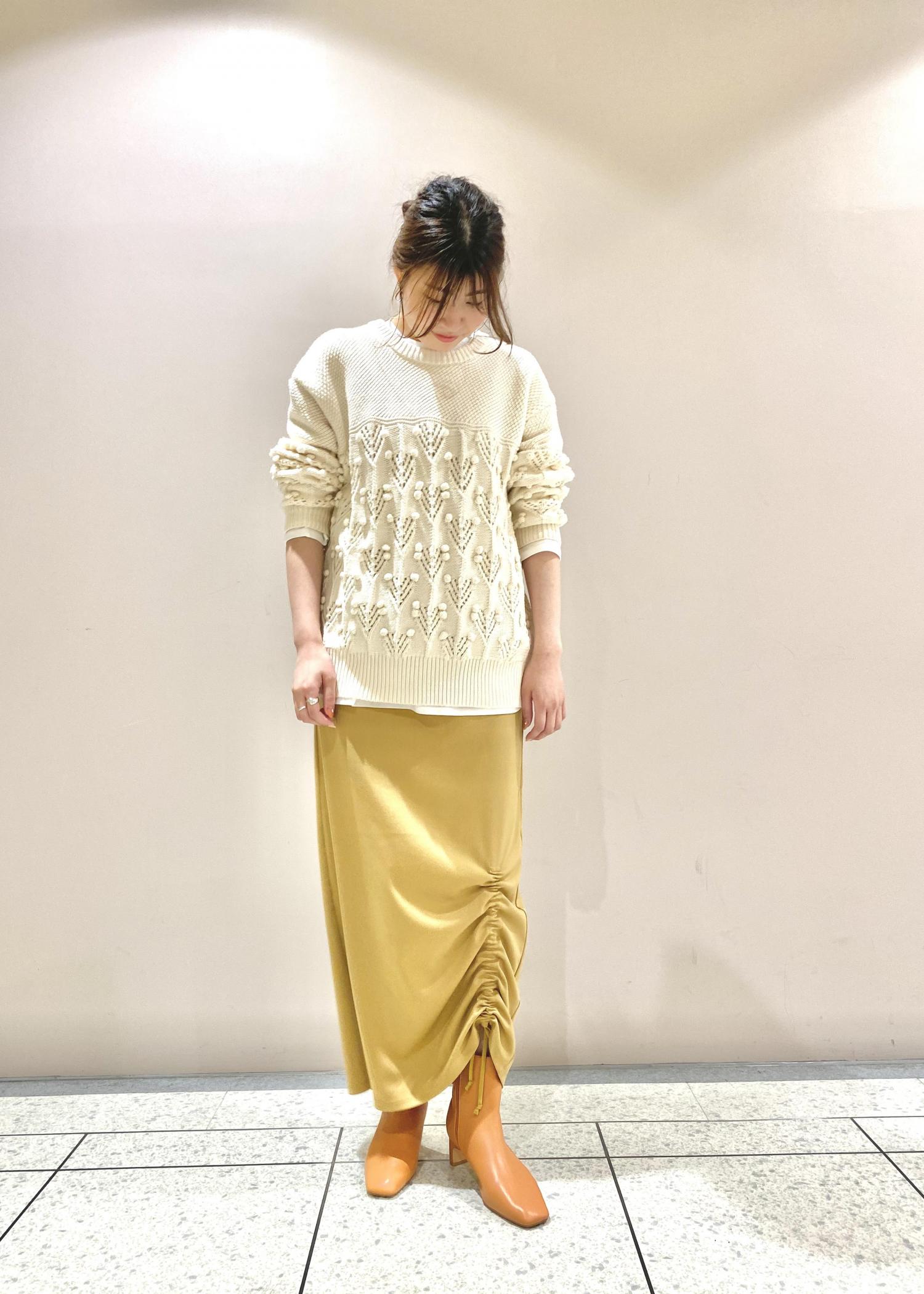 1枚でアクセントになるポップコーンデザインのニットに、伸縮性があり履きやすいスカート合わせで、おうちでも楽に着られ、そのままお出掛けも出来ちゃうスタイリングに致しました!