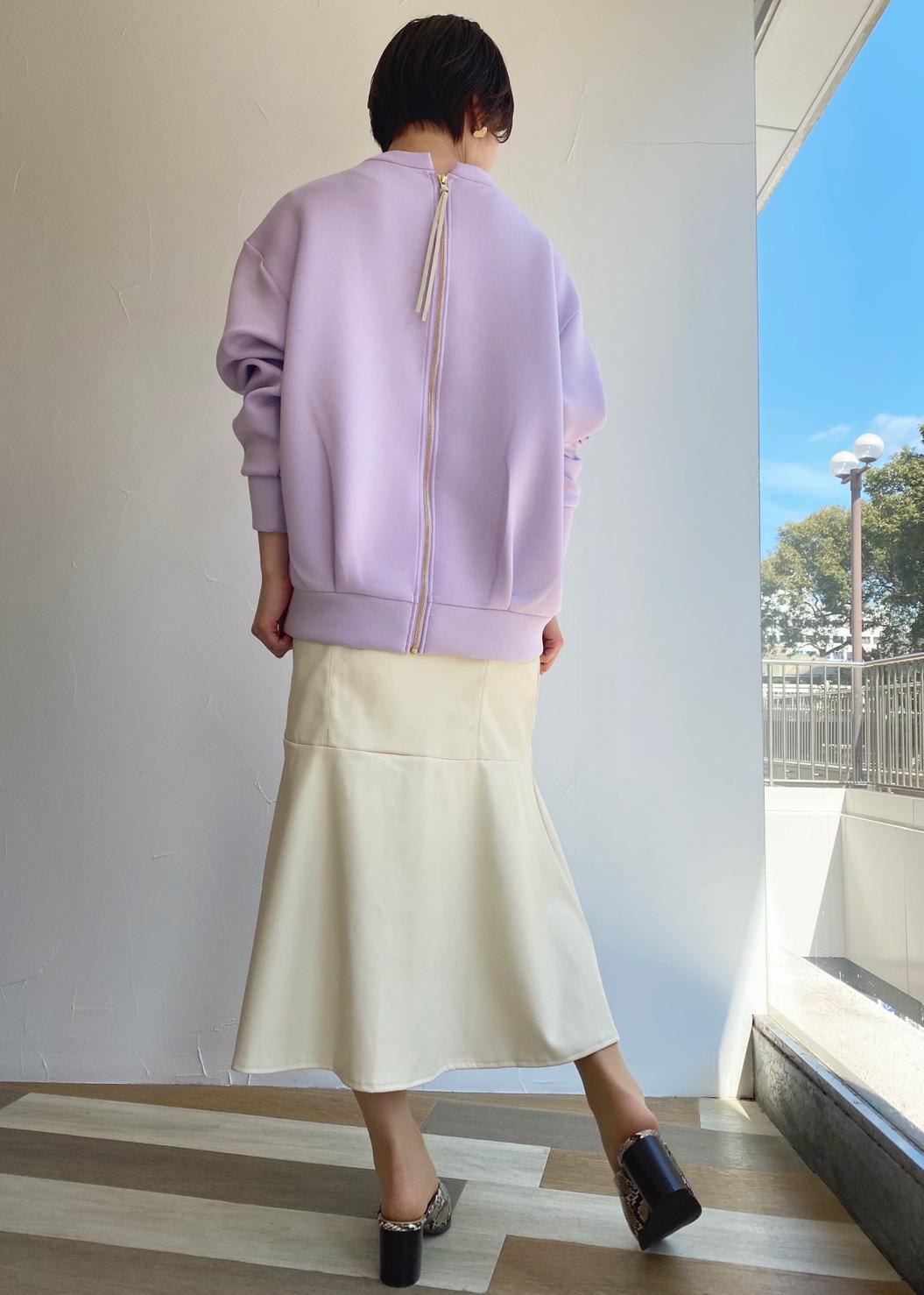 ゆるっとしたスフレタッチのトップスにキレイめスカートを合わせてメリハリを。