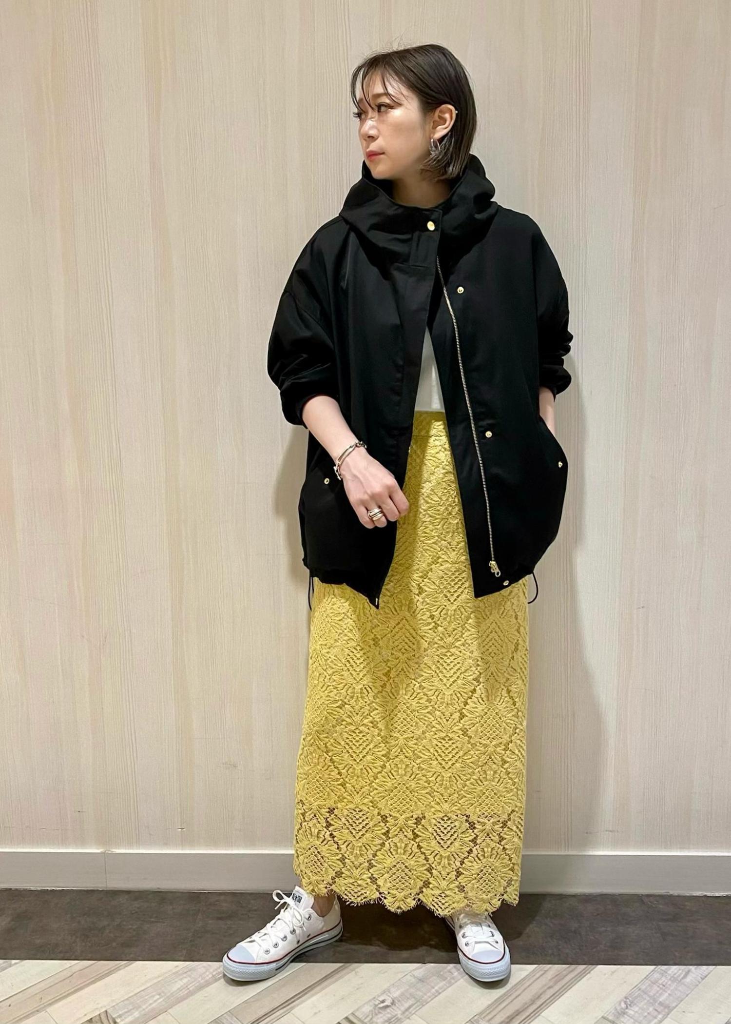 きれい目なレーススカートをカットソーとコンバースで合わせる事でカジュアルダウンしたスタイリングになります。