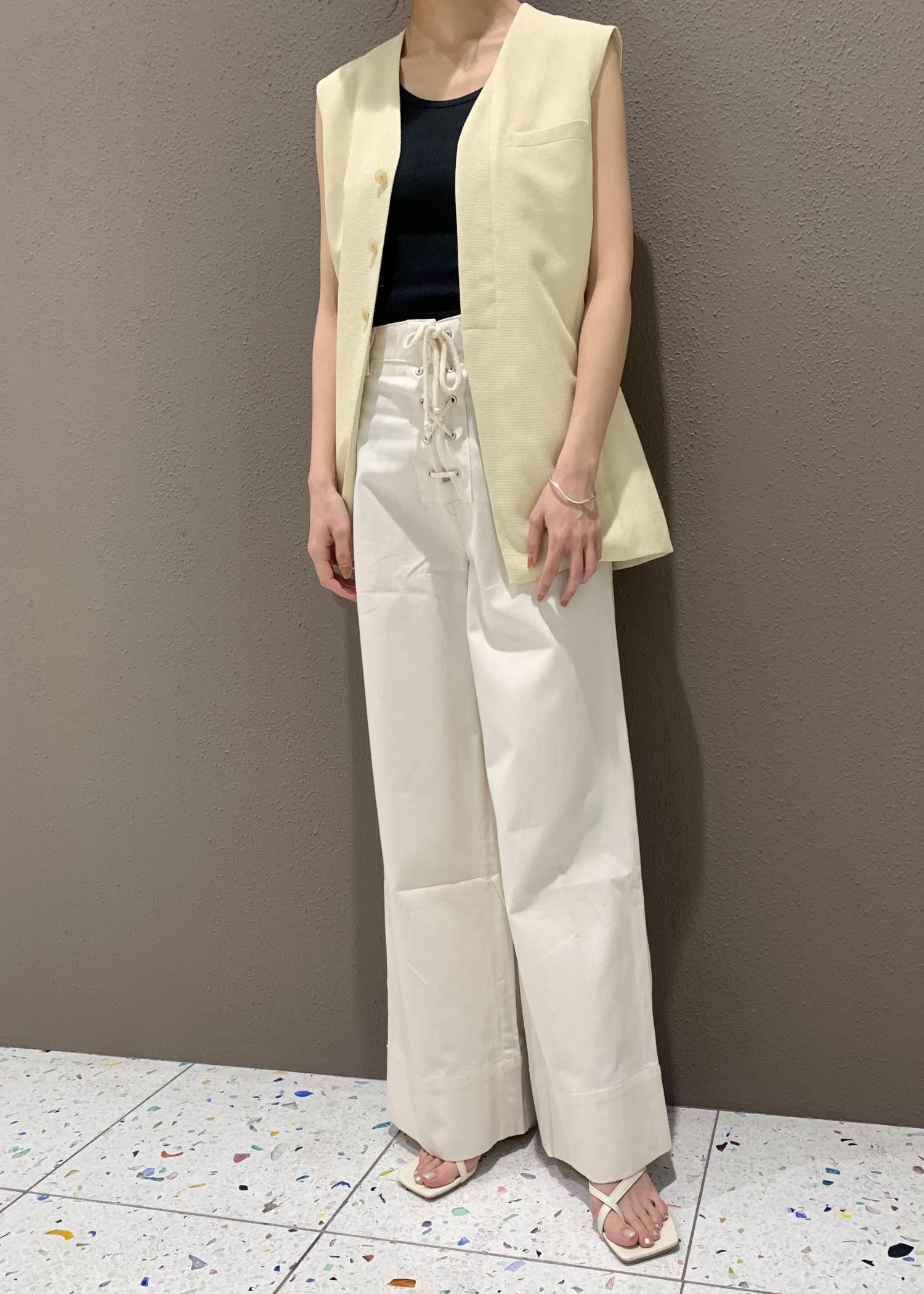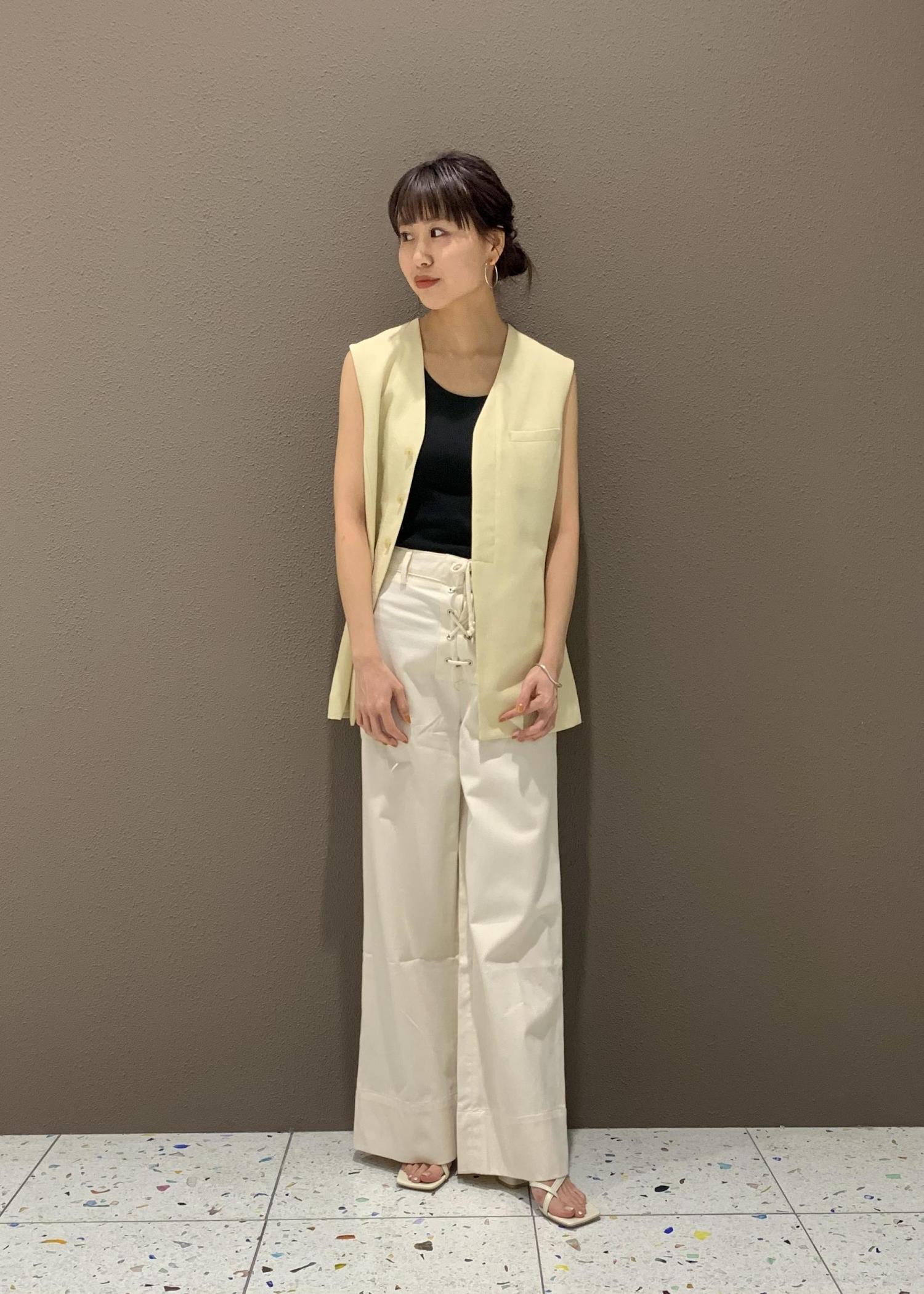マニッシュな雰囲気のジレですが、春らしい淡いカラーでまとめて柔らかさを。少しハンサムなスタイリングですが、タンクトップでデコルテをだすことで女性らしさが出るようにしました。