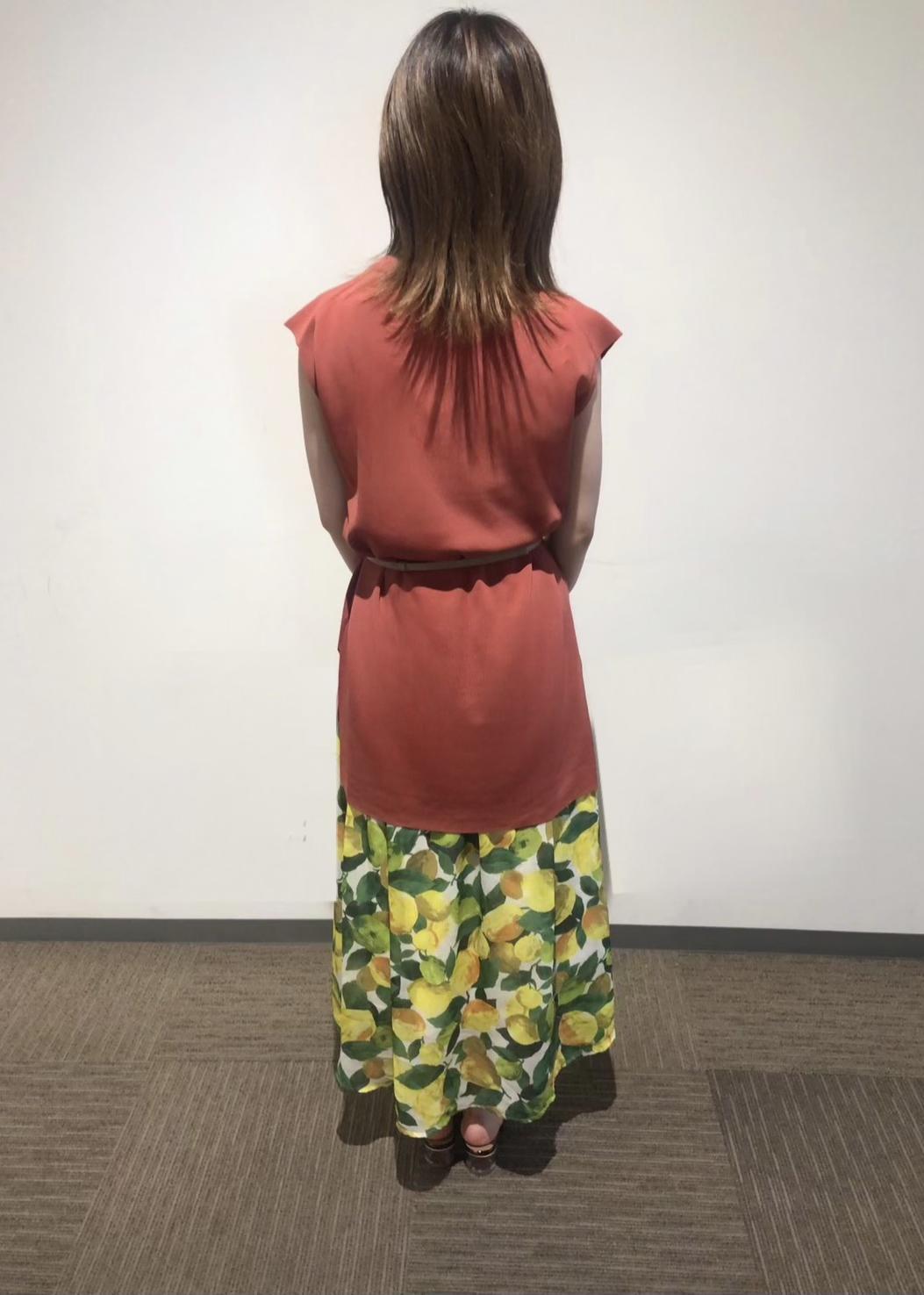 パキッとしたカラーのトップスに涼しげなレモン柄のスカートを合わせたさわやかコーディネートに♪