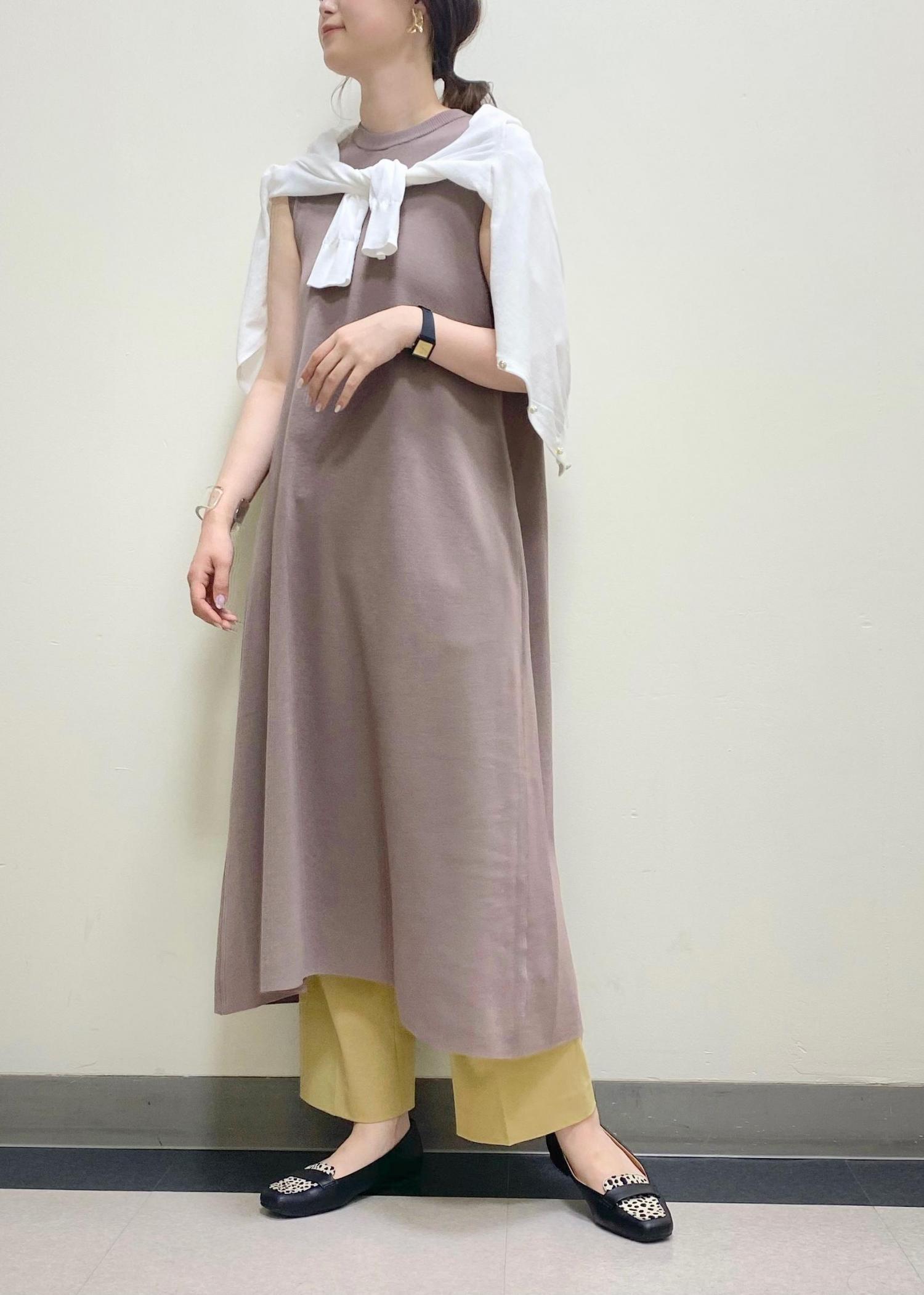 1枚で楽にノンストレスにお召しいただけるAラインが綺麗なワンピースに、あえてショート丈のワイドパンツでカラーポイントになるレイヤードスタイルにしてみました!