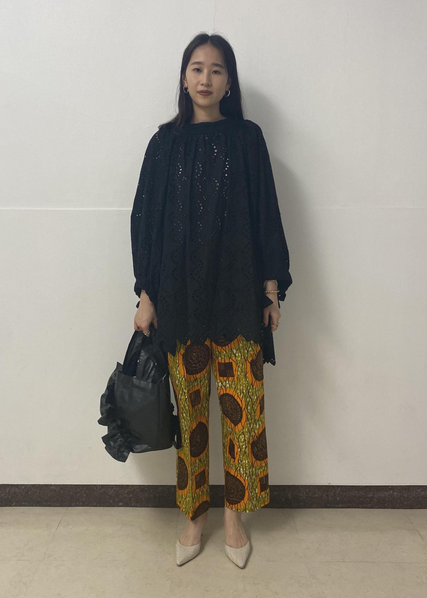 パンツを引き立たせるためにブラックカラーのアイテムを合わせてみました。