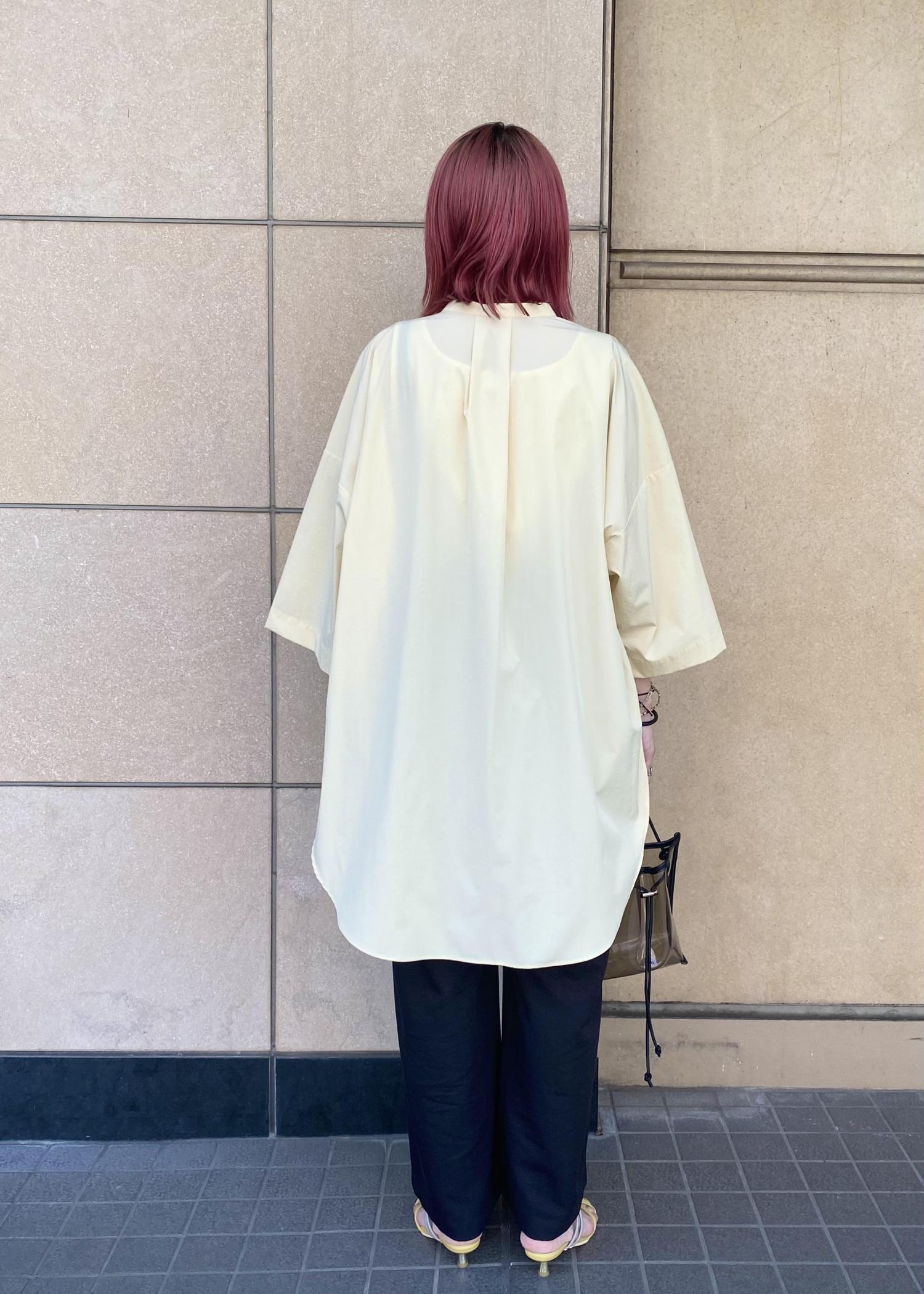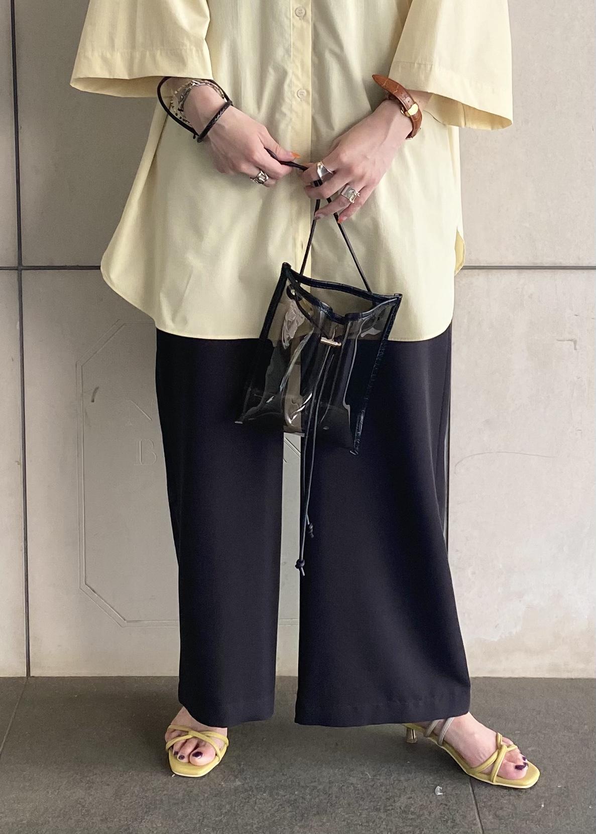 イエローカラーのシャツを使って爽やかにまとめてみました。シャツとサンダルをイエローのお色味で合わせて統一感を意識してみました。こちらのシャツは羽織でも一枚でもお使い頂けるのでとてもおすすめです。