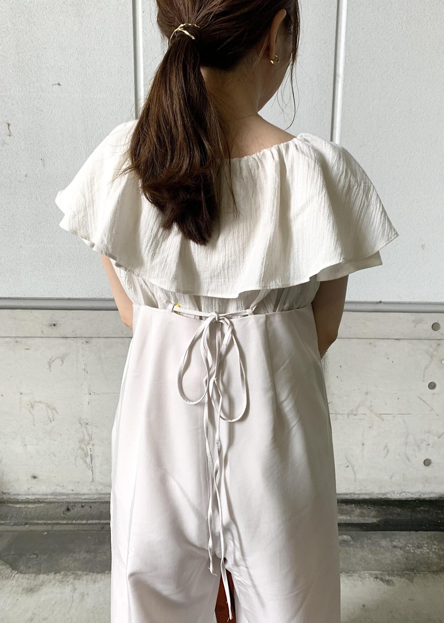 トップスとサロペットのカラーをあえて合わせることでフリルが浮いて見えず統一感を出しました。シューズは同系色のイエローで馴染ませて、バッグを濃いめなブラウンを合わせることで締まった印象に仕上げました。