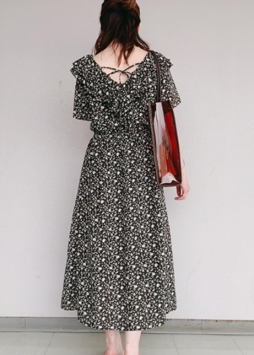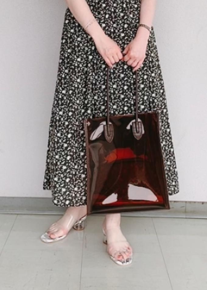 可愛いディテール花柄のワンピースにトレンド感のあるクリアバックとアッパーサンダルで大人っぽく合わせています。