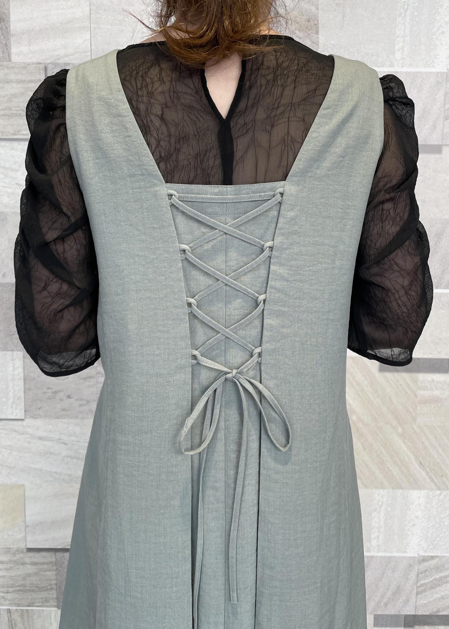 ゆったりしたジャンパースカートに、今年のトレンドのシアーシャツを合わせました。トップスの身幅はすっきりしているので、お袖のボリュームも気にならずお召し頂けます。白のバッグを持ってくることで差し色になり、より夏らしくなります!