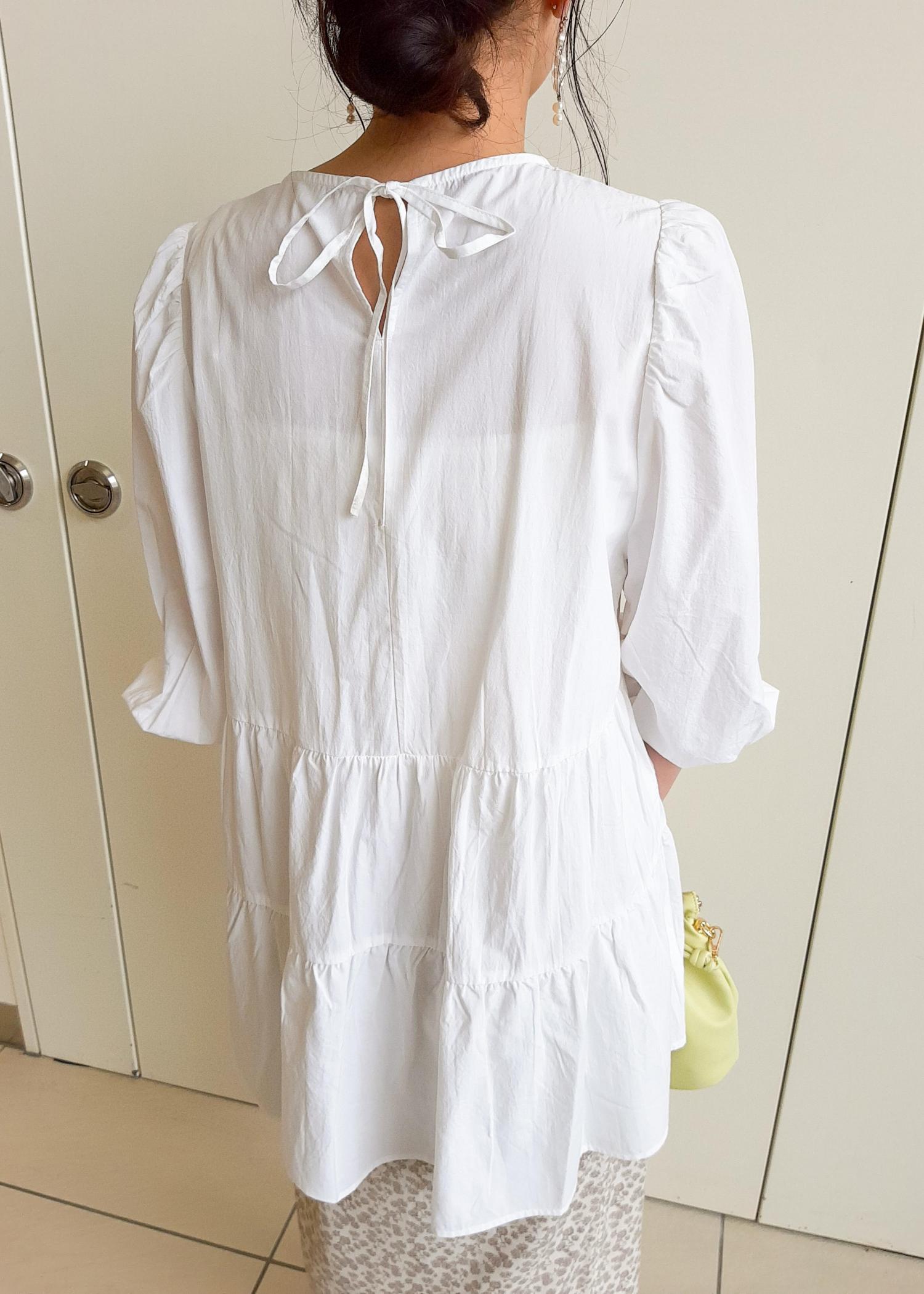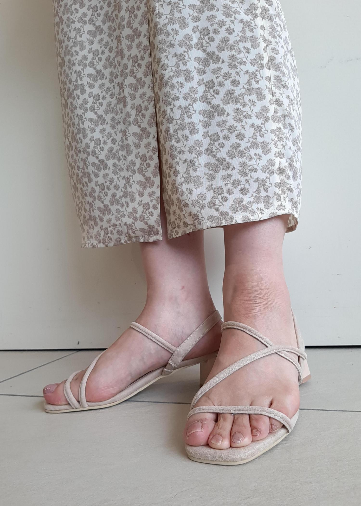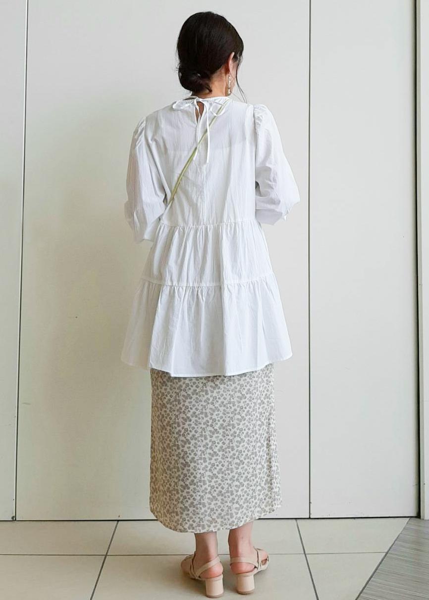 ボリュームのあるブラウスをすっきり見えるように、ワントーンで合わせました。ボリュームや長さのあるボトムスに華奢なサンダルを合わせるのもすっきり見えするポイントですよ。