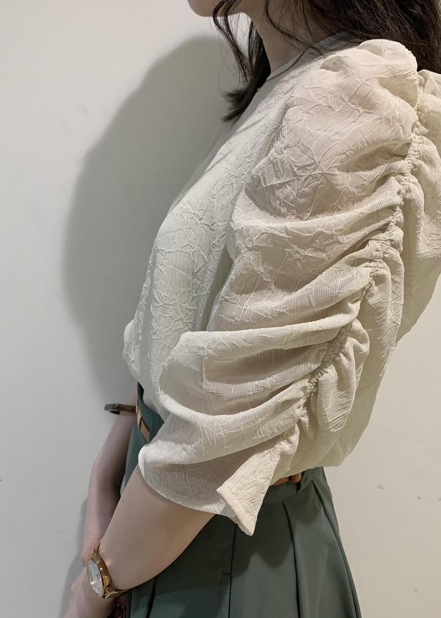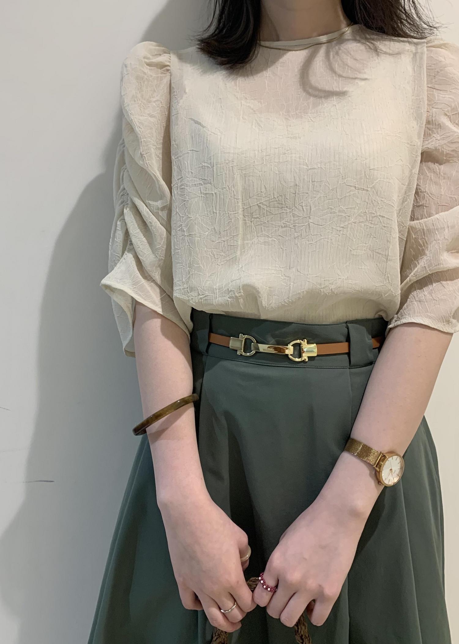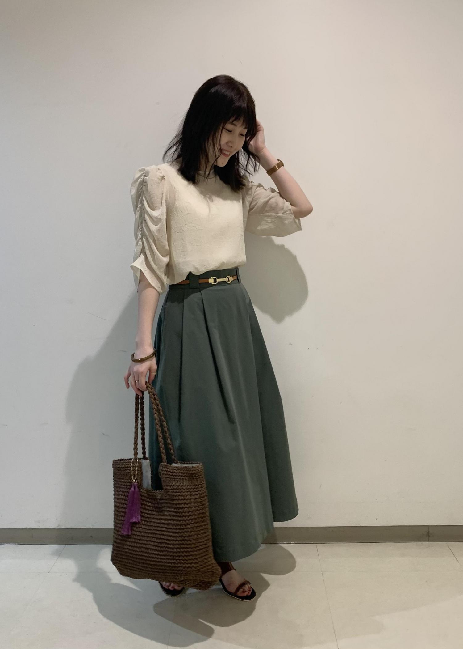 デザイン性あるブラウスにハリ感があるスカートを合わせた大人フェミニンスタイルに仕上げました。