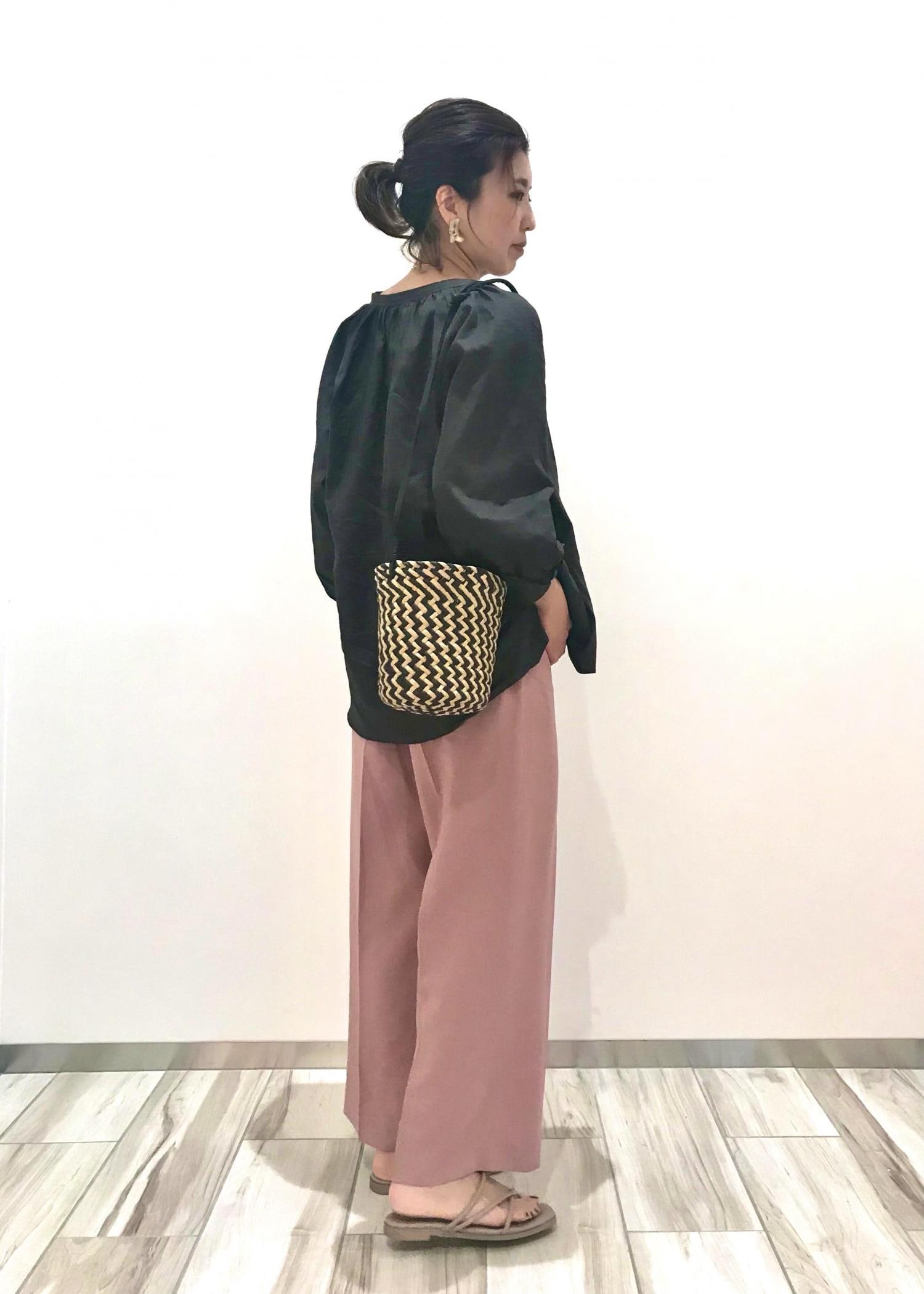 夏らしい素材・アイテムを使ったOFFスタイルにしました♪ベーシックカラーを選びがちな方も、このすくすみピンクのパンツは取り入れやすく挑戦して頂きやすいカラーなのでオススメです☺︎