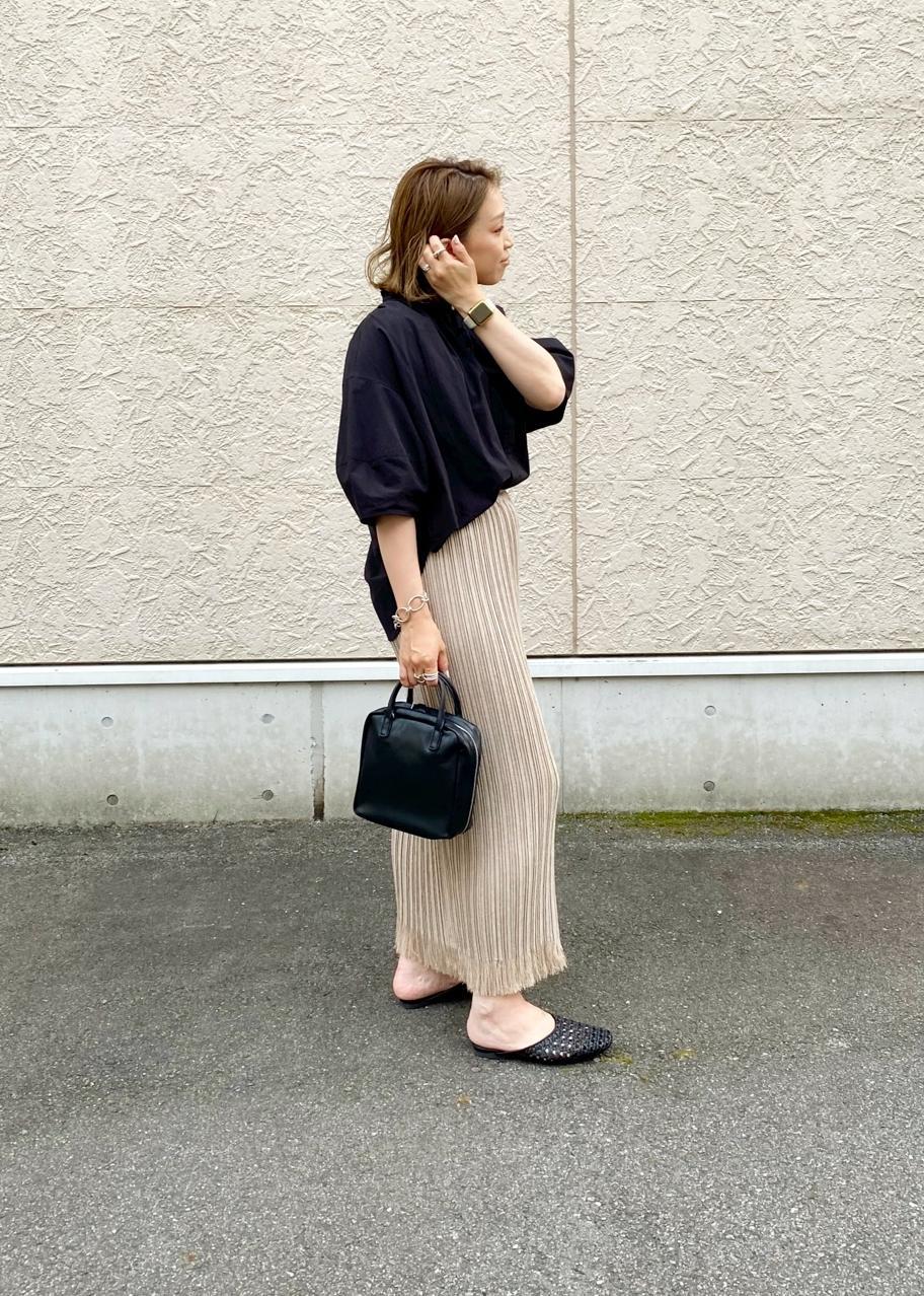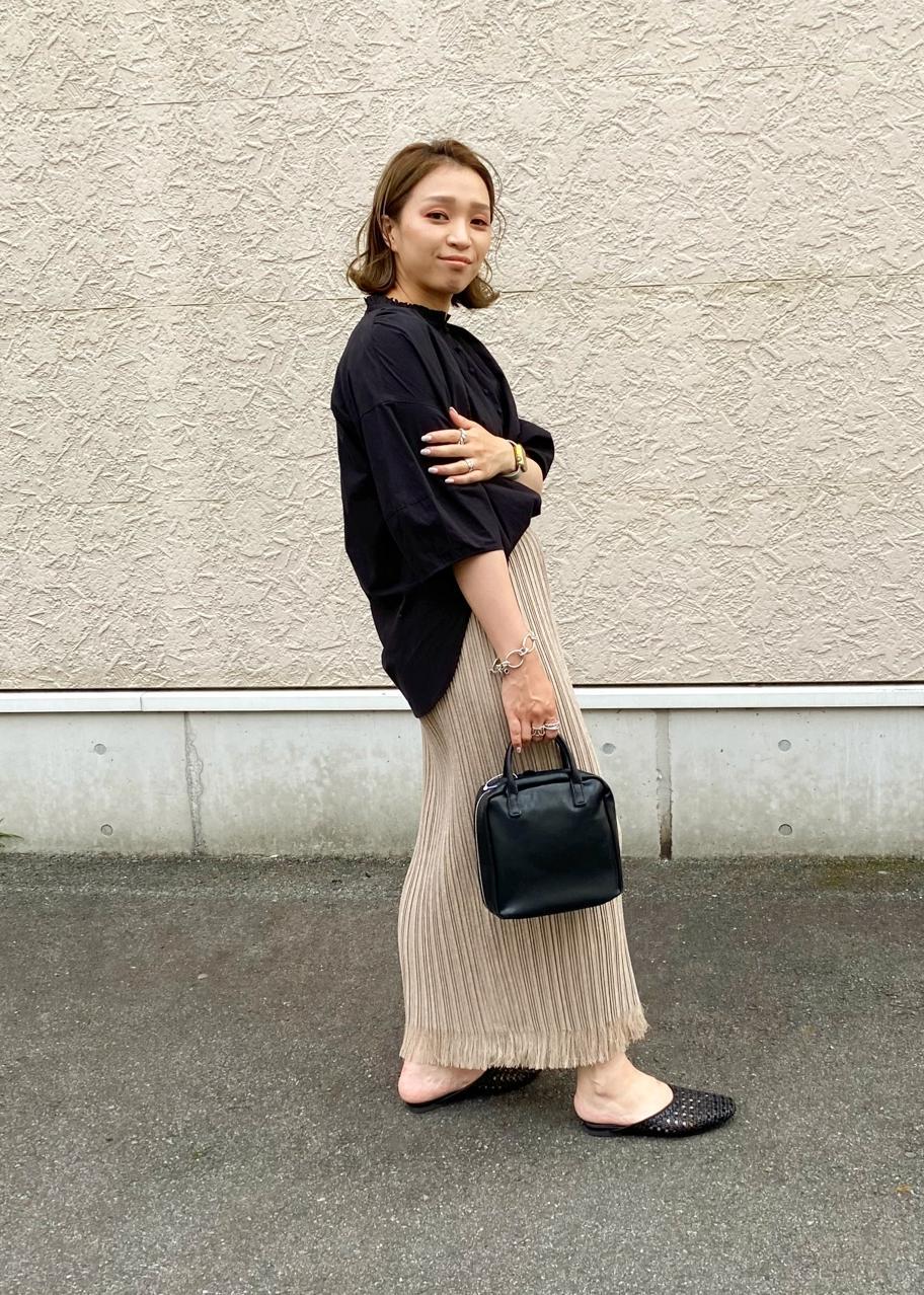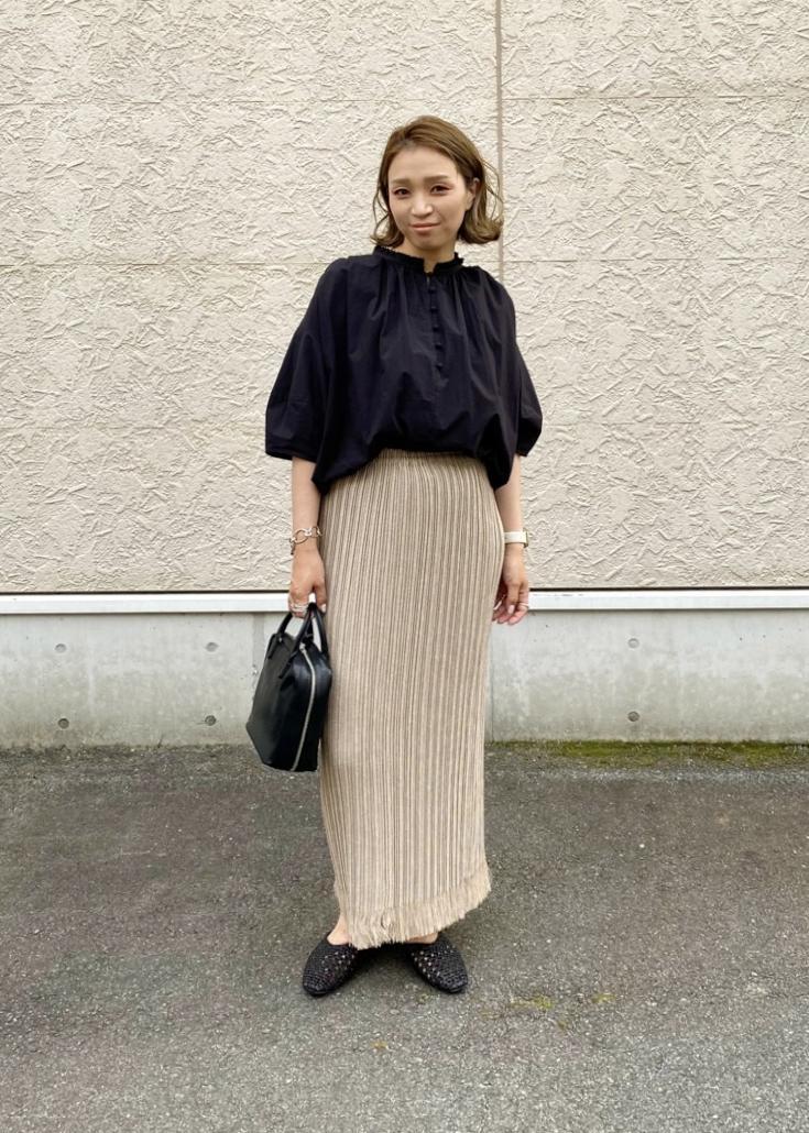 トップスのブラウスがフワっとしているのでボトムスはあえてタイトスカートにしてみました。