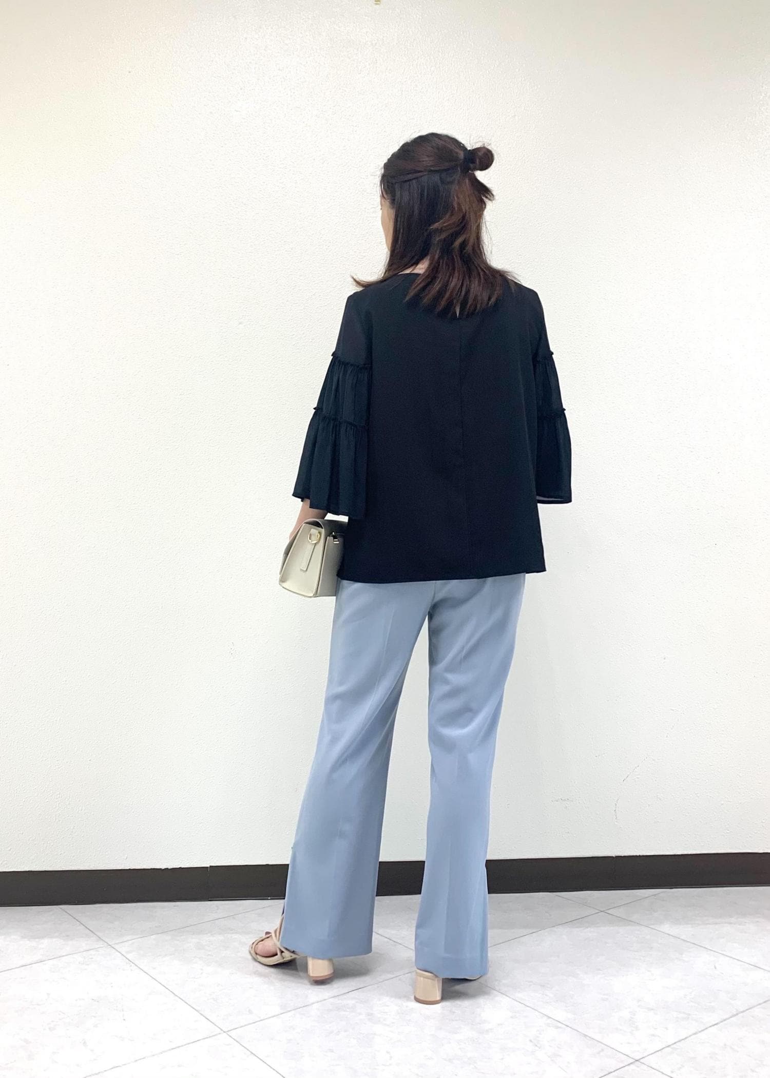 袖のティアードが今年らしくてかわいいブラウスに、シルエットがきれいなラク美パンツのコーディネートです。シンプルだけどかわいいお洋服はママさんにもおすすめです!!