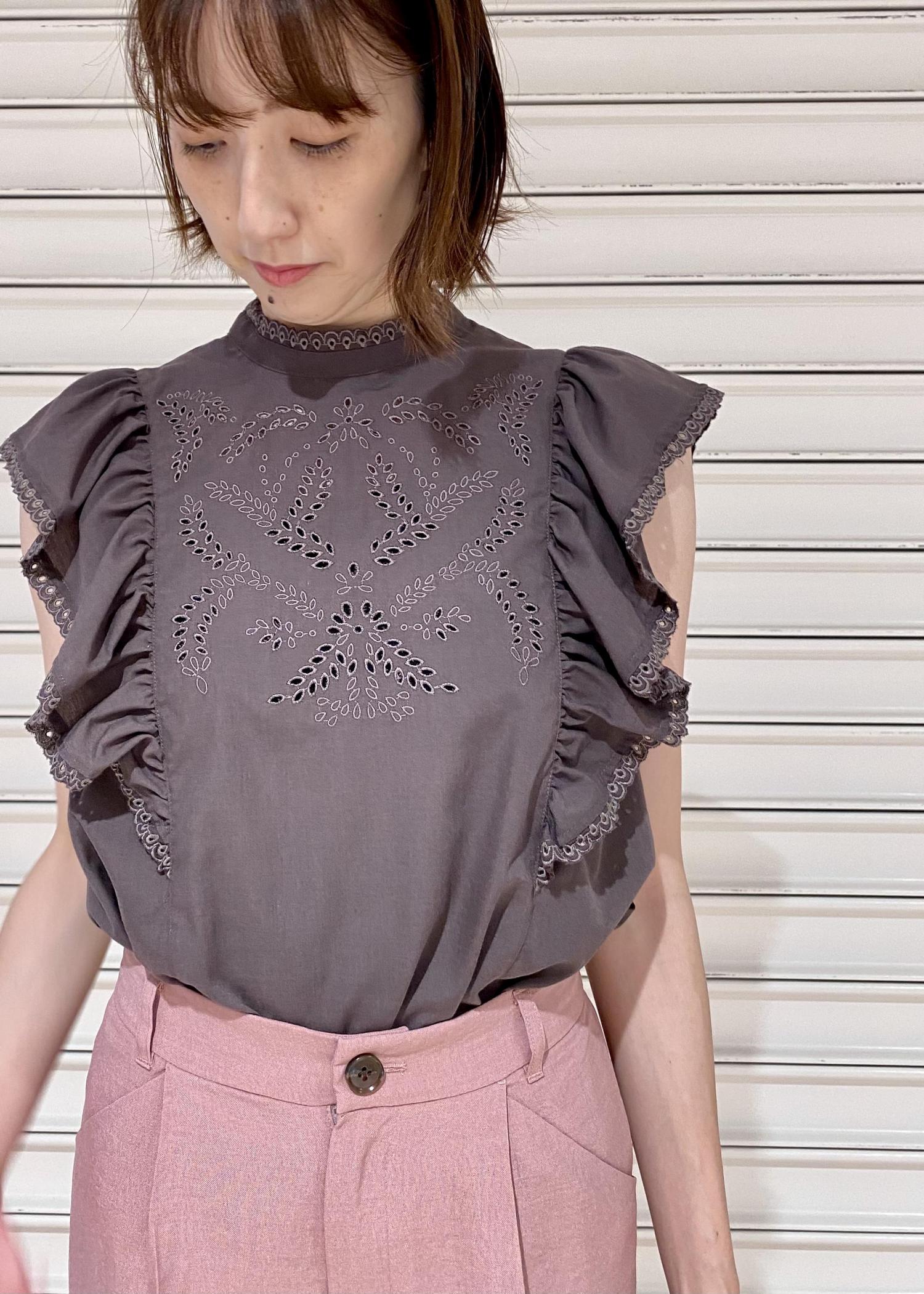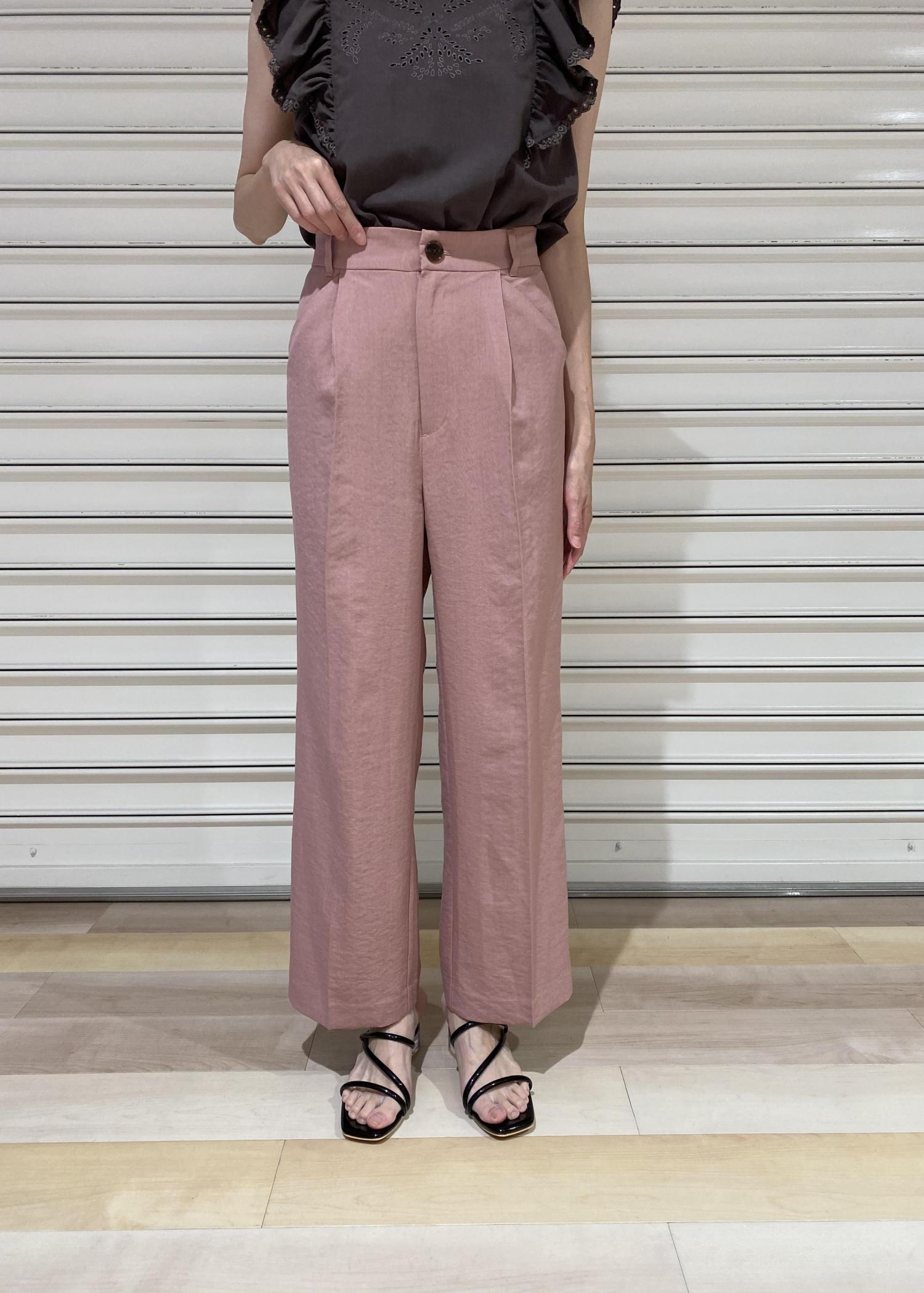 くすみピンクが可愛いワイドパンツにブラウンの刺繍ブラウスを合わせました。