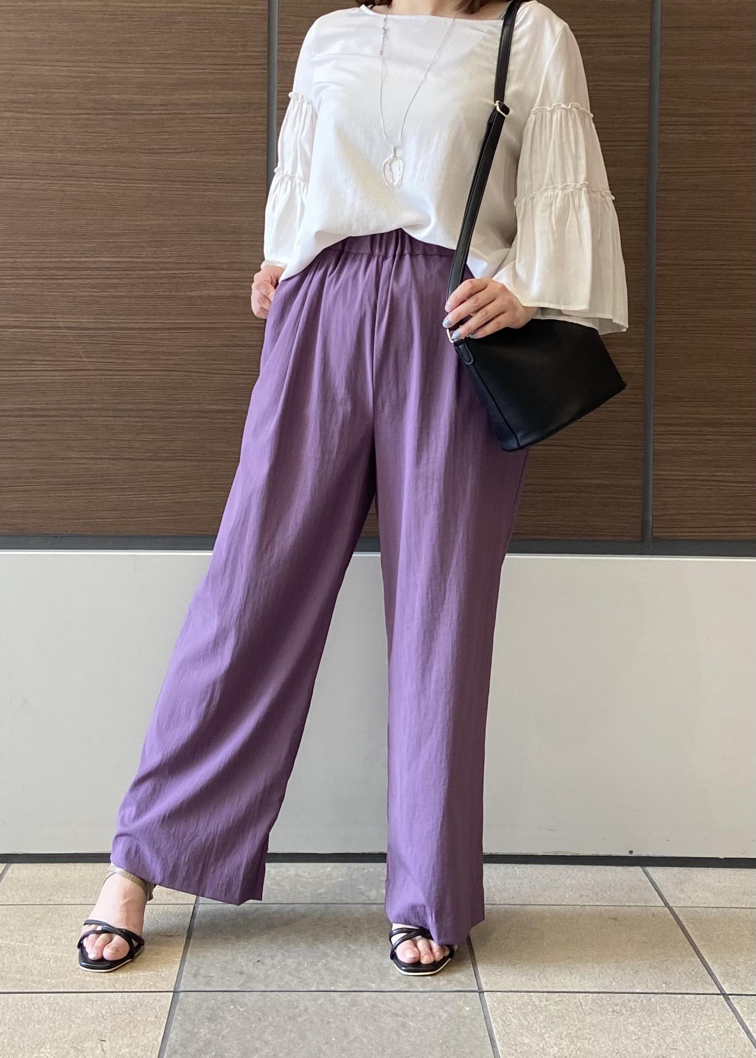 トレンドのカラーパンツにシアーブラウスを合わせて、上品なイメージのコーディネートにしてみました。