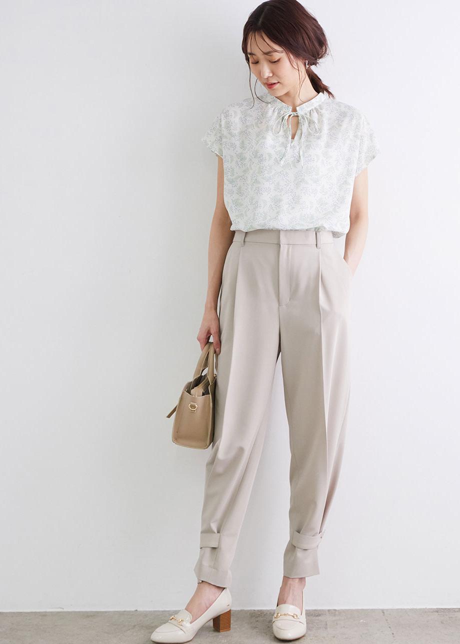 シアー感あるコンパクトブラウス×裾絞り可なパンツ