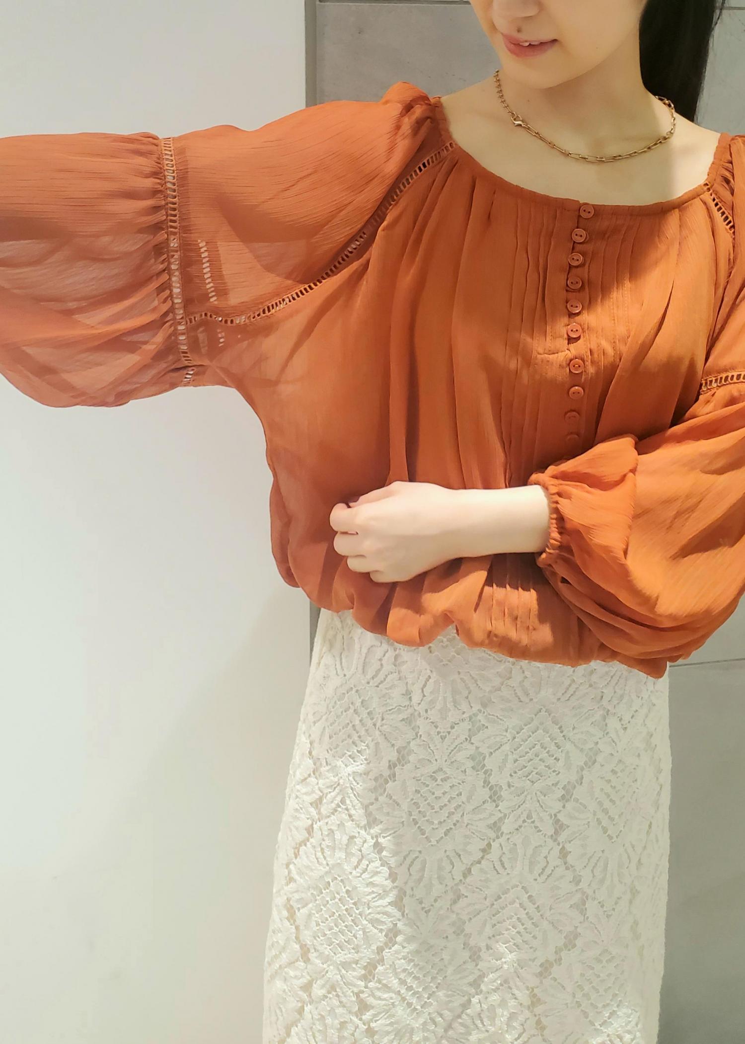 発色の良いオレンジですが、程よい透け感があるので夏でも重たい印象にならず着られます。