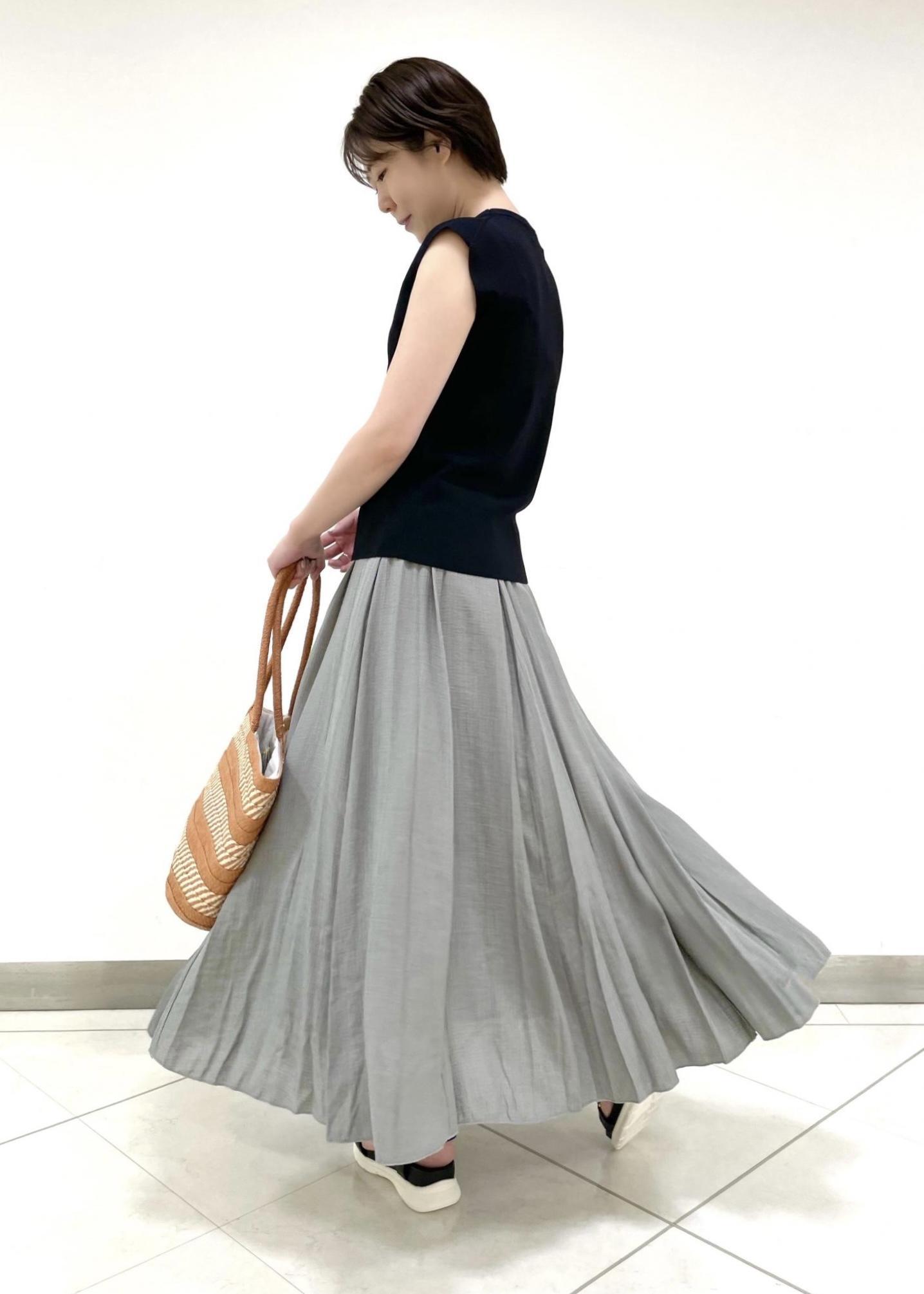 ボリュームのあるロングスカートをタイトなシルエットのトップスでボディラインを綺麗に見せてます
