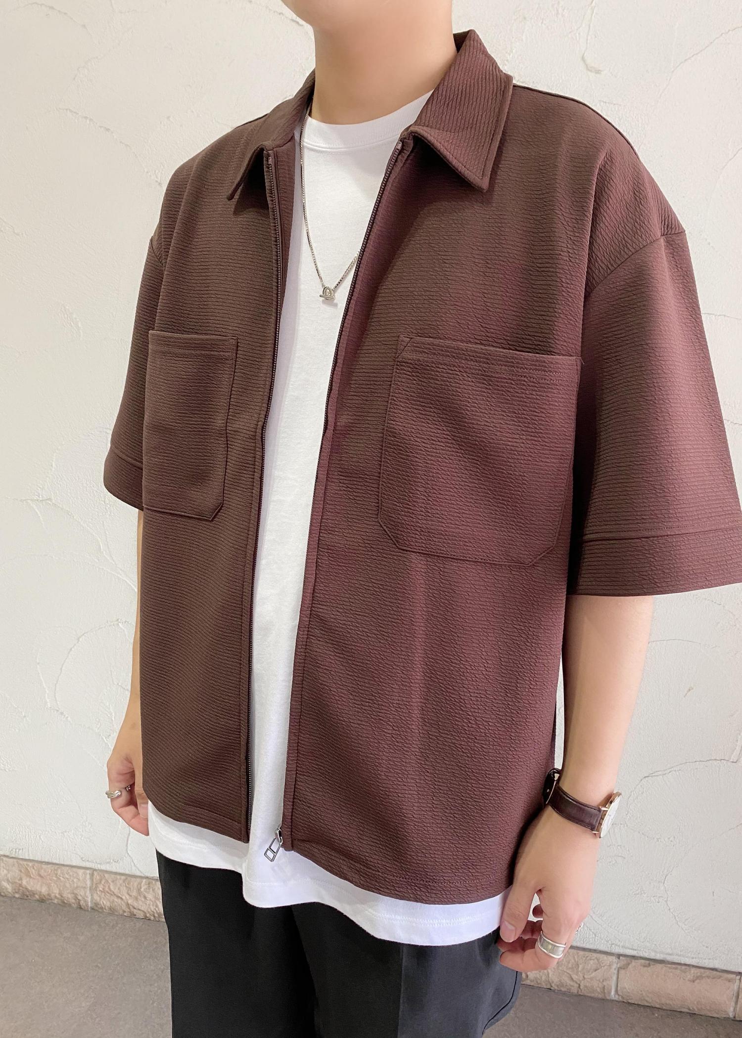 夏にも映える、赤みのあるブラウンカラーのブルゾンを使ったコーディネートです。