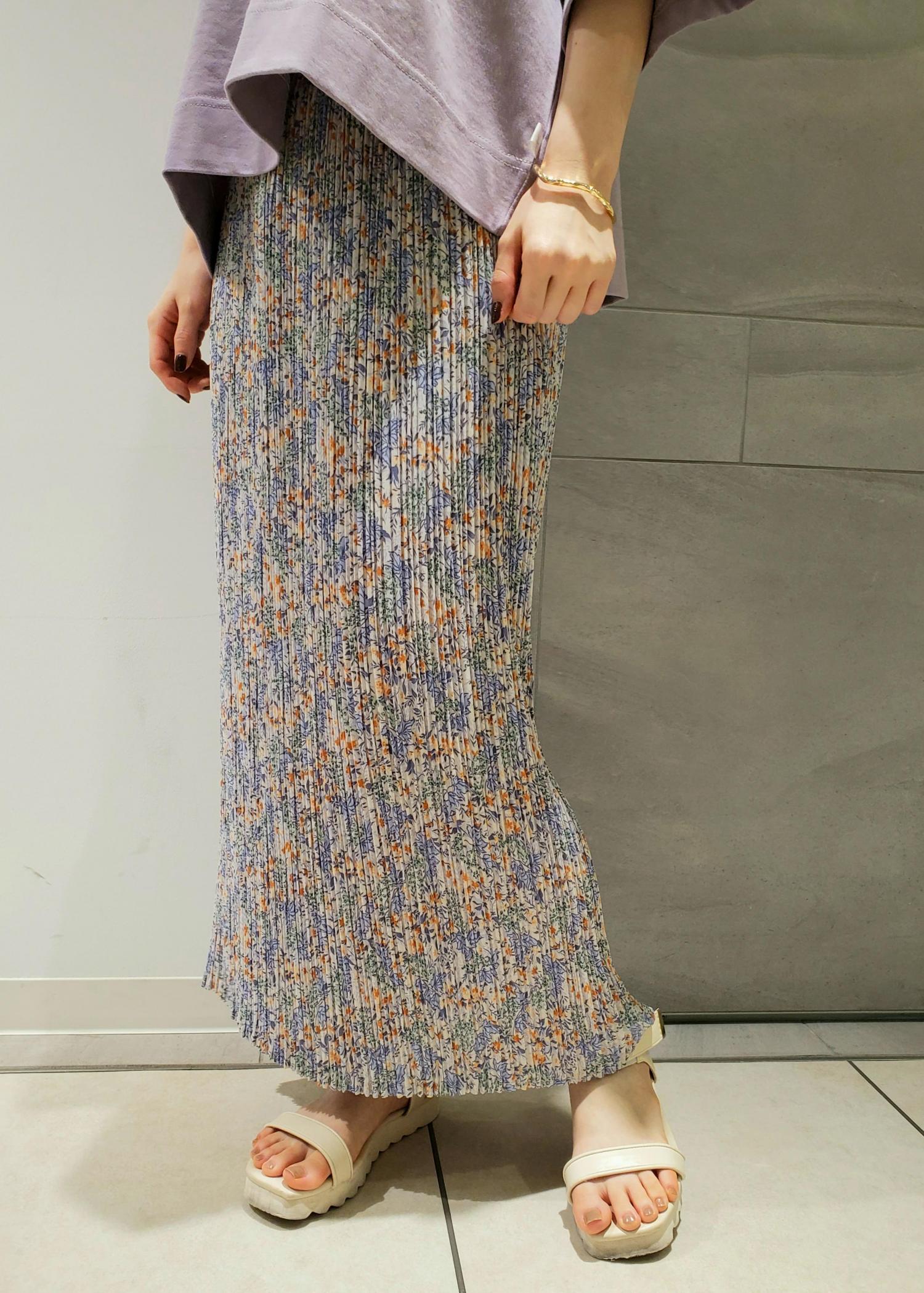 Tシャツとサンダルがスポーティーなアイテムなので、ボトムスはIラインスカートを合わせて甘めカジュアルにしてみました。