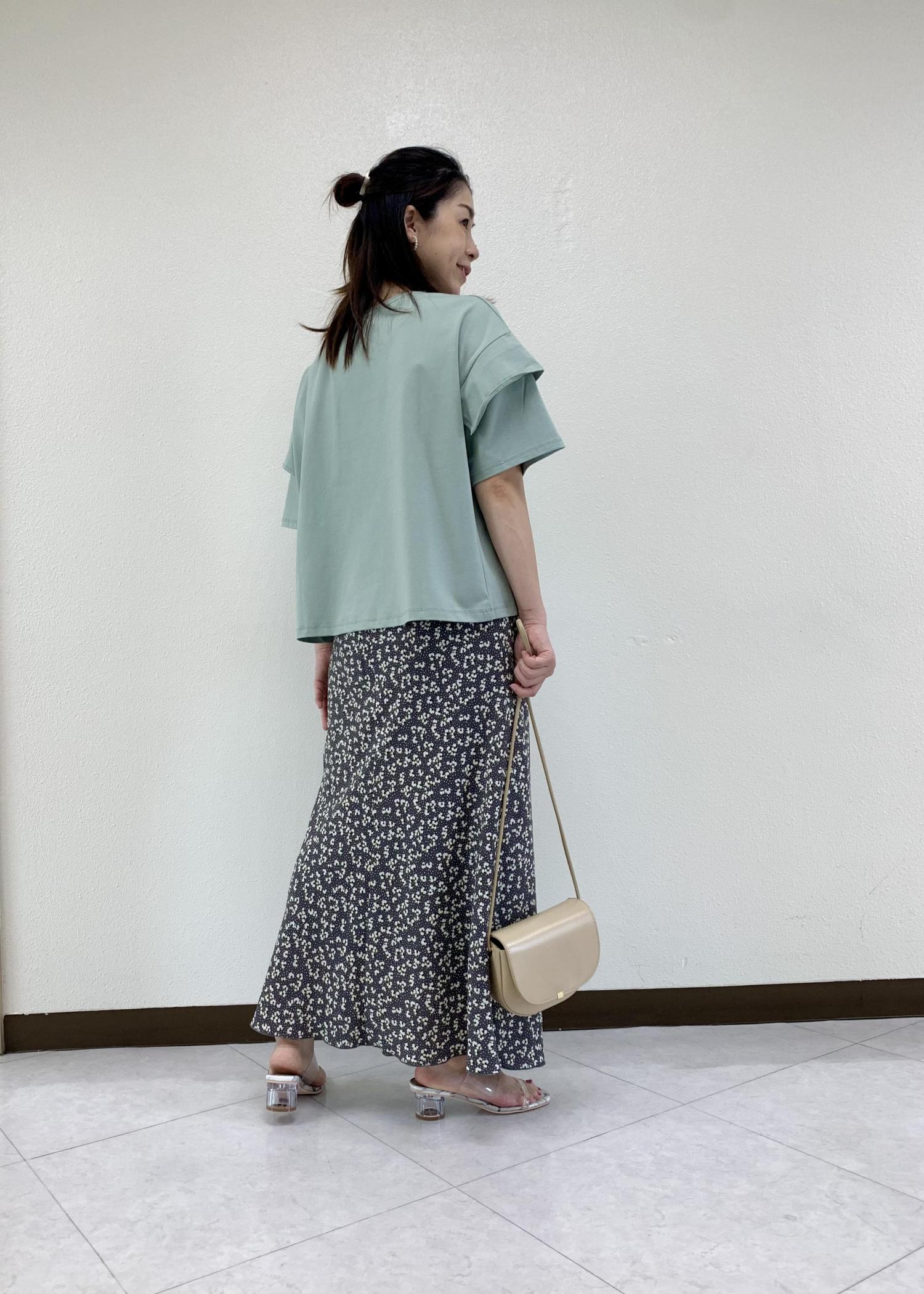 接触冷感、抗菌防臭と嬉しい機能が付いたトップスは今からの暑い季節におすすめです。涼しげなグリーンカラーのトップスに小花柄がかわいいマーメイドスカートを合わせました。