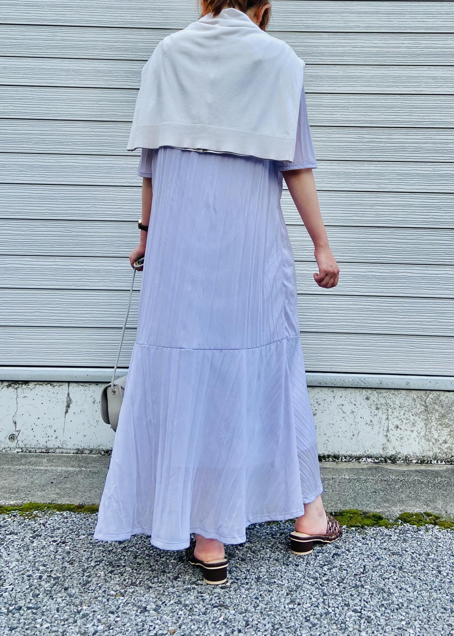 生地がシアーになっていてとても軽く、ワッシャー加工でナチュラルな風合いのあるワンピースです。シンプルになり過ぎないように、カーディガンを肩に掛けてコーデにアクセントをつけました。また、パンツと合わせたレイヤードスタイルもおすすめです!