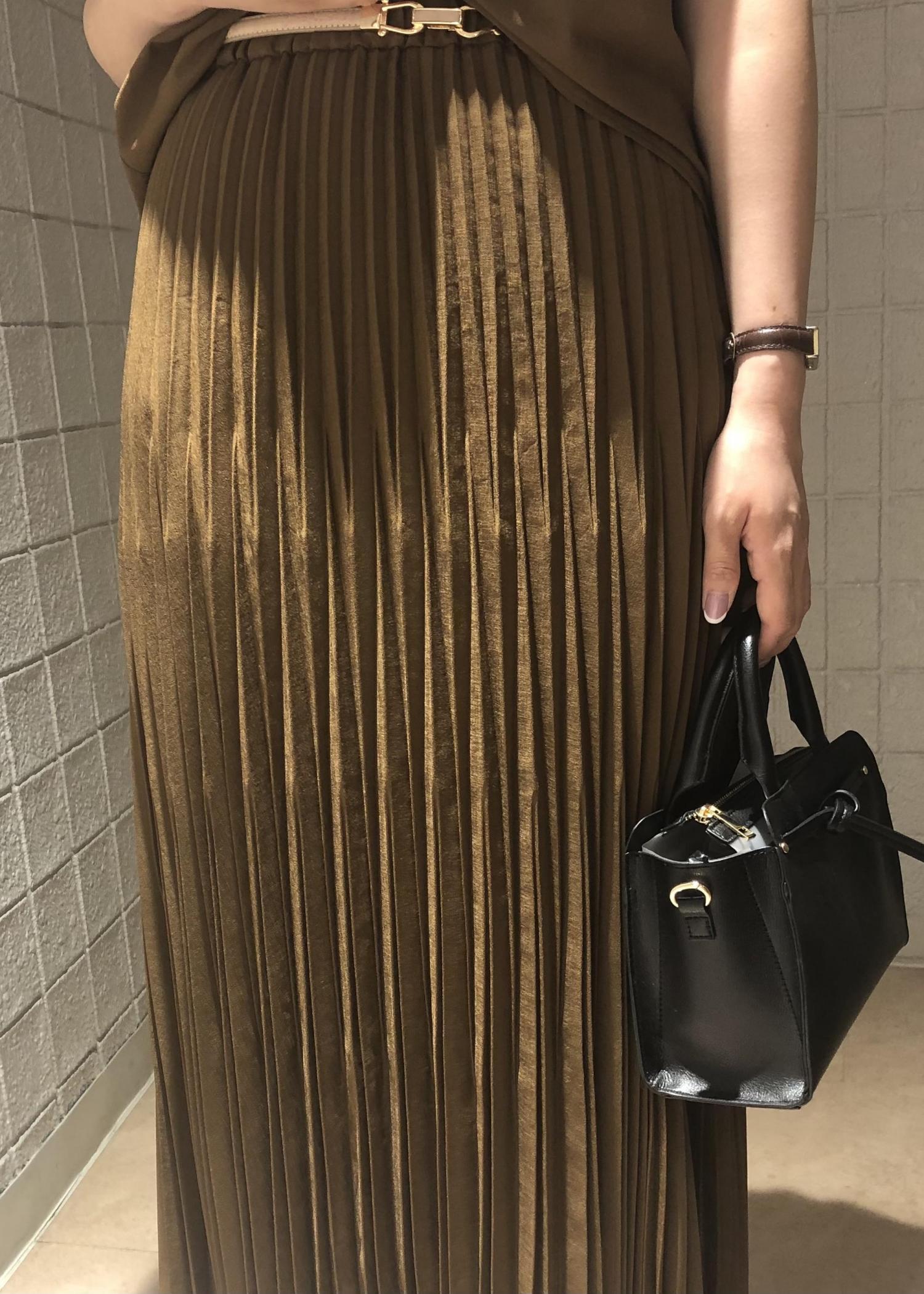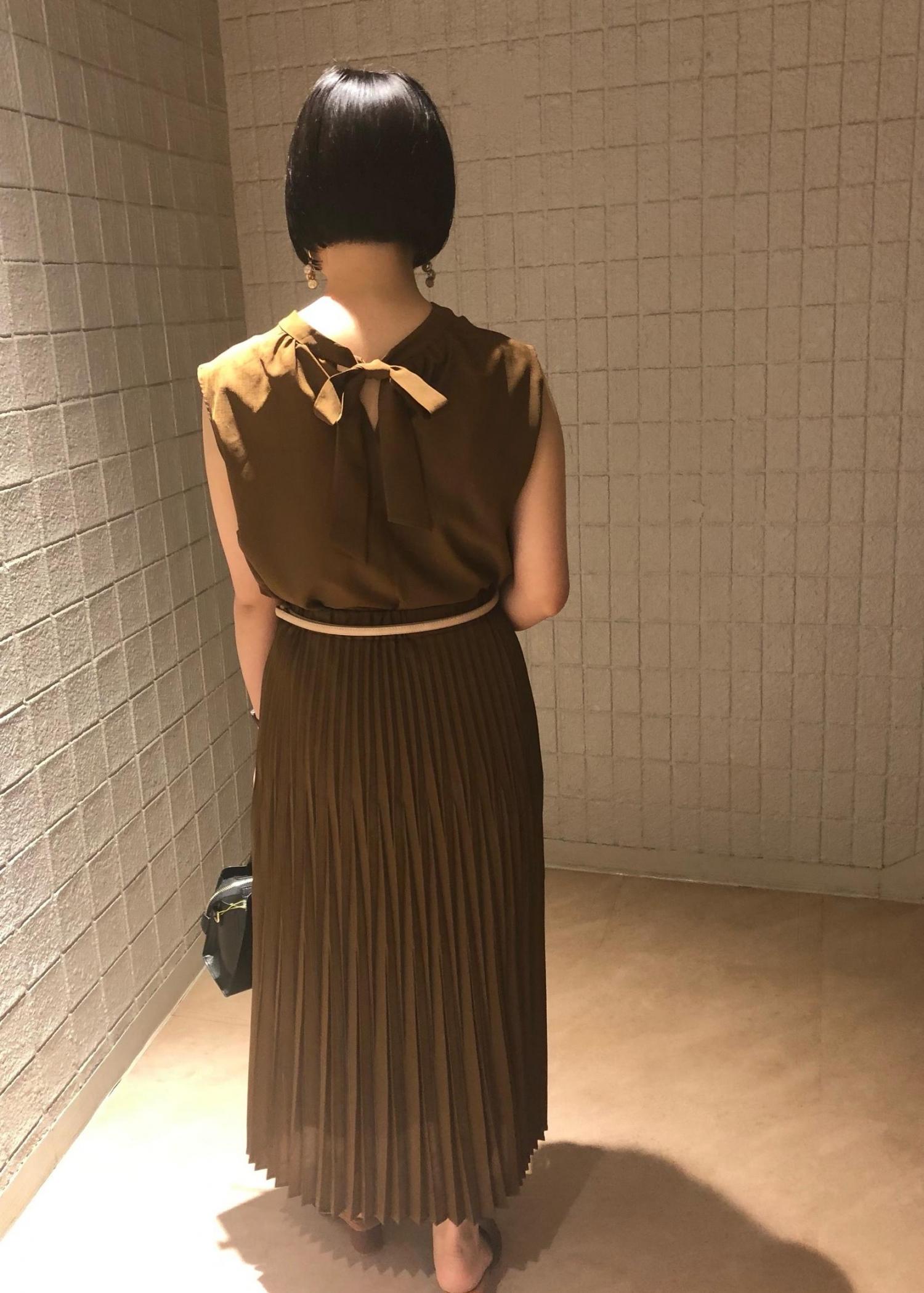 ブラウスは前後2WAYなので、表情の違いを楽しんで頂けます。また、プリーツスカートは縦のラインを綺麗に見せてくれるので、スタイルUPにも繋がります。