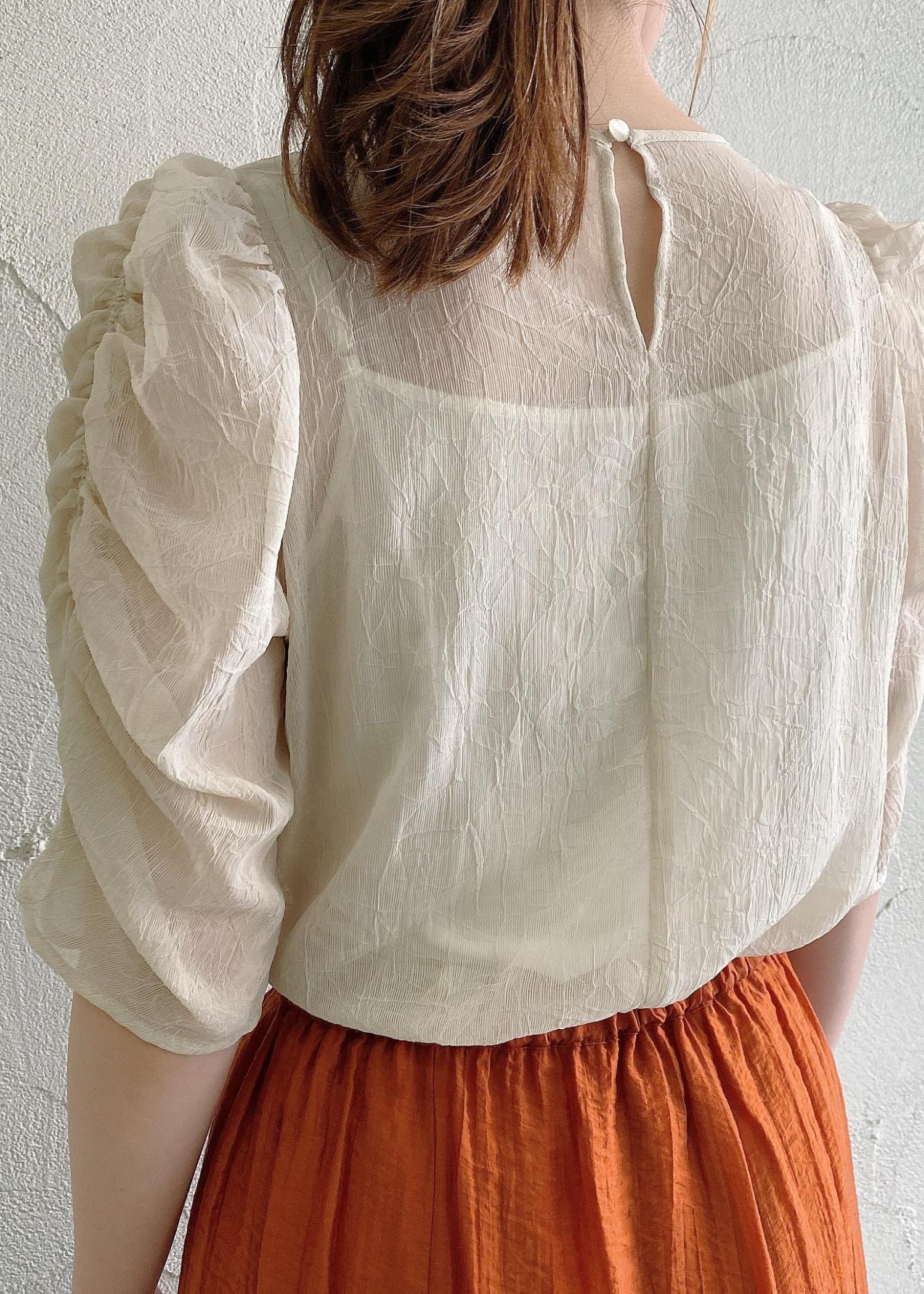 シアーのトップスにオレンジが魅力のロングスカートと合わせて、夏らしいコーディネートにしました。