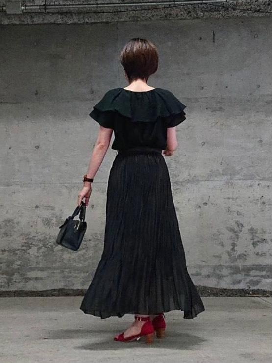 甘めのデザインのブラウスなので、ボトムのトーンを揃えることで甘すぎないシックなスタイルにしました。
