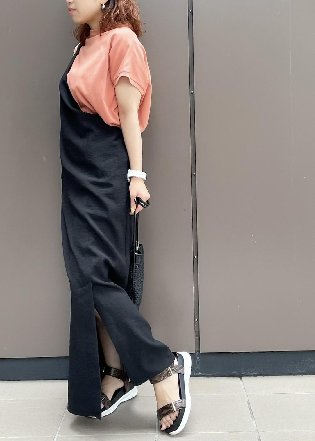ジャンスカは細ストラップを付けてお召し頂く事も出来、Iラインシルエットが子供っぽくならないデザインなのでラフにtシャツ一枚で素敵コーデが完成しますよ♪
