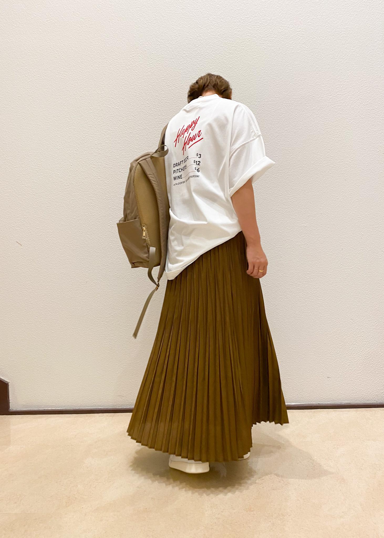 ユニセックスのオーバーサイズのトップスに柔らかなプリーツスカートを合わせてみました。