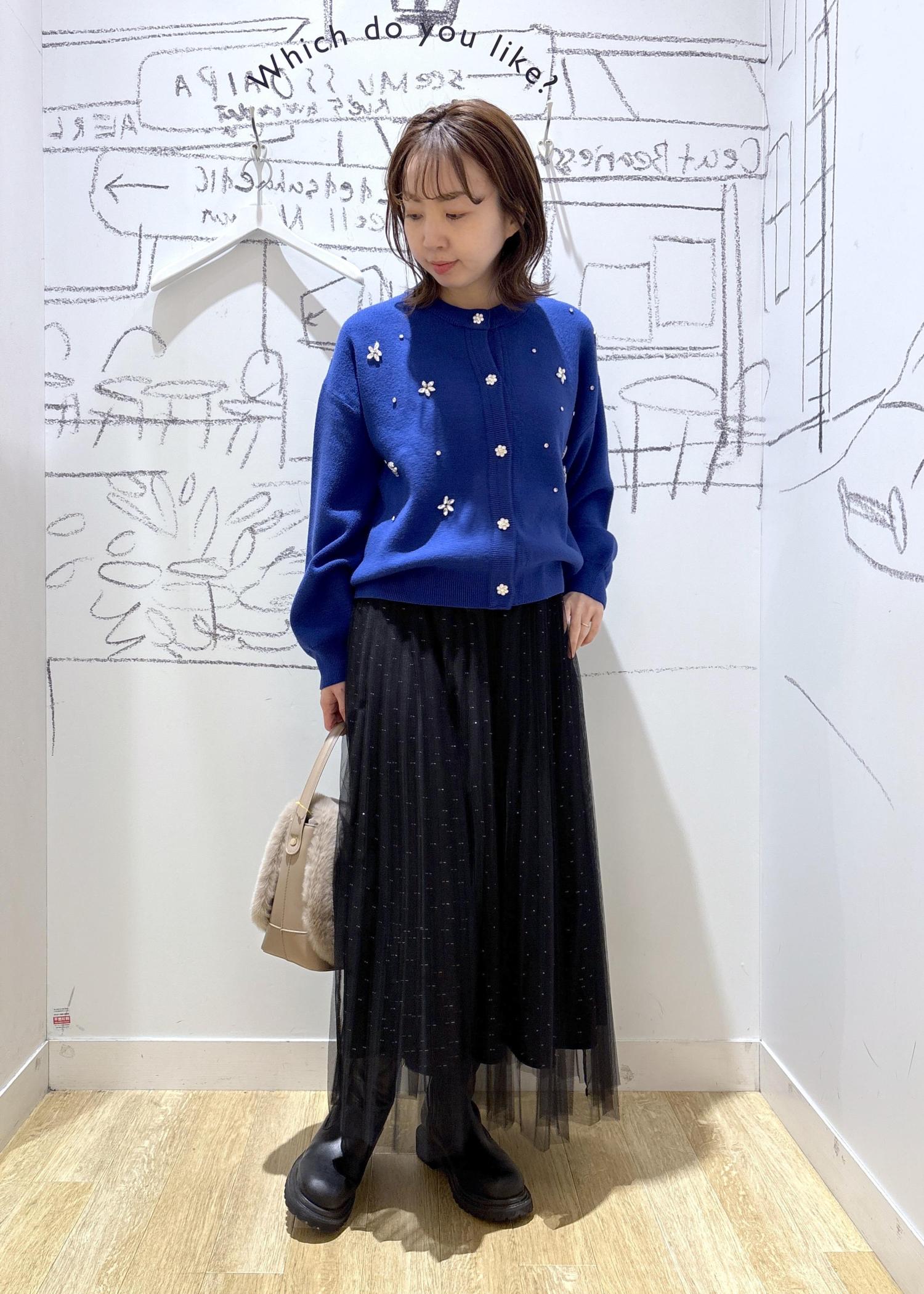 マーメイドシルエットのキャミワンピースに、袖ギャザーブラウスを合わせ、女性らしい印象に。マスタードカラーにカゴバックで夏らしさを引きたてます。