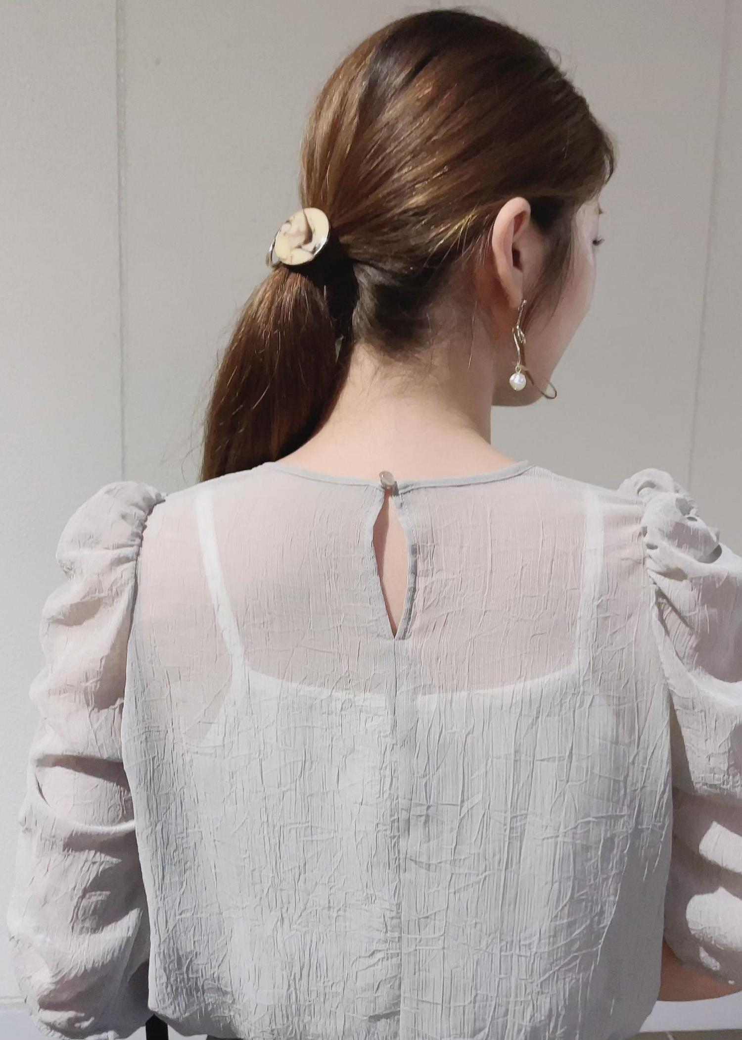 ブラウスは袖ギャザーでキレイめなので、スカートは大きめポケットのカジュアルスカートに◎