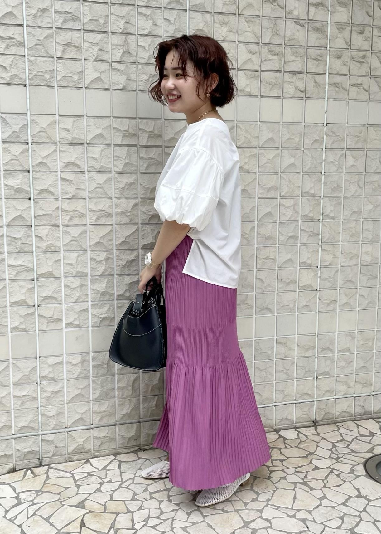 柔らかいニット素材のスカートにハリ感のあるブラウスを合わせてみました!