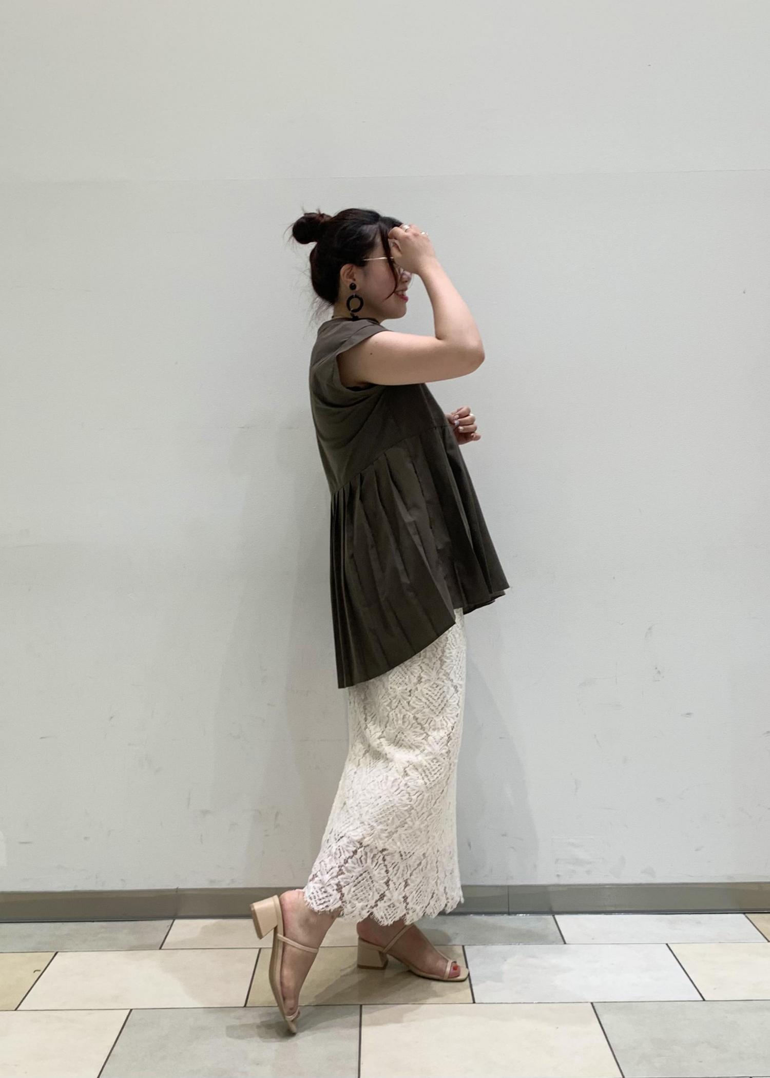 大きめのプリーツが印象的なブラウスと女性らしい印象のレーススカートのコーディネート☺︎