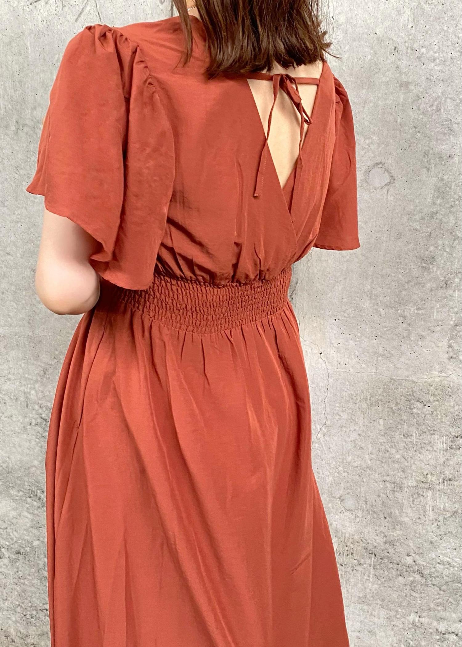 温かみのあるレンガ色のワンピースにパキッとメリハリをつけたホワイトのきれいめパンツを合わせ、大人らしさのあるコーディネートにしてみました!