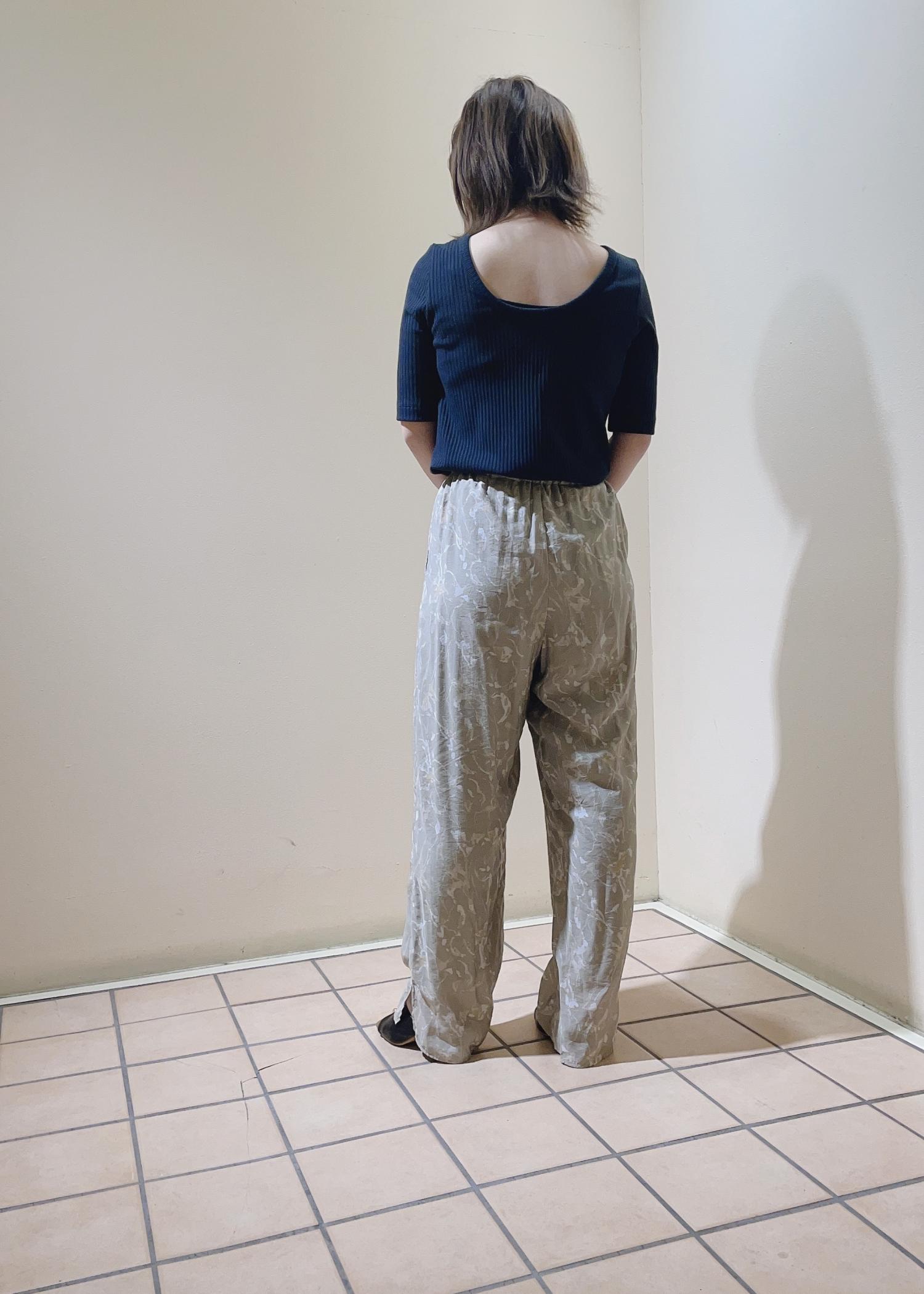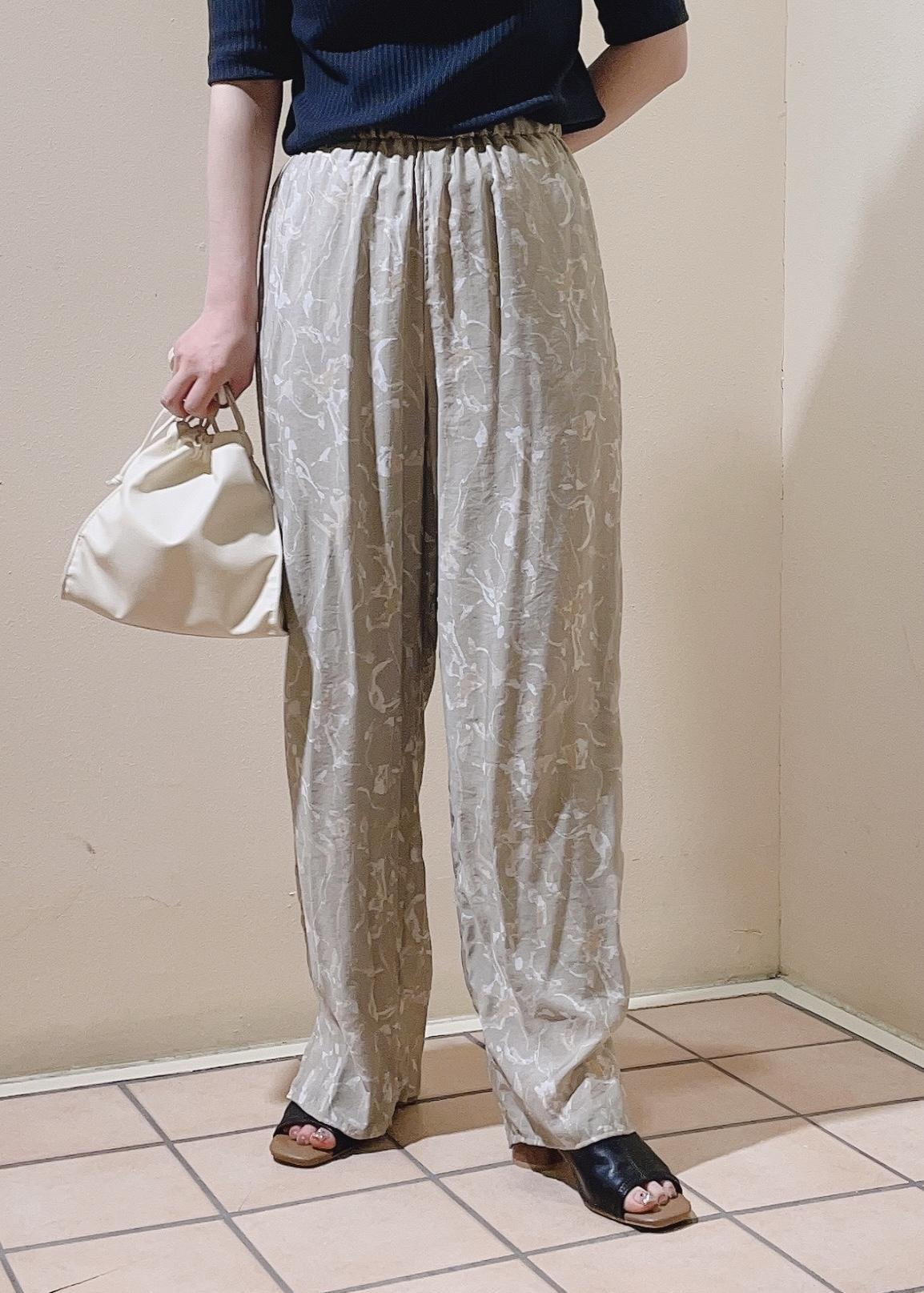 柔らかい色合いの柄パンツなので、あえて