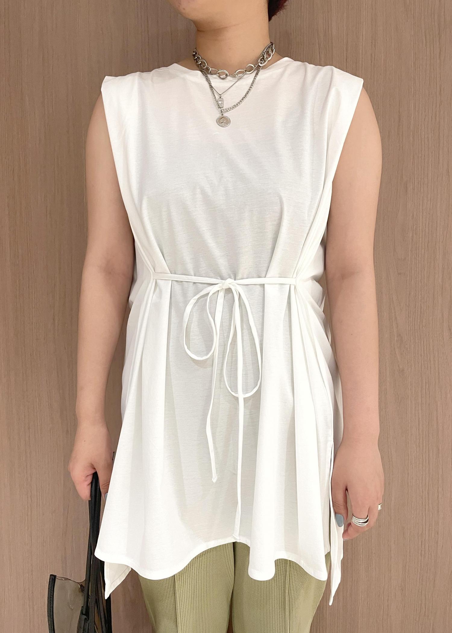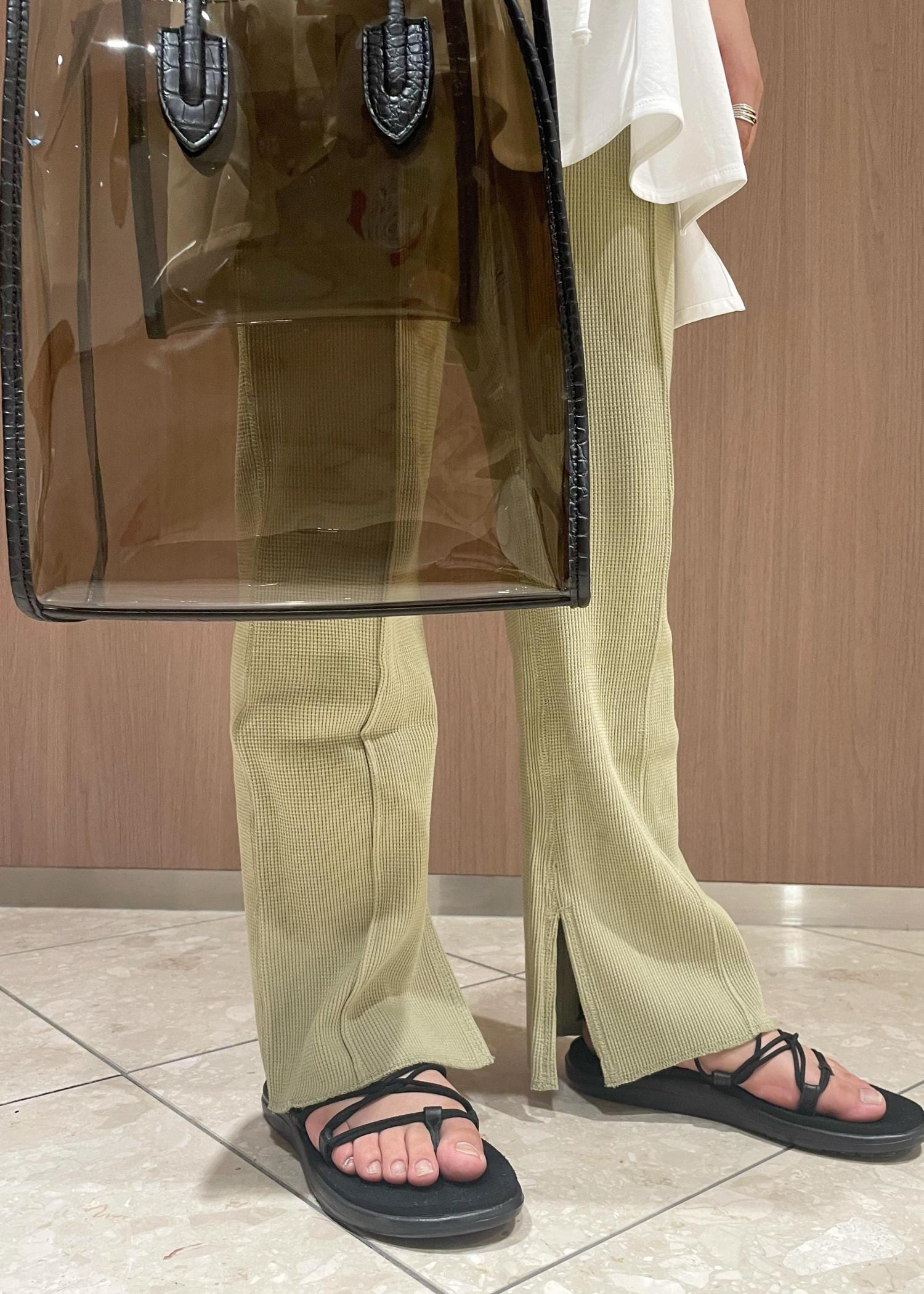 白×グリーンで涼しげな印象にして、爽やかなコーディネートにしました。締め色に黒を持ってくることで、全体のメリハリを意識しました。重い印象にならないように、クリア素材のバッグにしたのがポイントです。