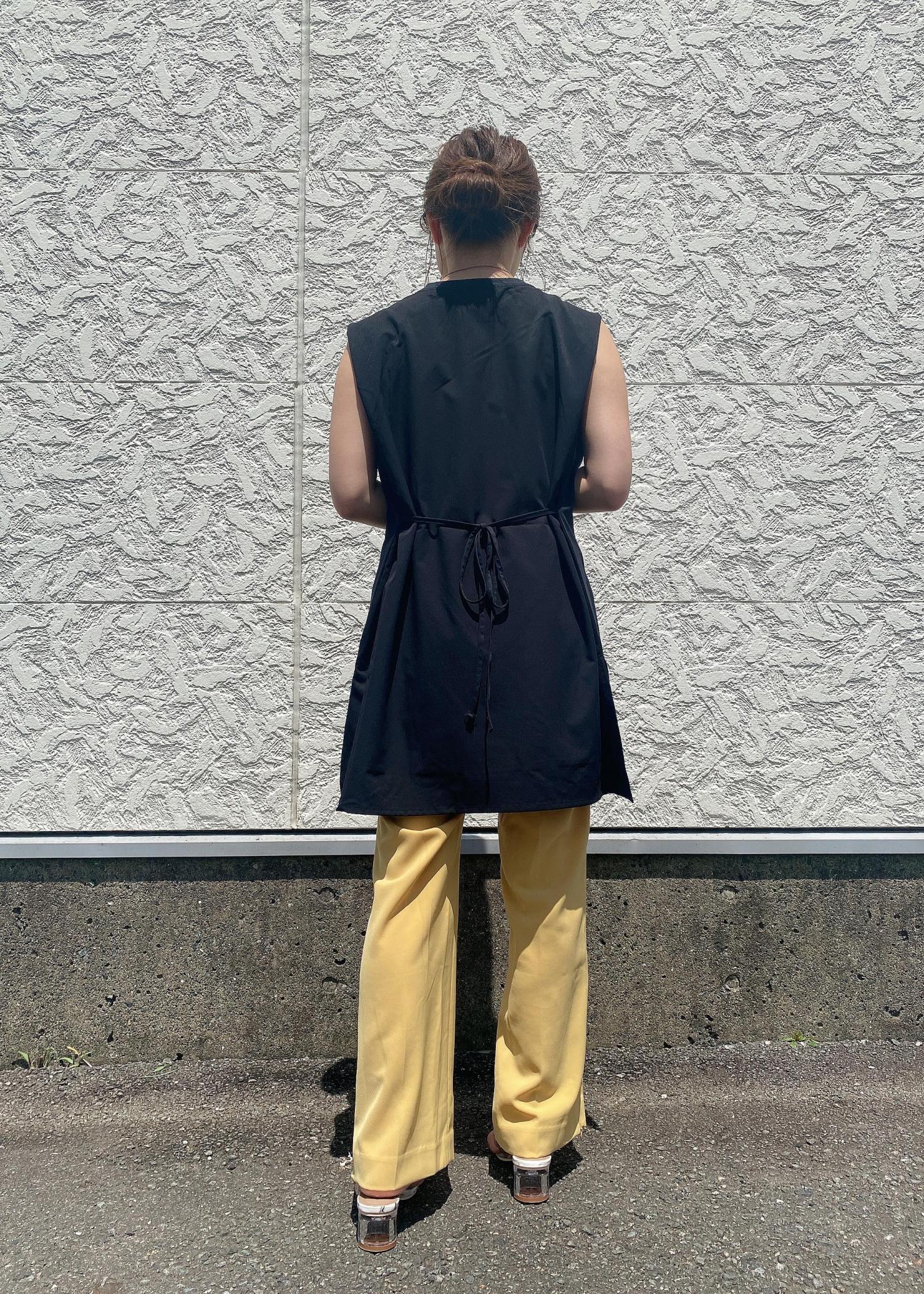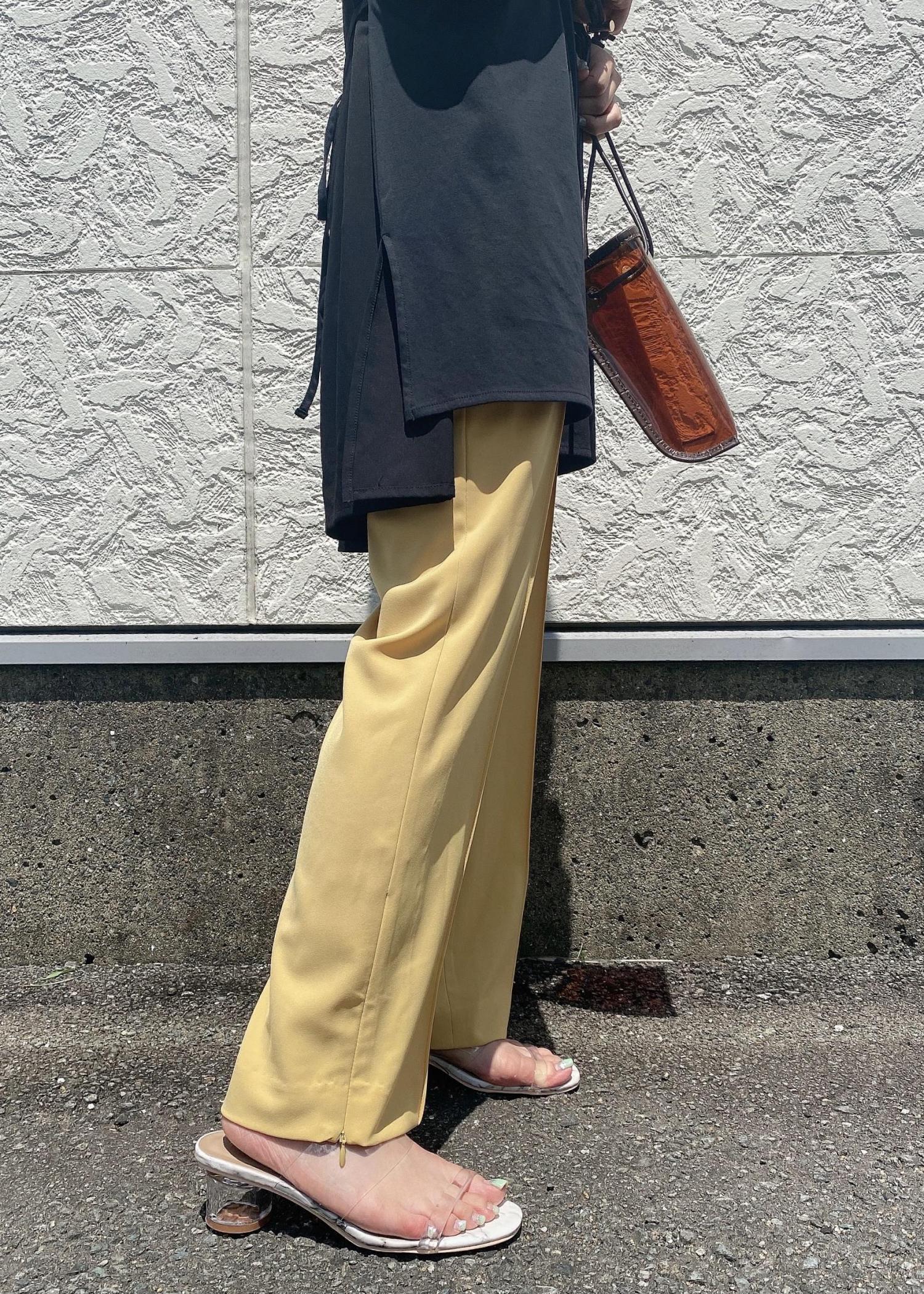 ブラックのトップスにイエローのパンツを合わせて大人かっこいいスタイリングに。バックやサンダルはクリアで夏らしい印象にしてみました。